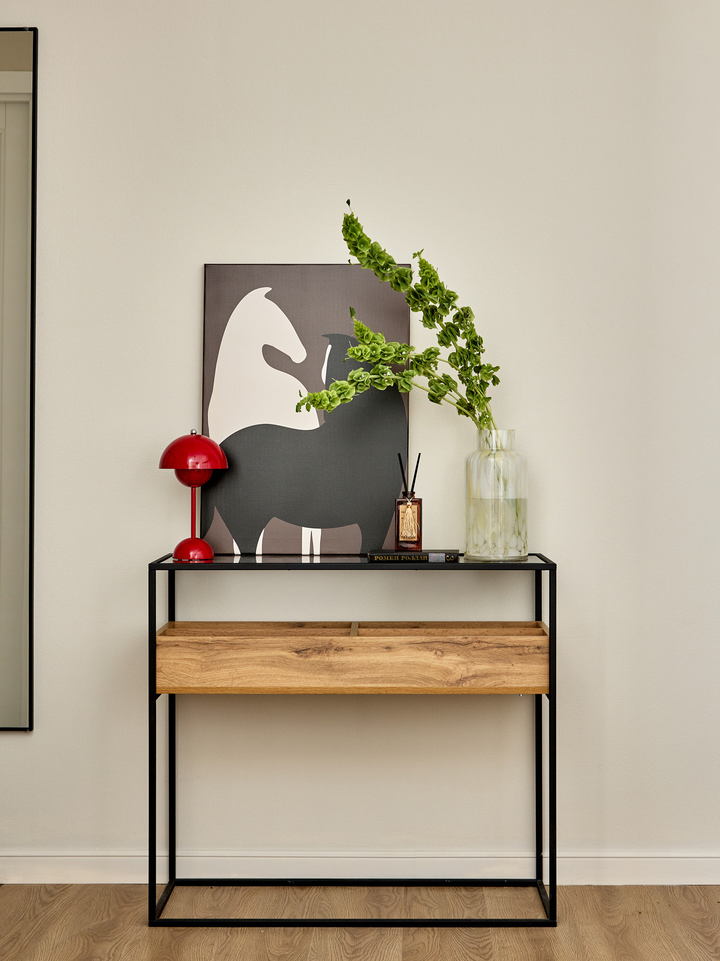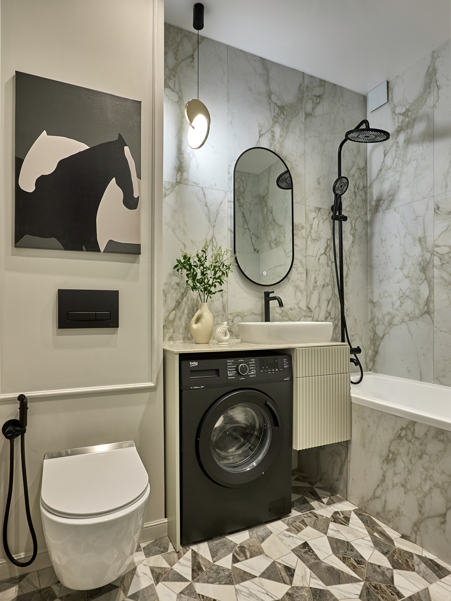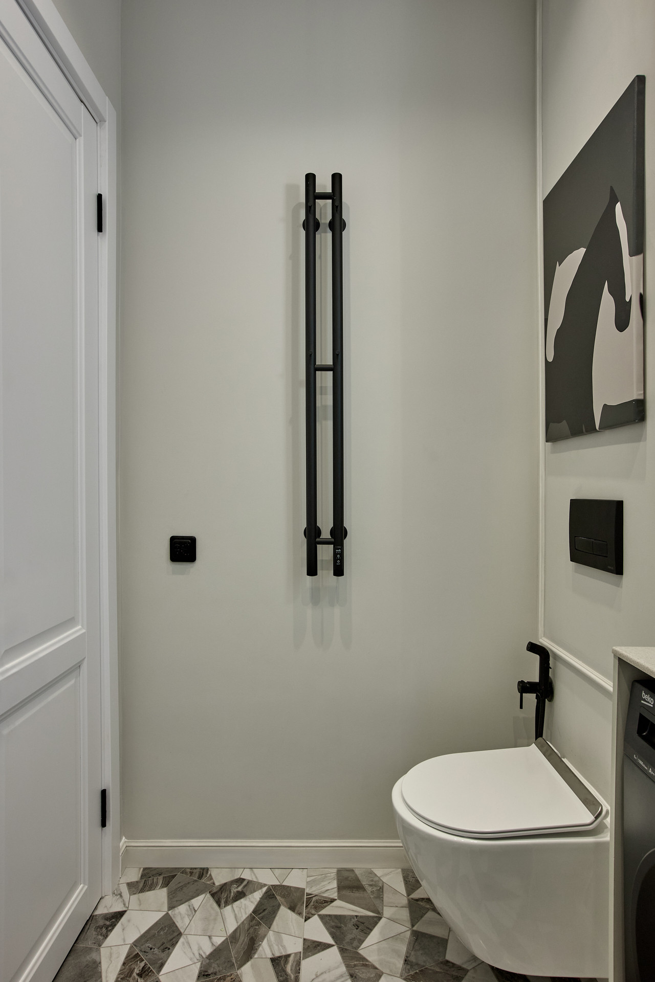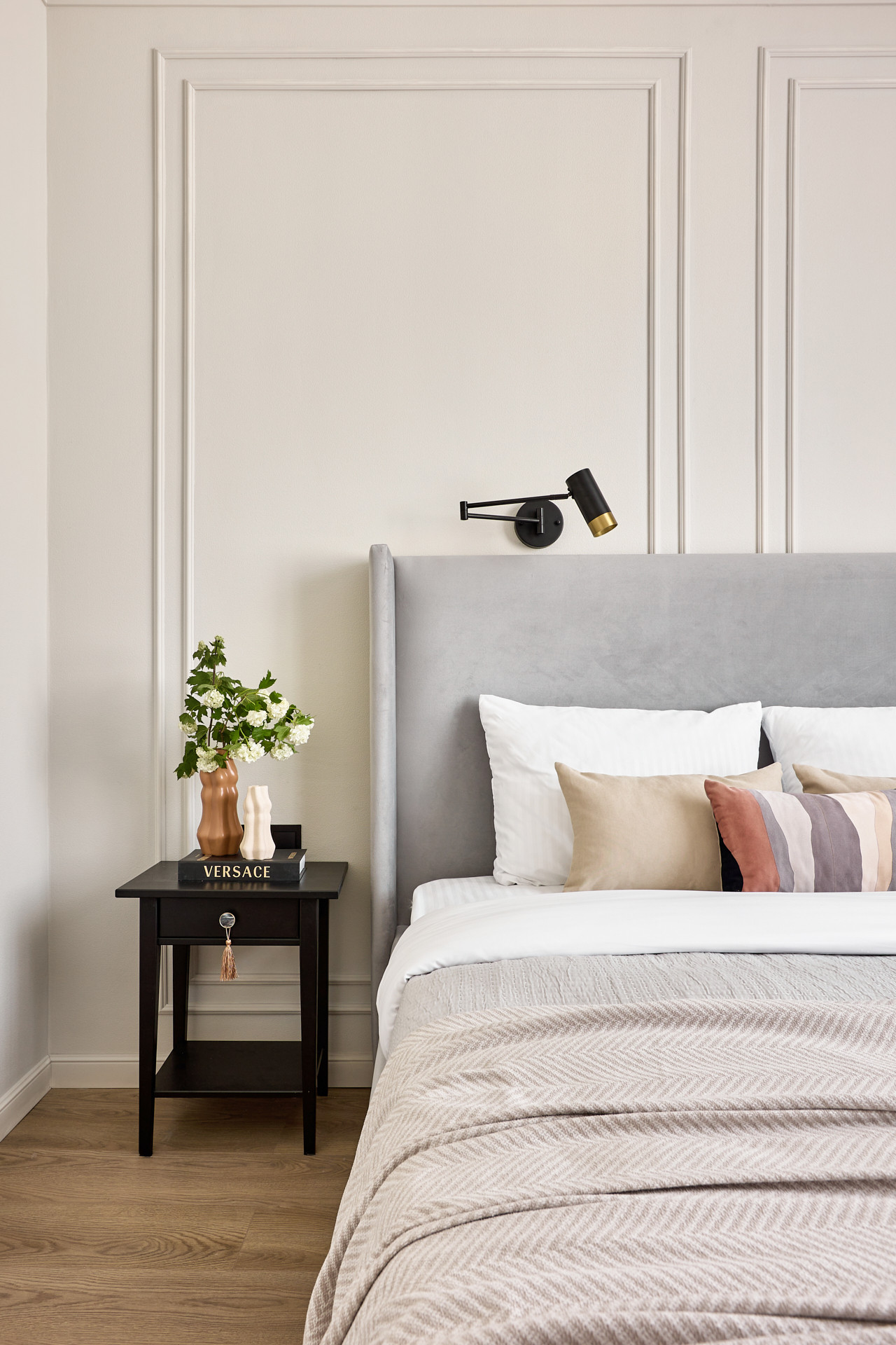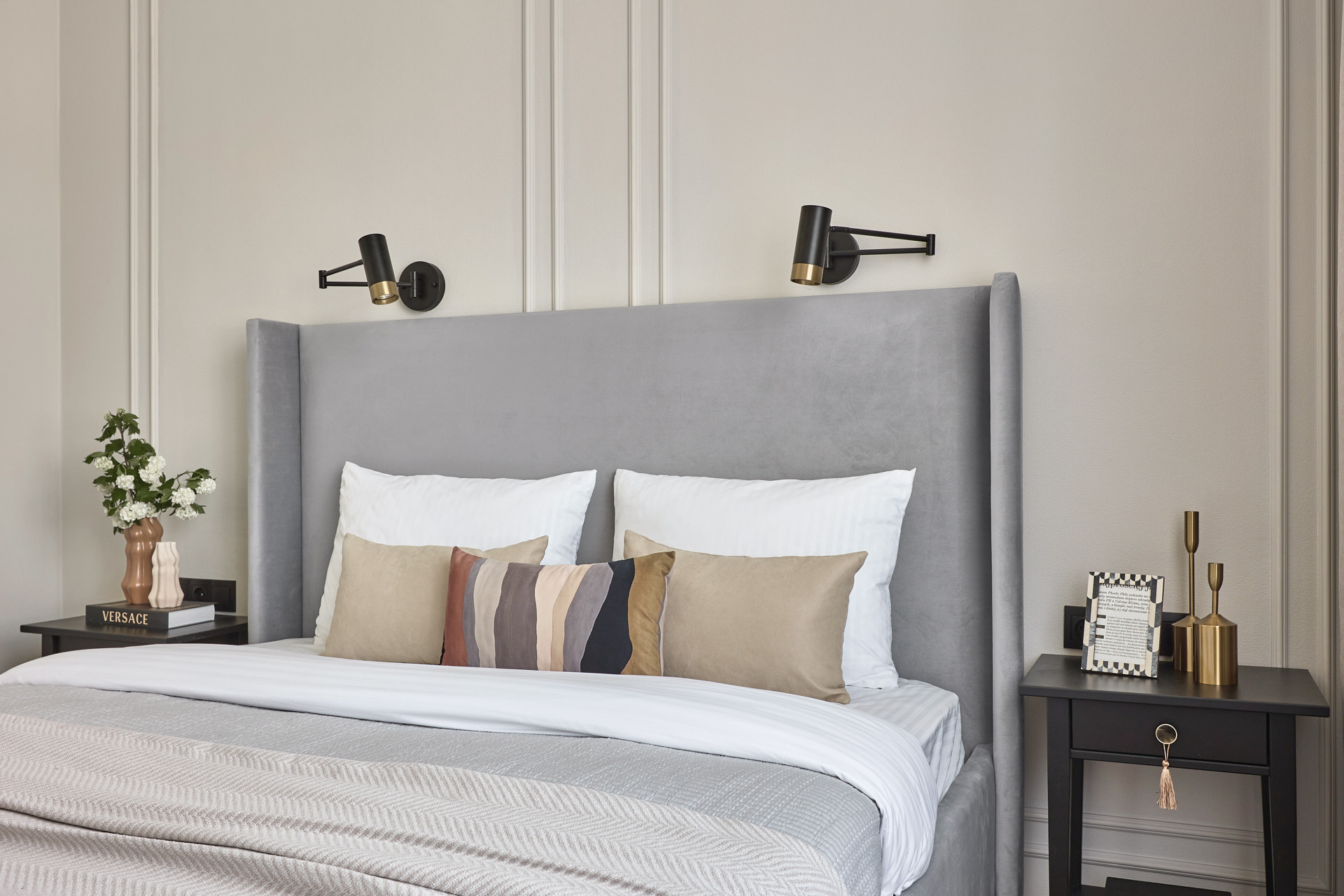 Кровать с высоким мягким изголовьем оборудована подъемным механизмом, позволяющим с удобством использовать место под кроватью в качестве дополнительной зоны хранения. Гардеробная позволит свободно разместить одежду и обувь, а также выделить хозяйственную зону для пылесоса, гладильной доски, чемоданов и других крупногабаритных предметов.