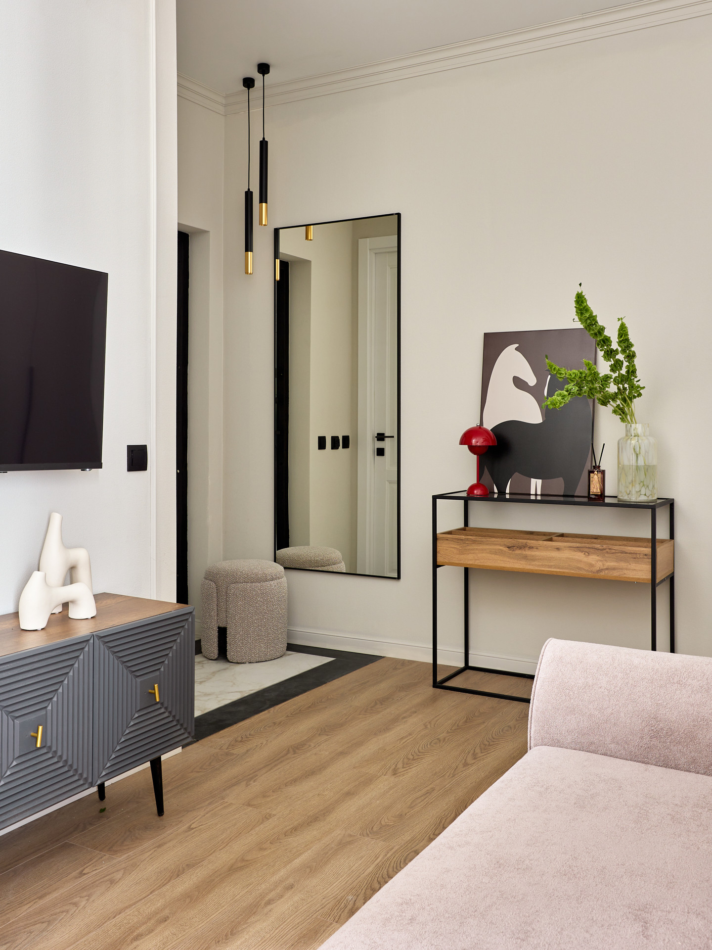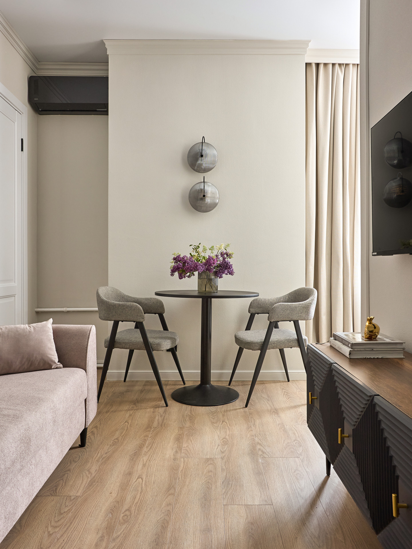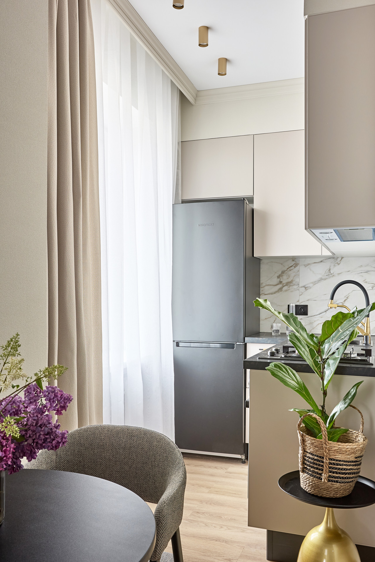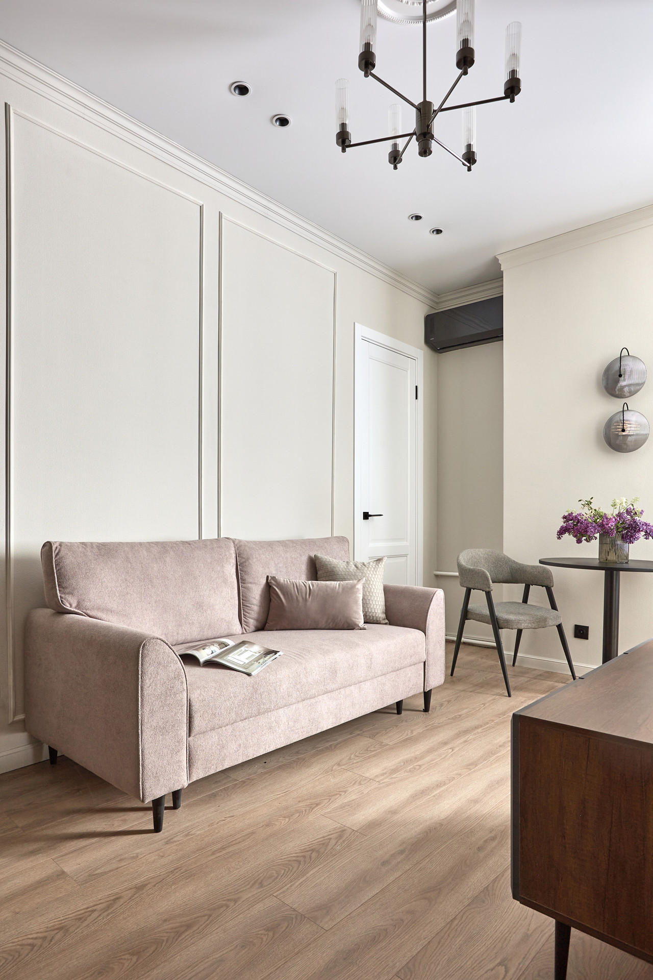 Элегантный и утонченный дизайн создает комфортную расслабленную атмосферу в каждом уголке квартиры. В интерьере использованы гармоничные пастельные оттенки в сочетании с лаконичными формами, современными фактурами и материалами.