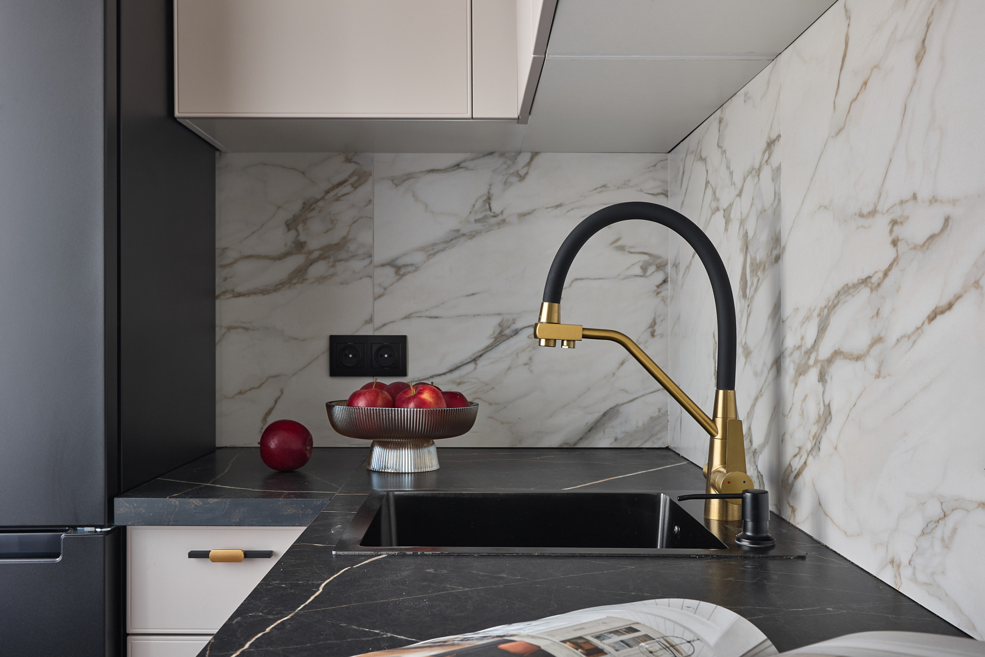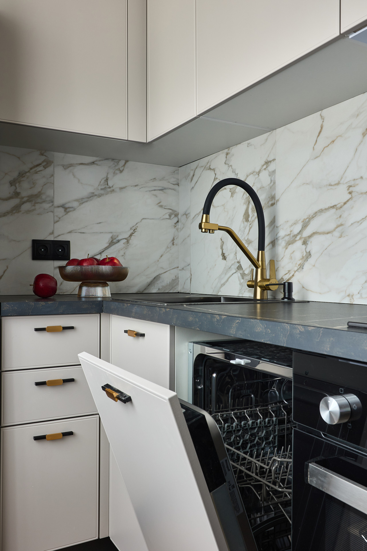 Кухня с великолепной обеденной группой, укомплектована посудомоечной машиной, холодильником, вытяжкой с рециркуляцией воздуха, газовой варочной панелью и электрическим духовым шкафом.
