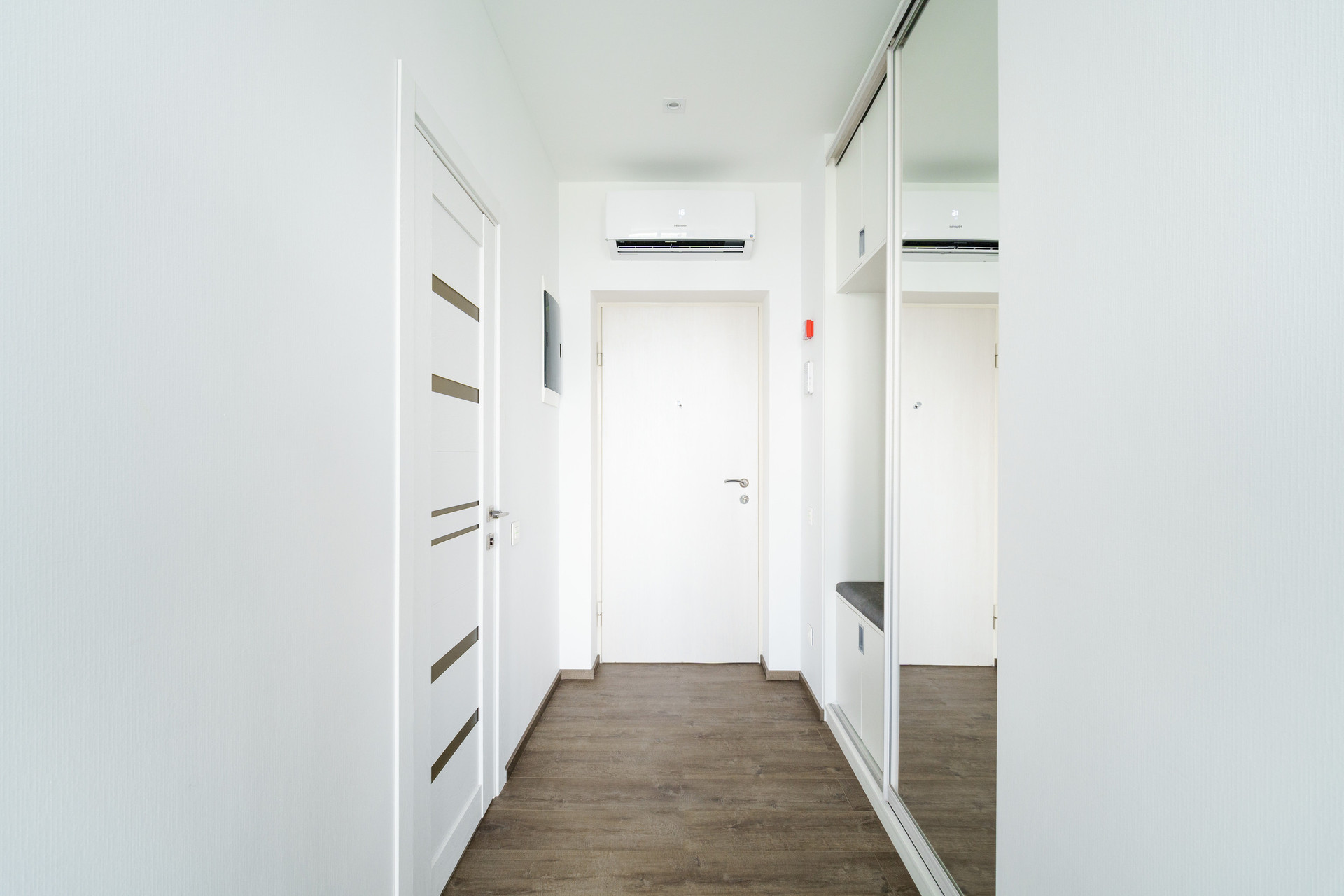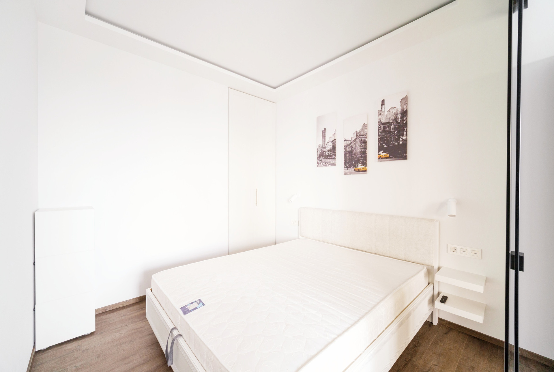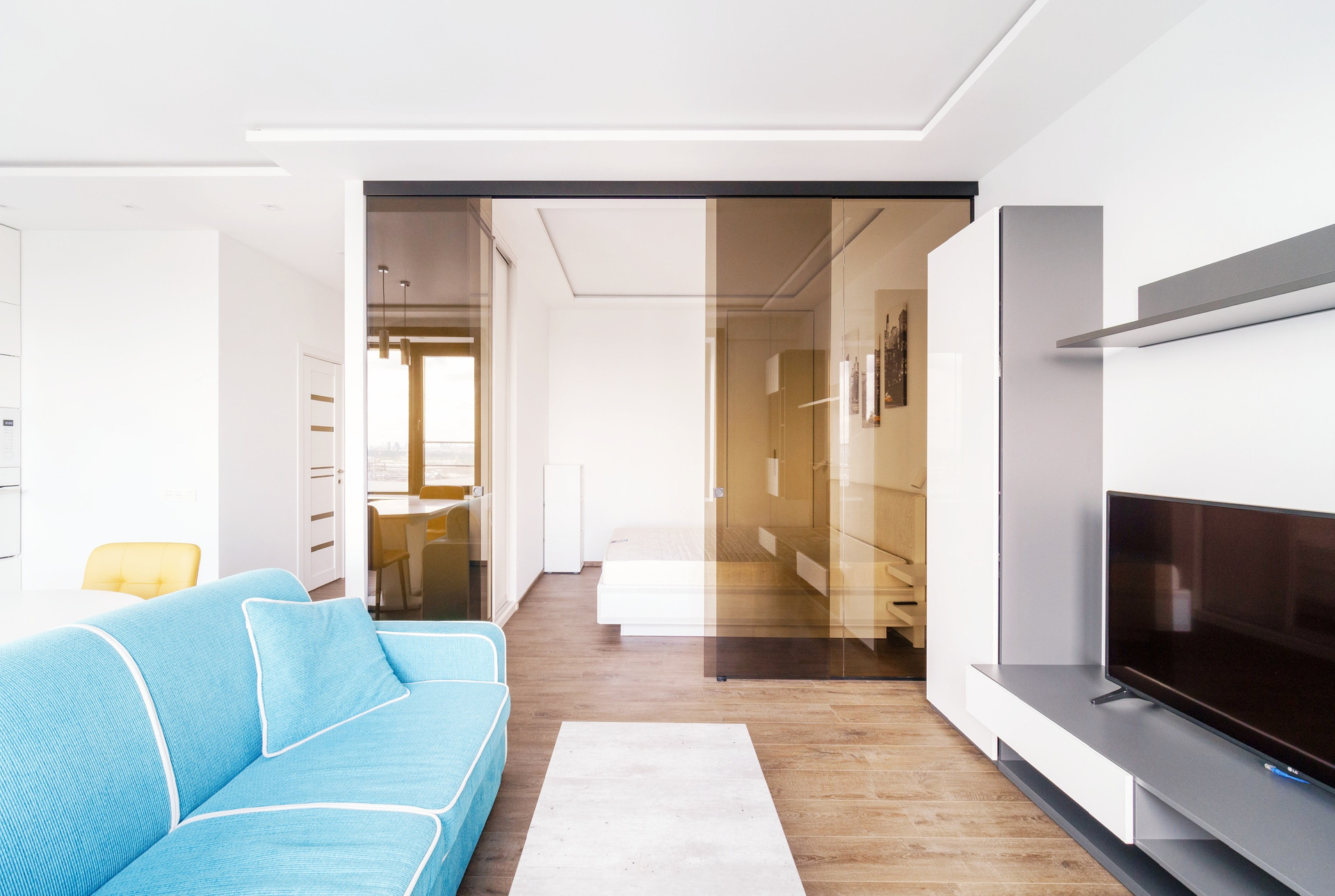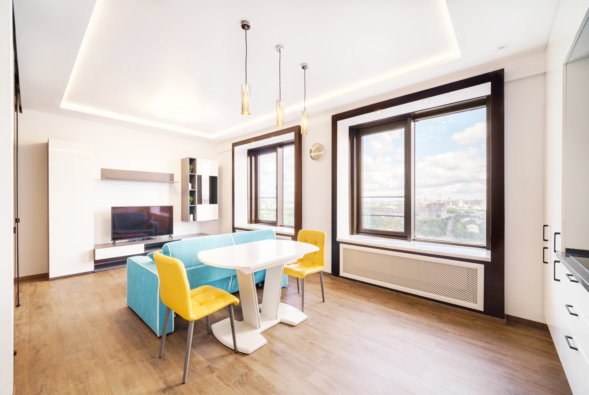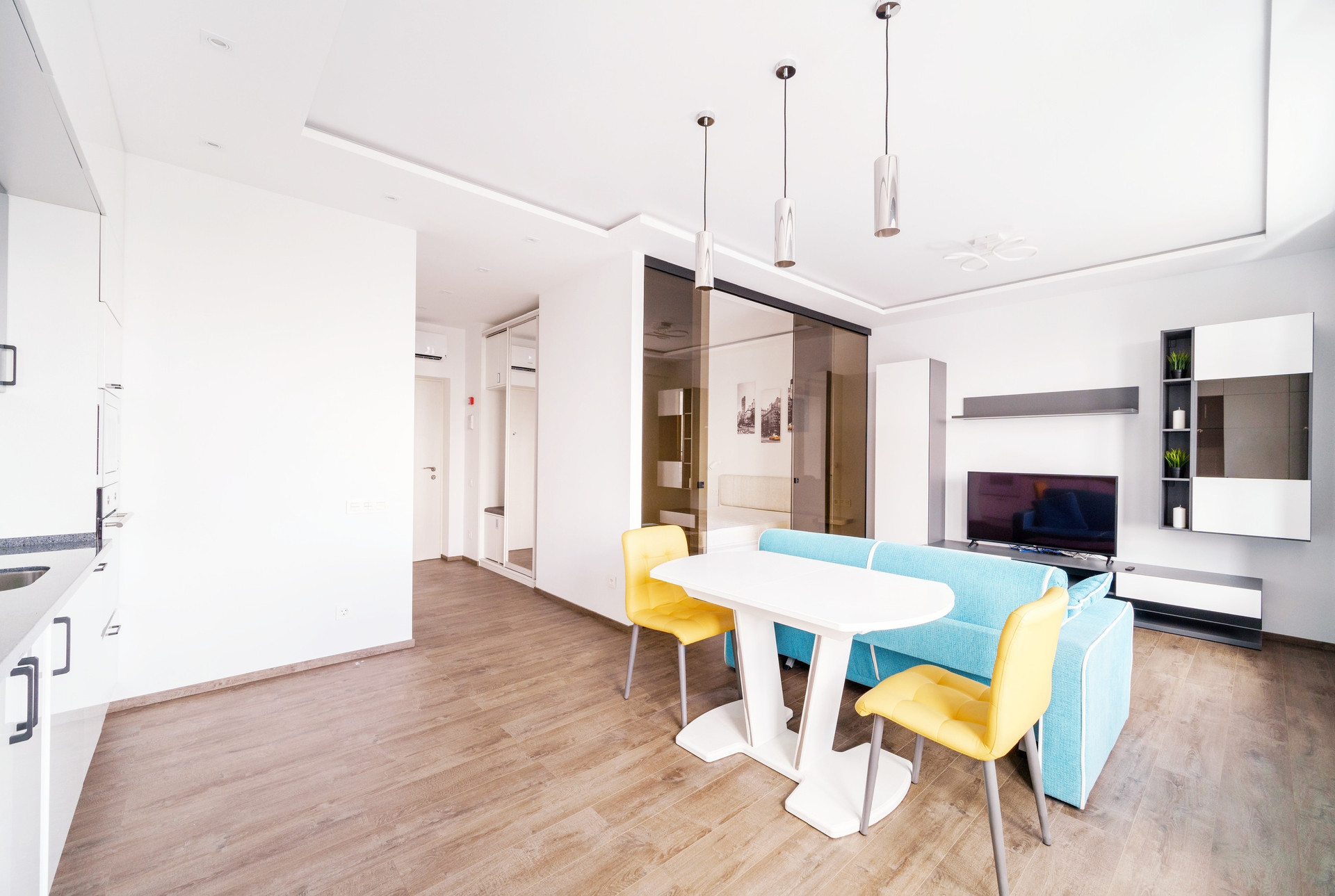 Мебель: двуспальная кровать с подъемным механизмом, три встроенных шкафа, раскладной диван, раскладной кухонный стол, стулья и т.д.