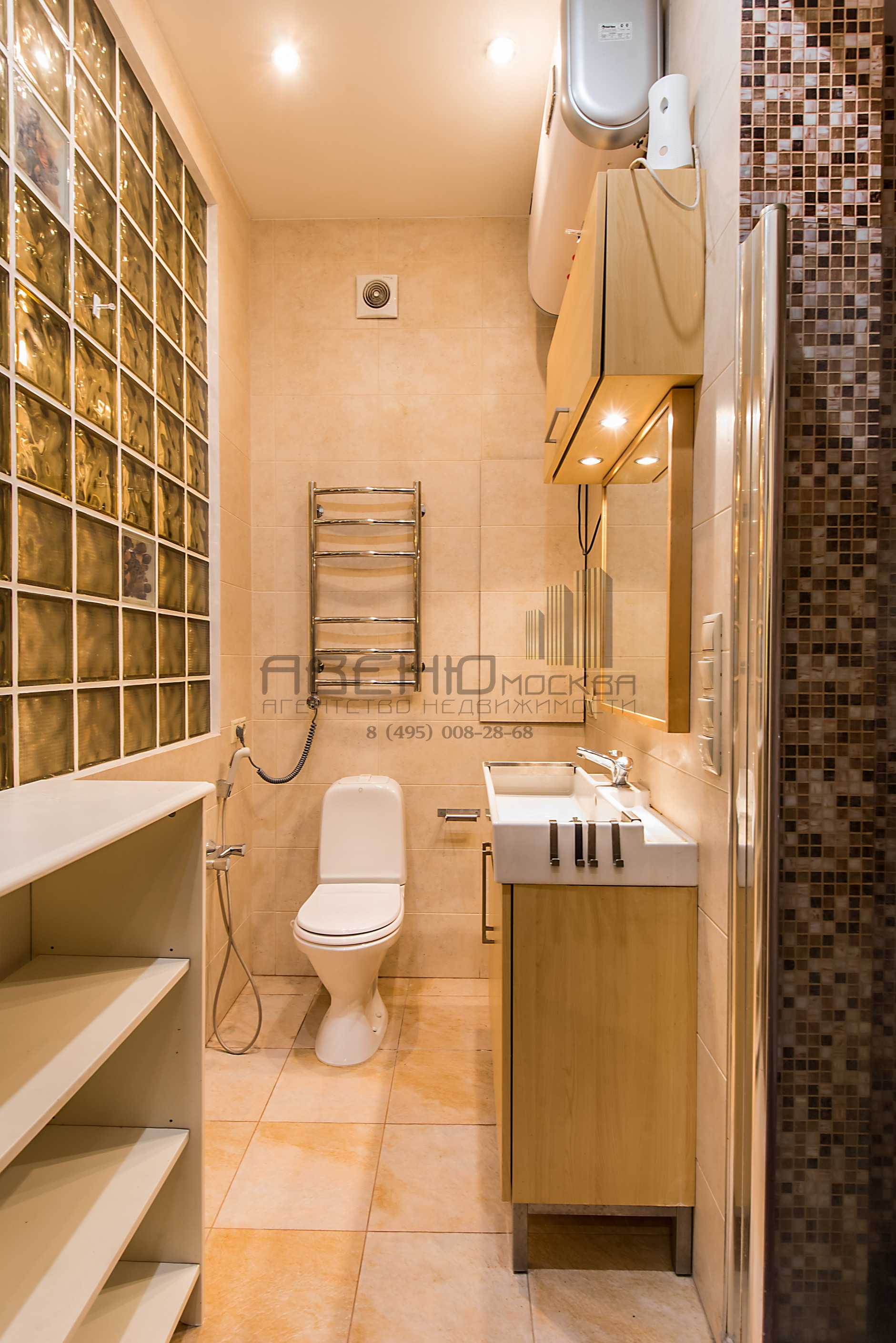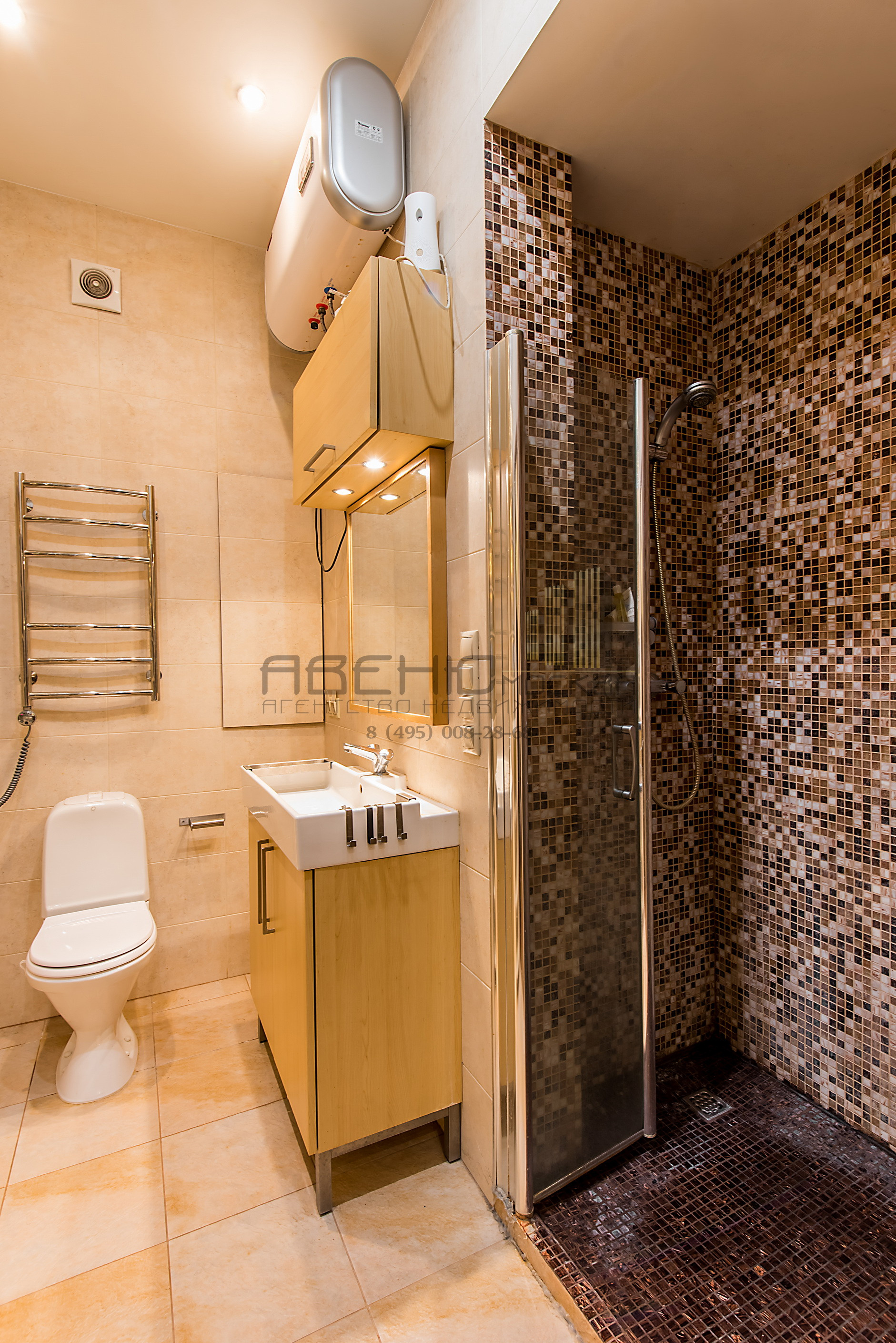 Санузел совмещенный с душевой кабиной строительным способом, стены - кафель; счетчики воды в скрытой нише; установлен водонагреватель и гигиенический душ.