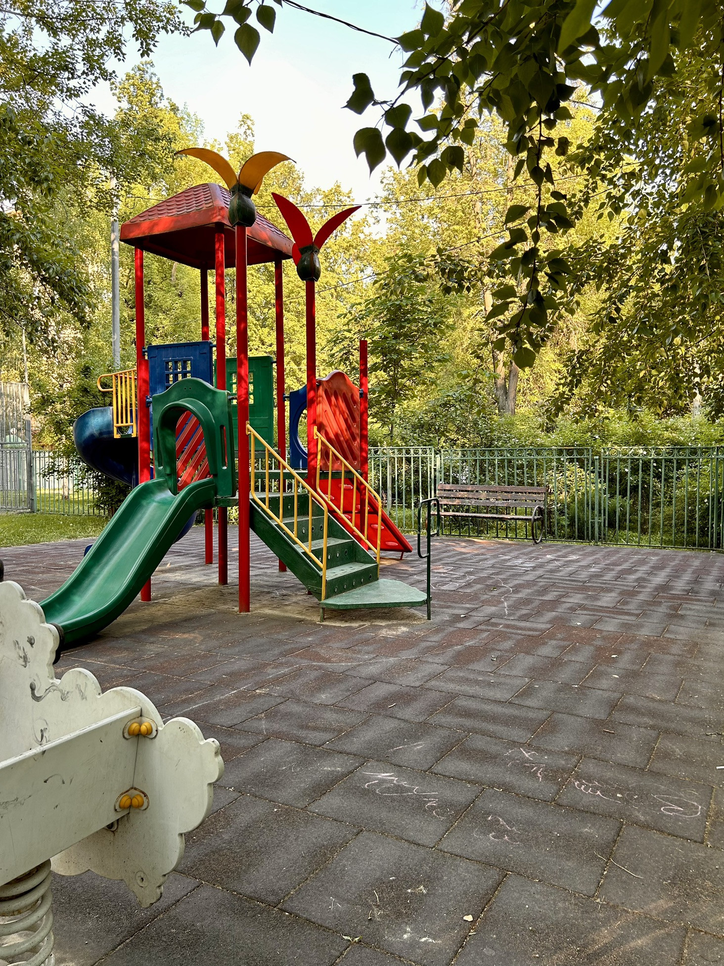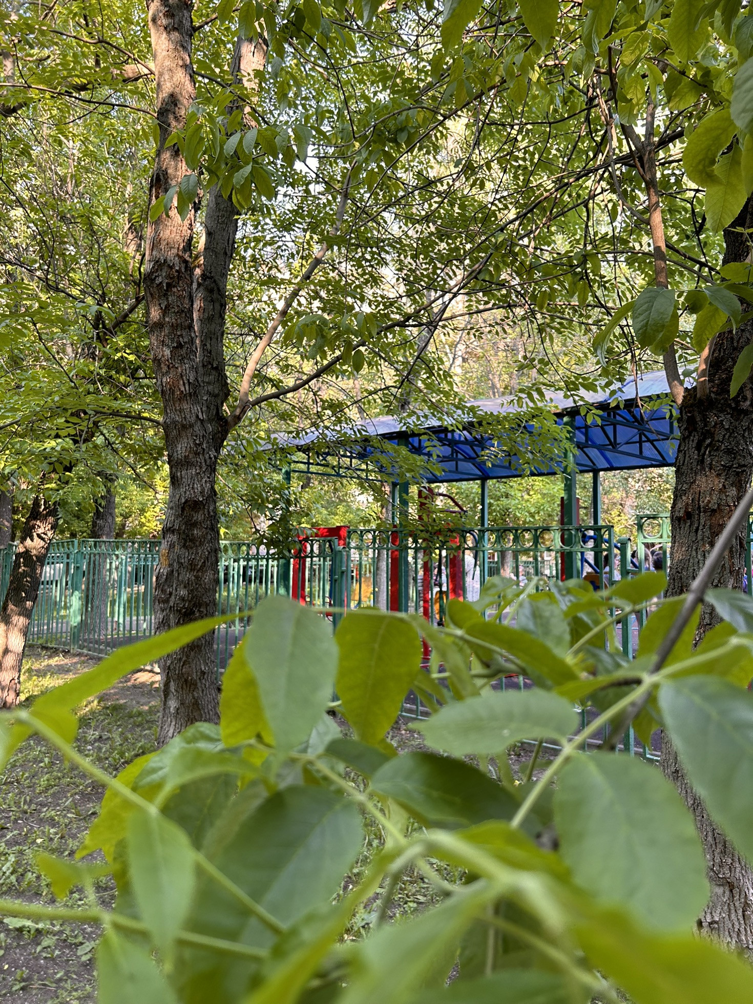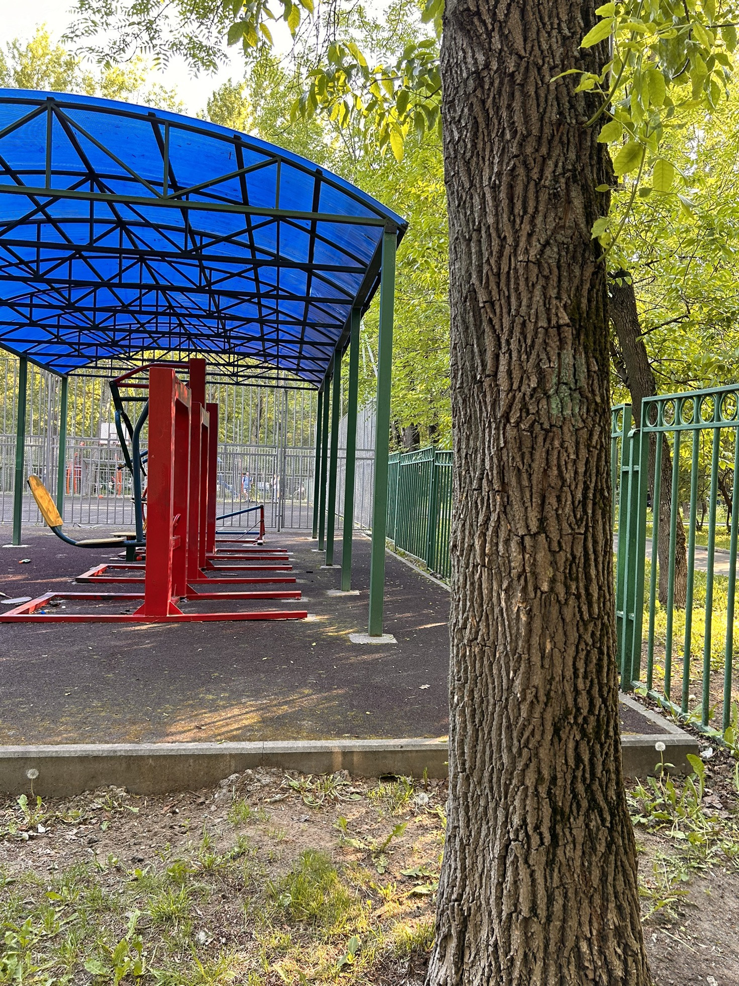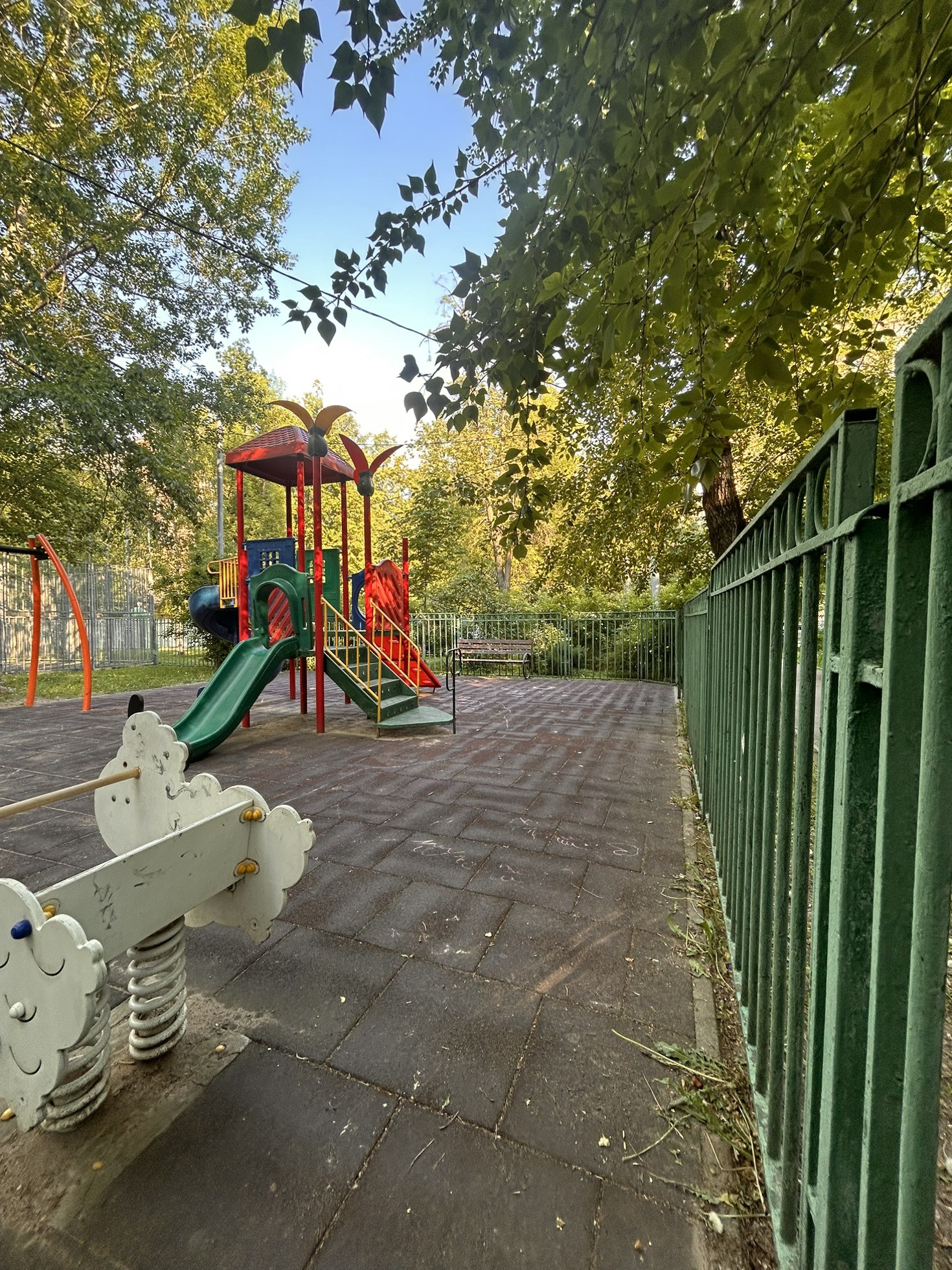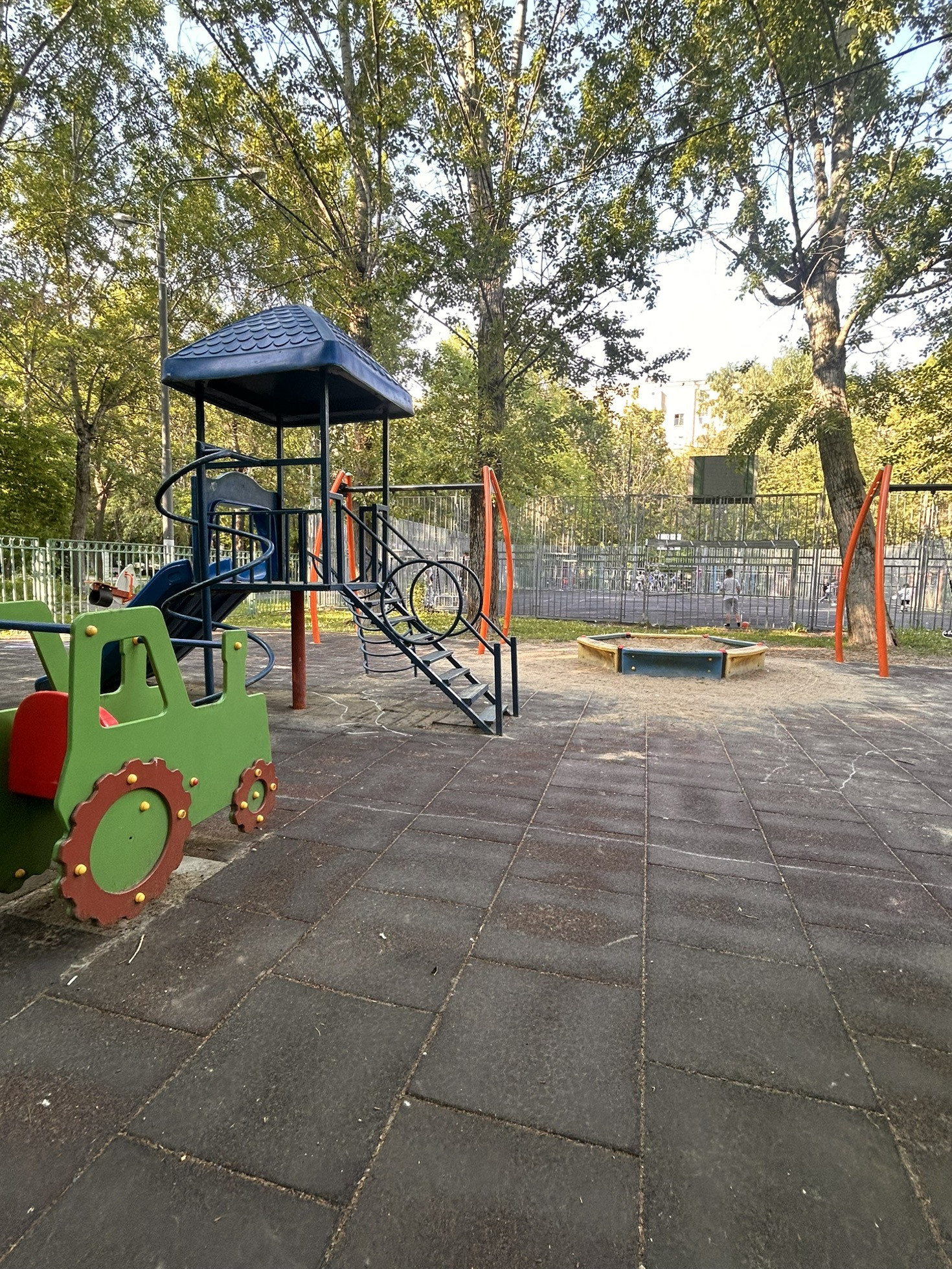 Двор полностью огорожен, въезд через шлагбаум. Во дворе расположены: детские и спортивные площадки, посажены цветы в виде альпийской горки, создан зеленый оазис для жителей дома в виде сквера с лавочками, в тени от солнца.