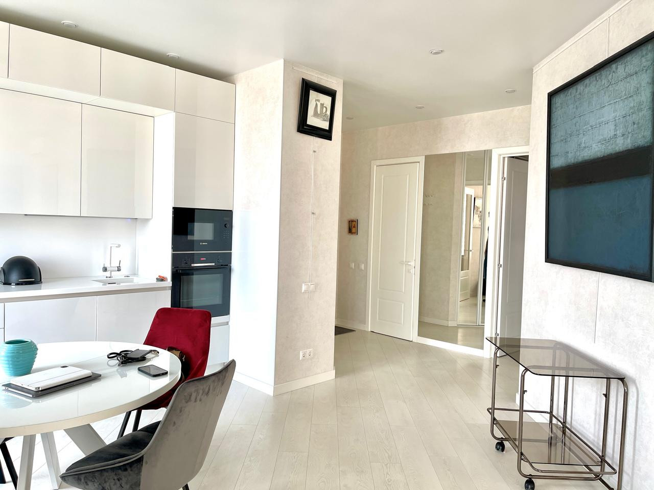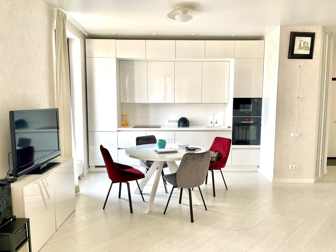 - Просторная, светлая гостиная с кухонным гарнитуром и встроенной техникой Bosch (плита, духовка, посудомоечная машина, микроволновая печь, холодильник, встроенный в раковину измельчитель и фильтр для воды).