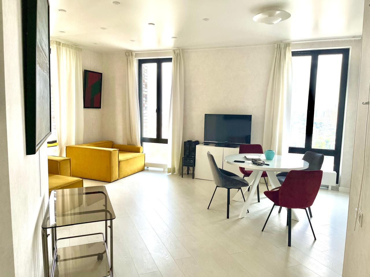 Просторная 3-комнатная квартира с красивым панорамным видом на центр Москвы, полностью готовая к заселению. Безупречная планировка, отличное качество ремонта, полностью меблирована и оборудована бытовой техникой, включая кондиционеры и водонагреватель.