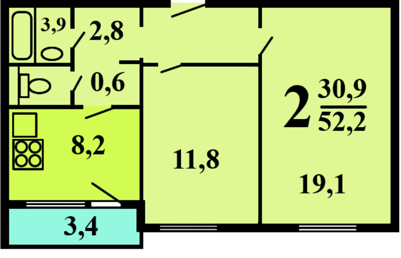 Общая площадь 51.5 м2