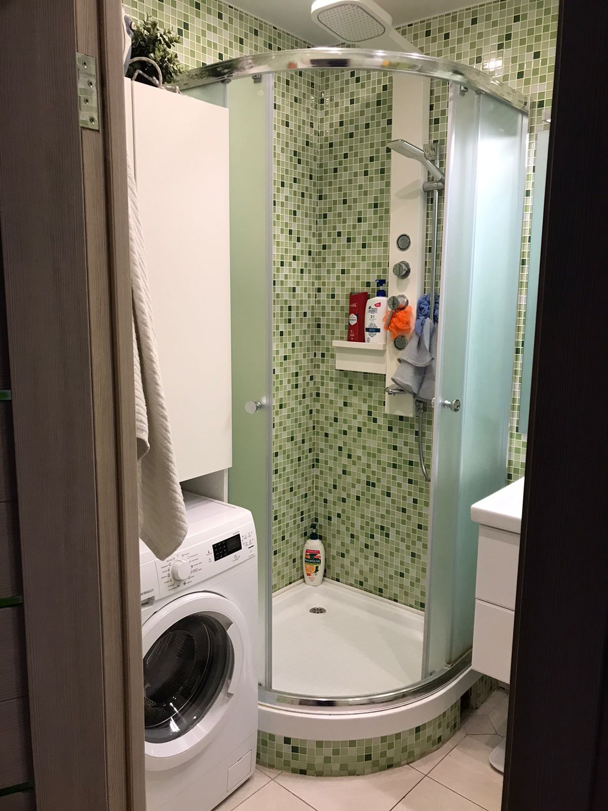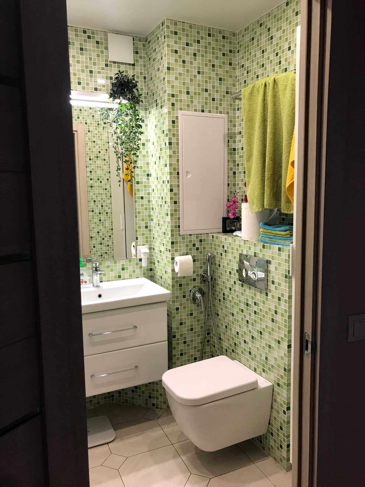 Помещение ванной комнаты , отделано плиткой-мазайкой приятного салатового цвета, унитаз с инсталяцией ( GEBERIT ) с гигиеническим душем, теплый пол с терморегулятором.