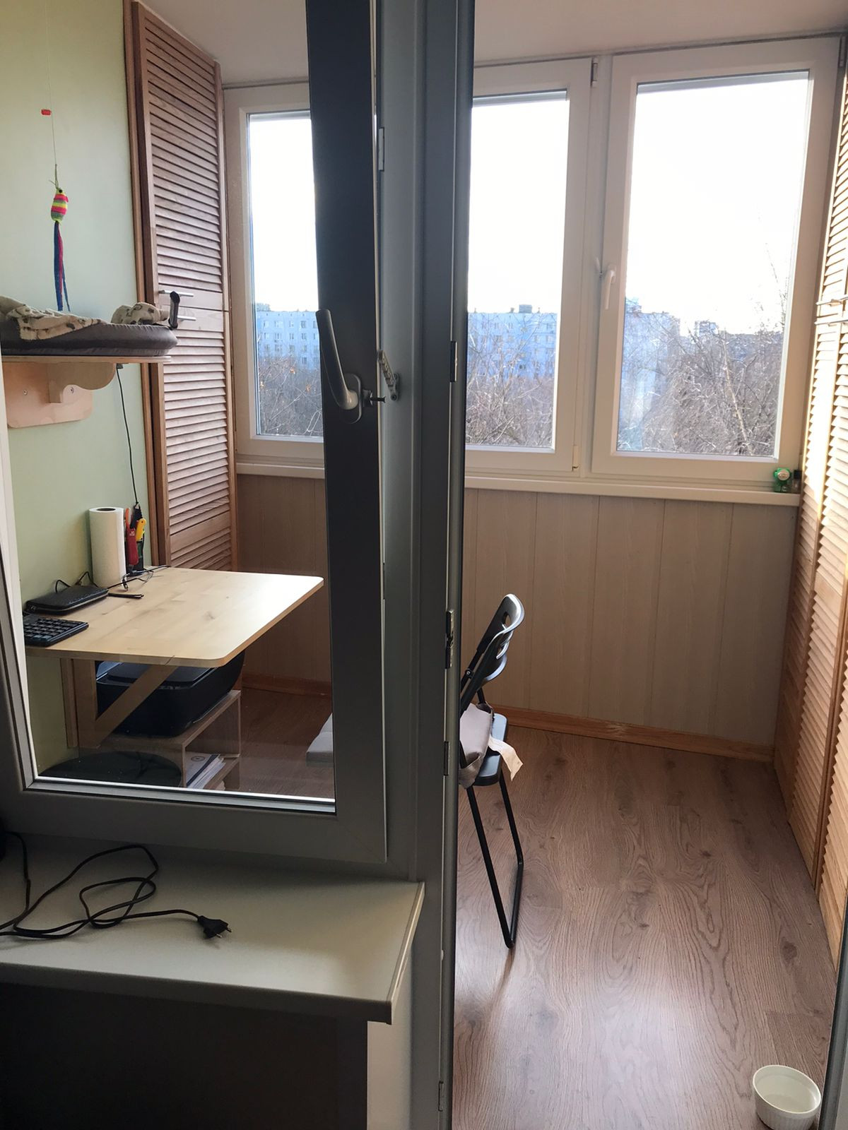 Балкон утеплен полностью, на балконе вместительные шкафы ( сделаны на заказ под размер).