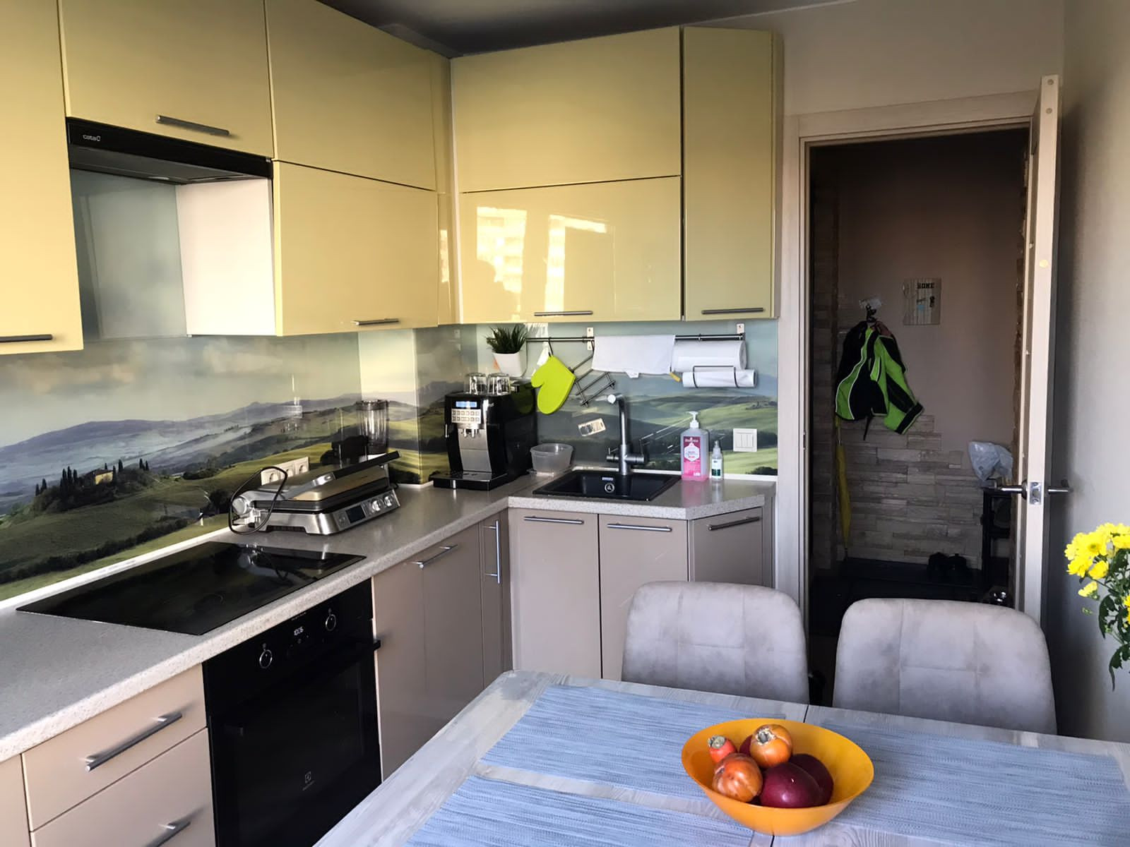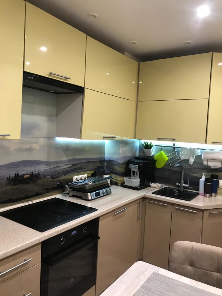 Кухонный фартук сделан на заказ из закаленного стекла с объемным изображением и подсветкой. Над рабочей зоной, много розеток, все продумано хозяевами до мелочей.