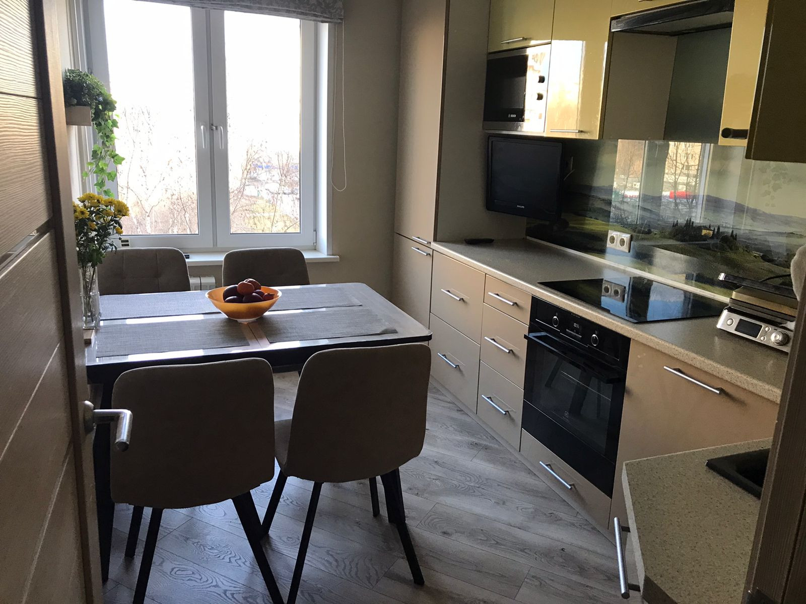 Встроенный кухонный гарнитур остаётся! Сделанный на заказ, по специальной технологии окраски под лак и качественной фурнитурой. На кухне прекрасно умещается встраиваемый холодильник, кофе-машина, духовой шкаф и варочная панель и посудомоечная машина 60*60.