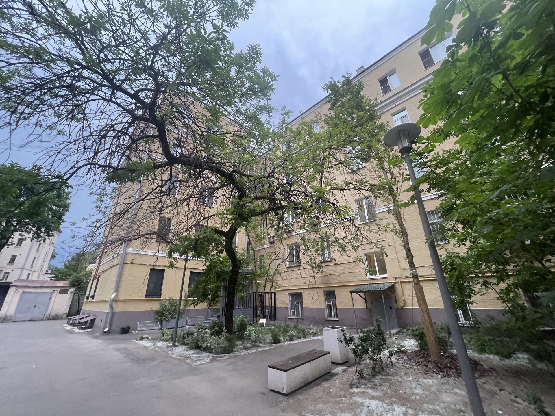 Закрытый тихий двор со шлагбаумом. Детская игровая площадка, много зелени.
