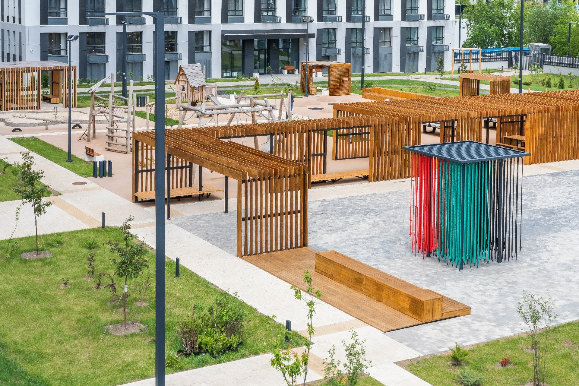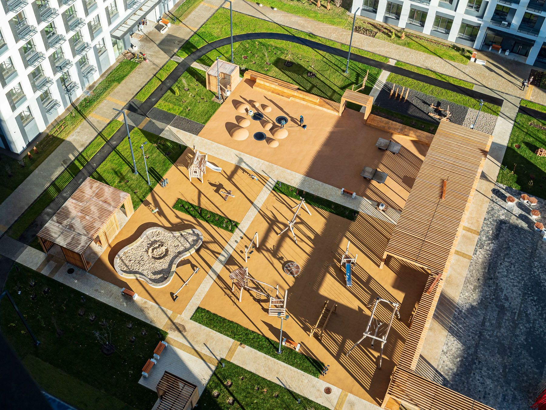- двор без машин, детские и спортивные площадки, патио