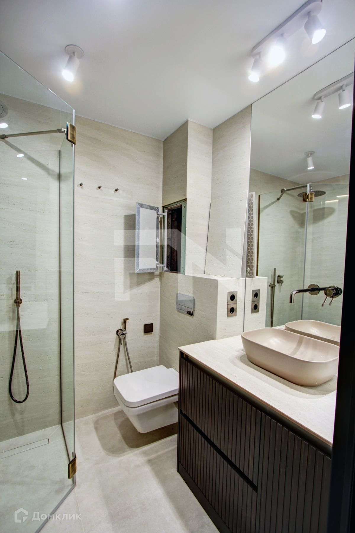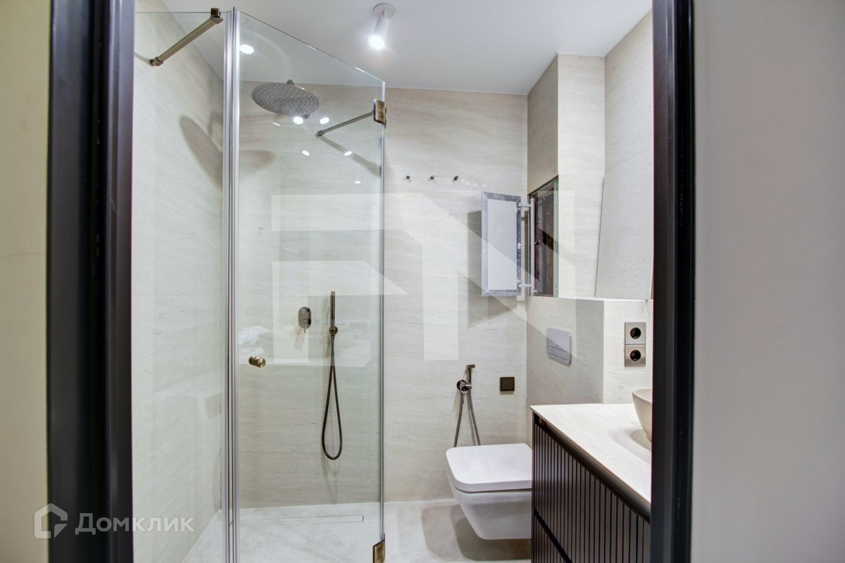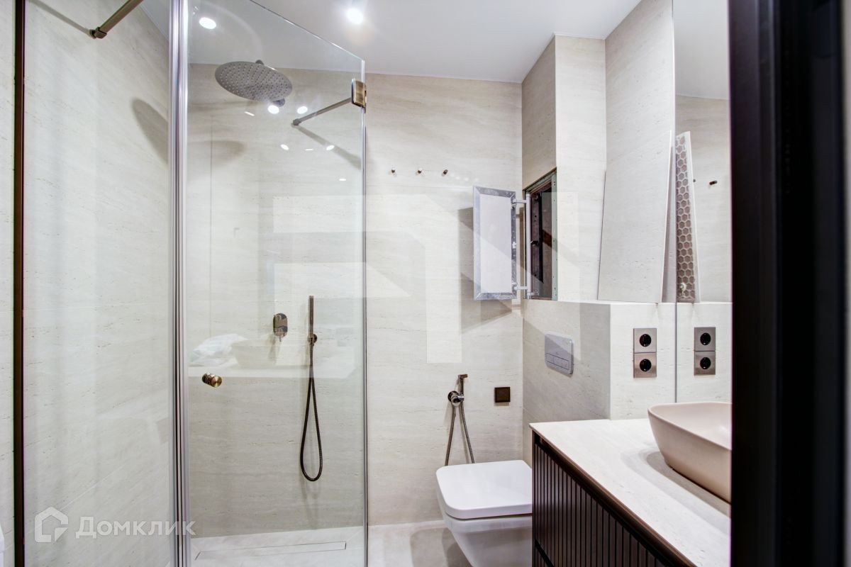 Совмещенный санузел с душевой (Душевой гарнитур, гигиенический душ, встроенный в зеркальную стену смеситель итальянской фирмы Bohme, подогреваемая стена для сушки полотенец)