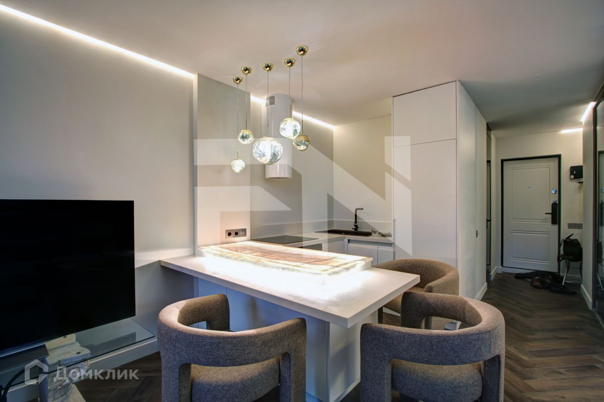 Просторную светлую кухню-гостиную (Столешница островка изготовлена на заказ из натурального иранского камня оникс с подсвеченной обеденной зоной) с выходом на застекленную лоджию с панорамным остеклением и теплым полом