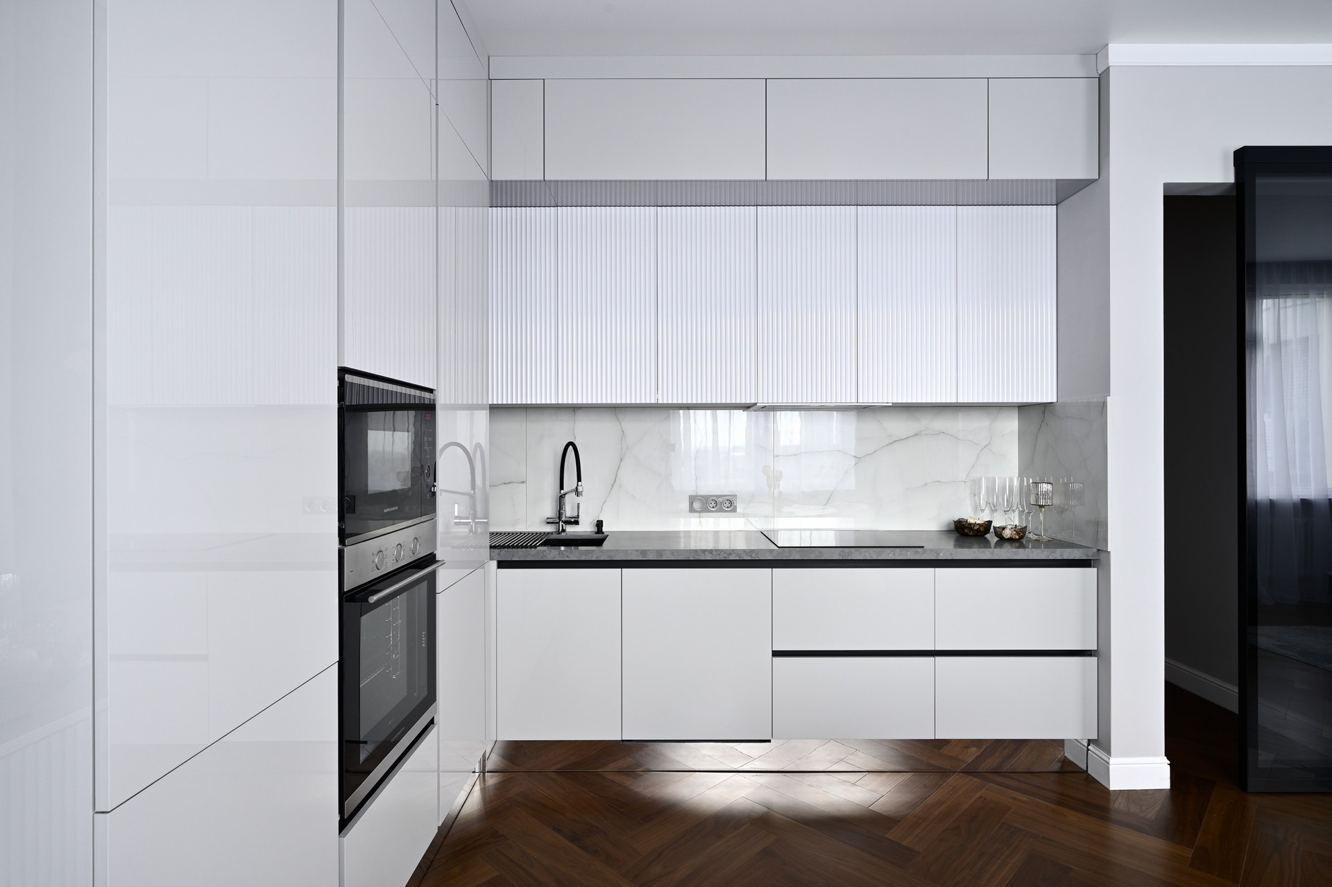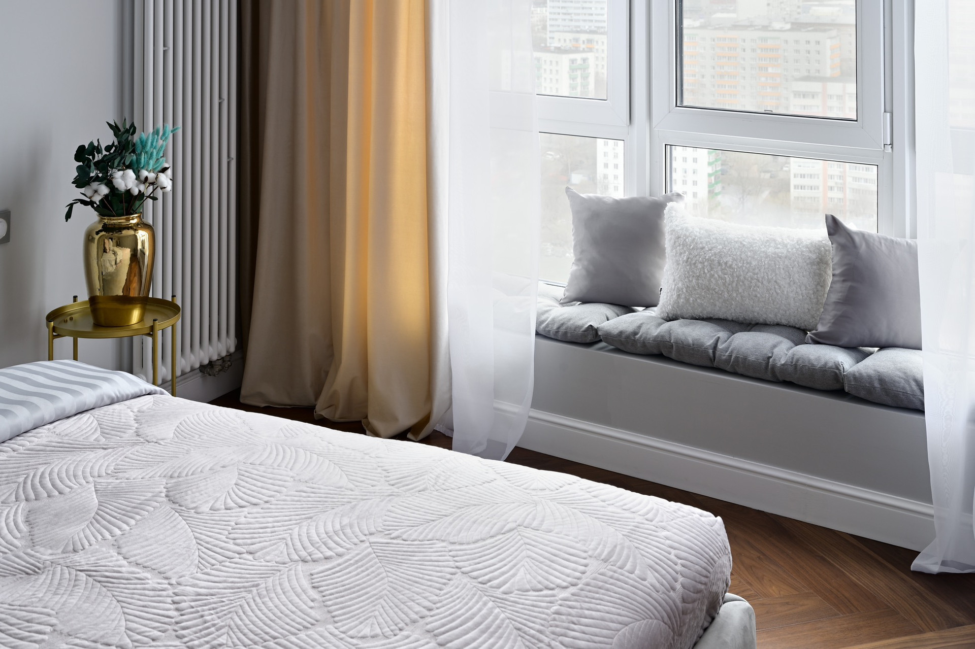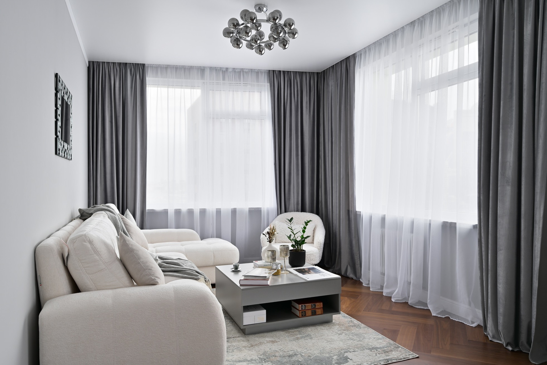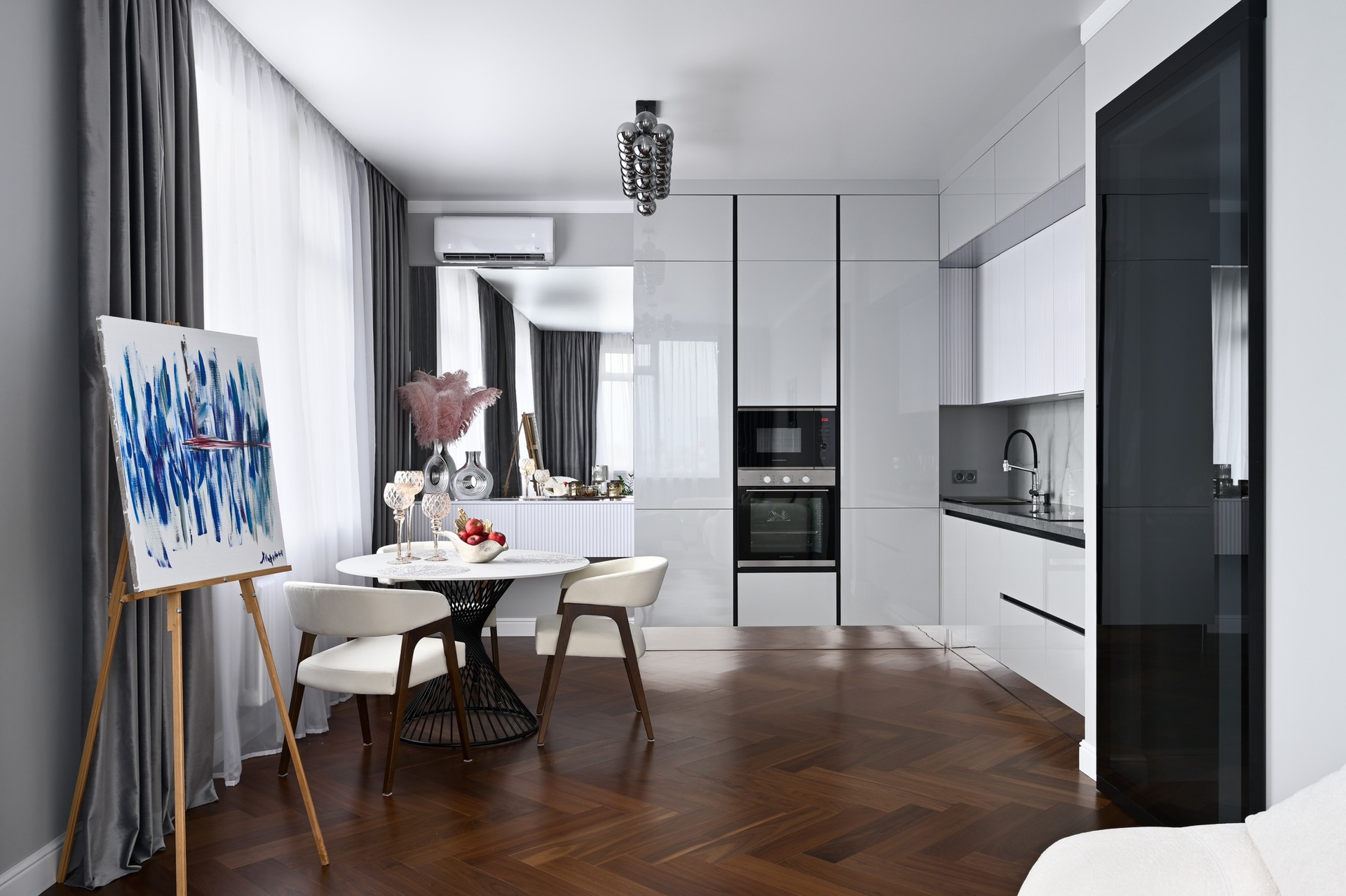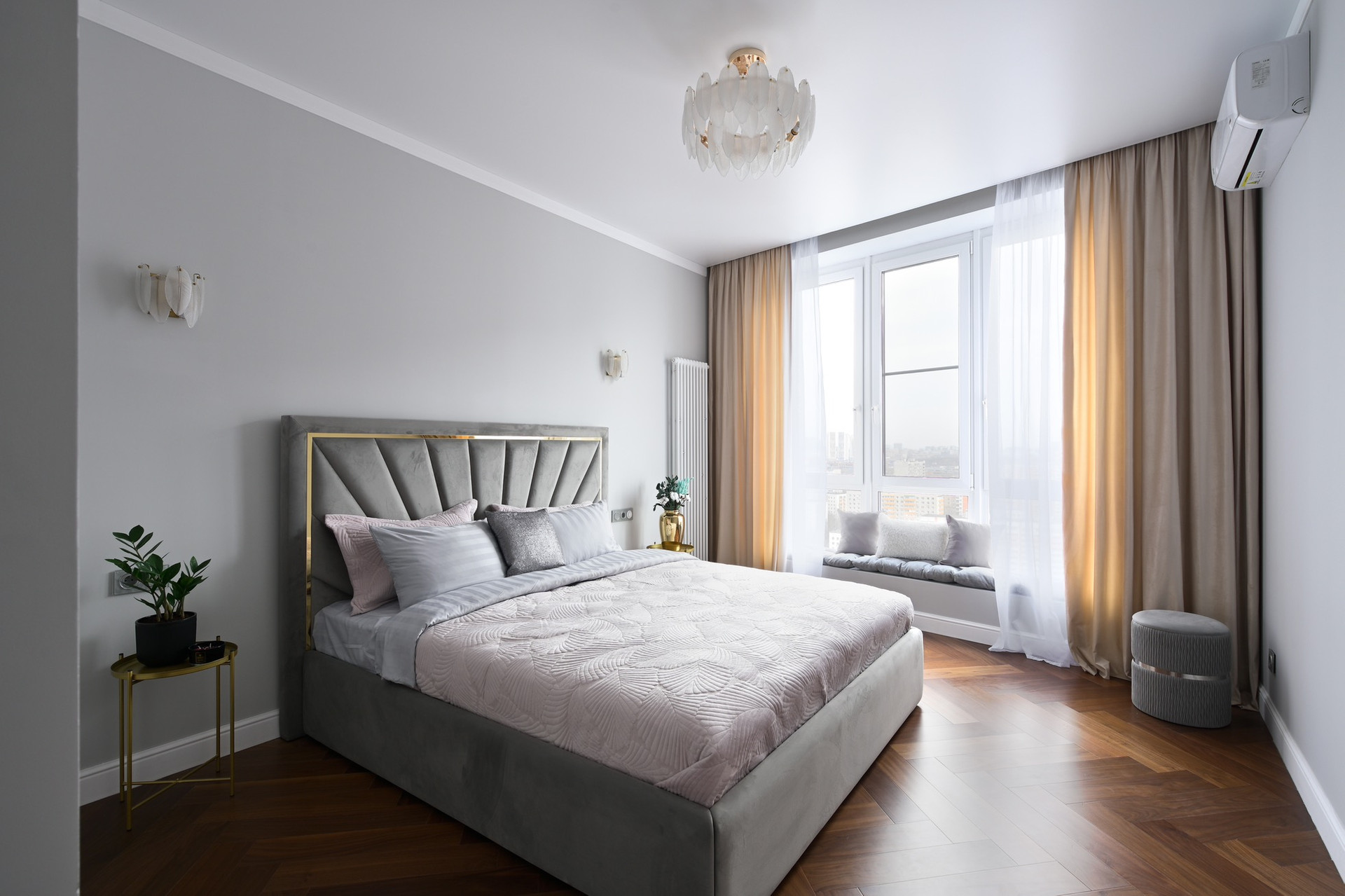 Четырехкомнатная квартира с премиальным интерьером, в отделке стен использовалась декоративная штукатурка , на полу паркет, кухонная столешница и подоконник из кварцевого камня, установлена система теплого пола и кондиционирования, бойлер для нагрева воды.