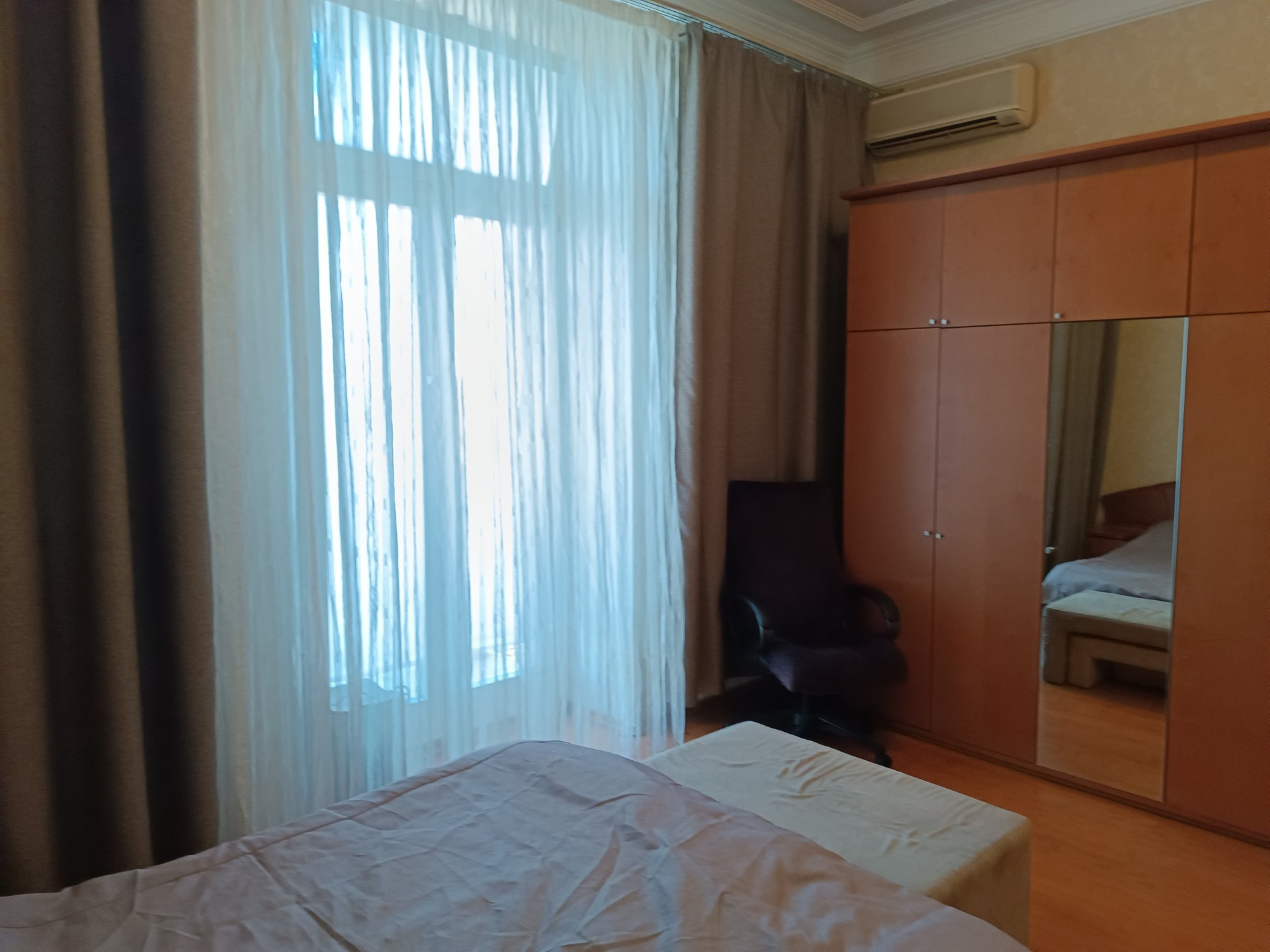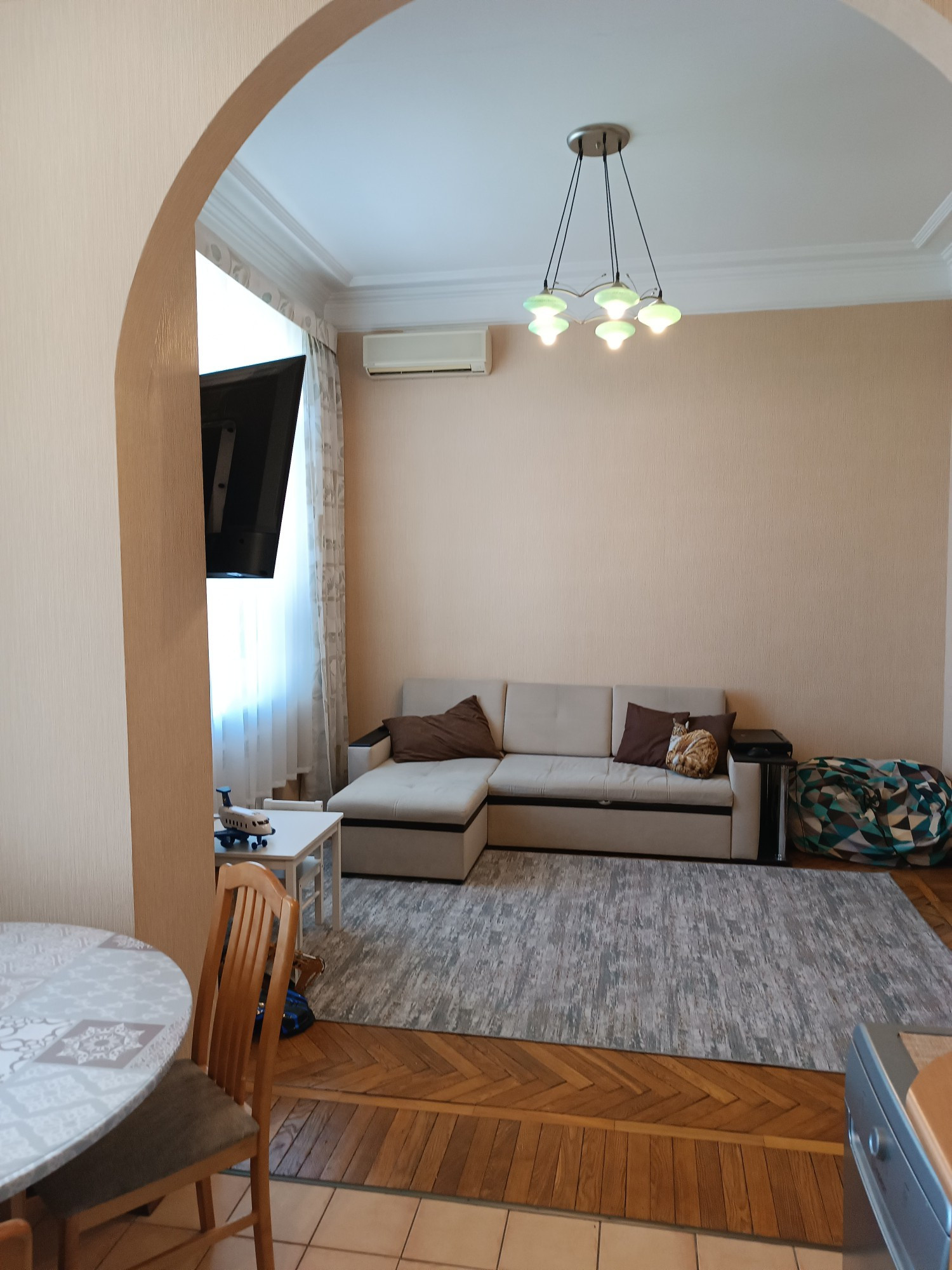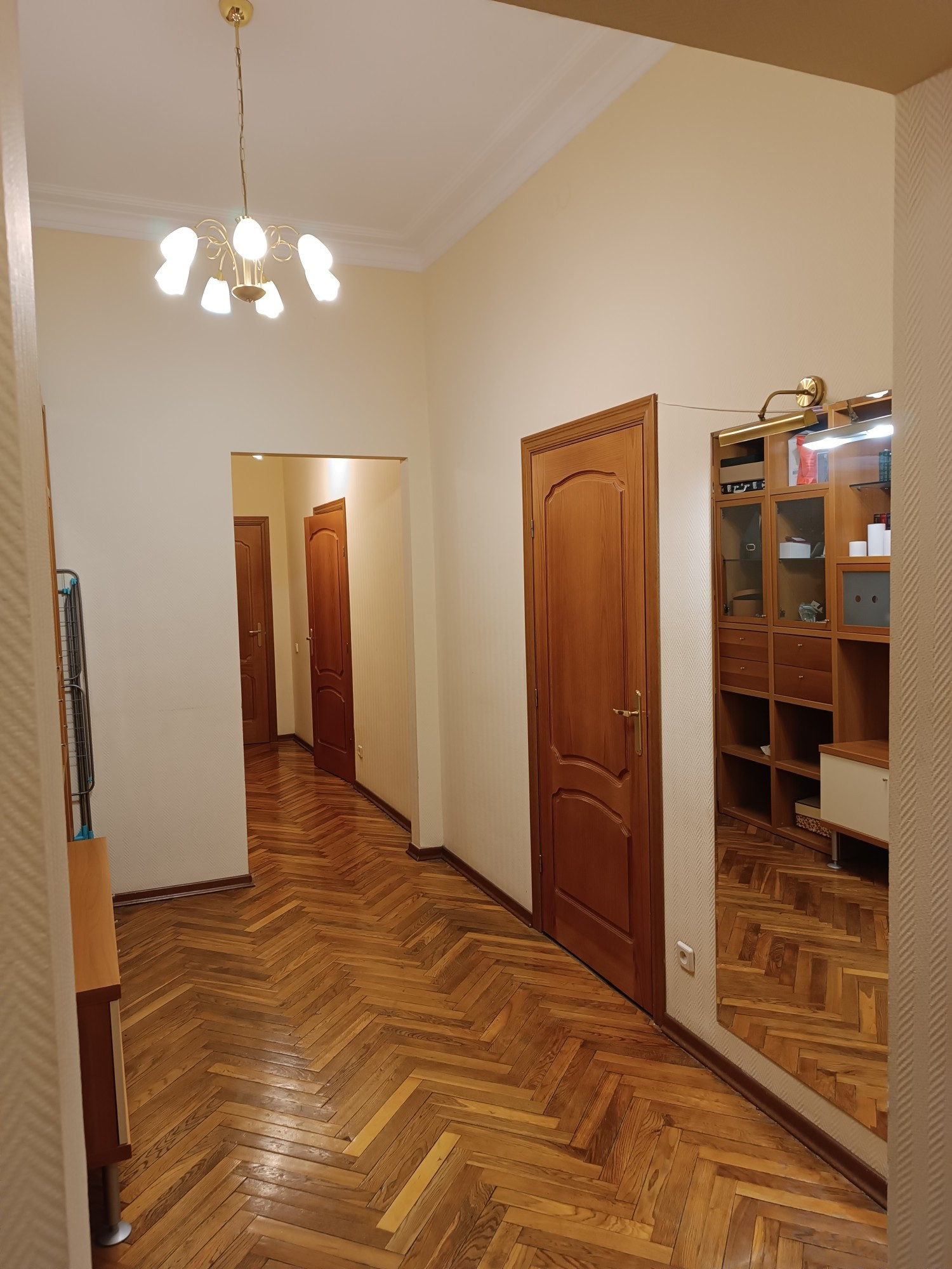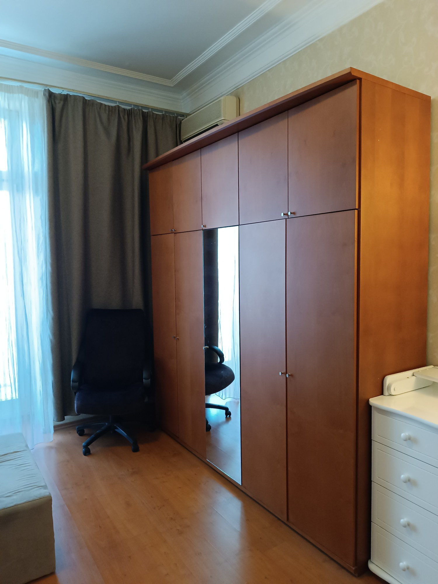 В квартире выполнен качественный ремонт 12 лет назад, полы дубовый паркет, потолки отштукатурены, плитка Villeroy&Boch в сан.узле и на полу кухни, встроенный кухонный гарнитур, комнаты полностью укомплектованы мебелью, в каждом помещении есть кондиционер, качественные стеклопакеты. в коридоре есть две большие кладовки с антресолями .
