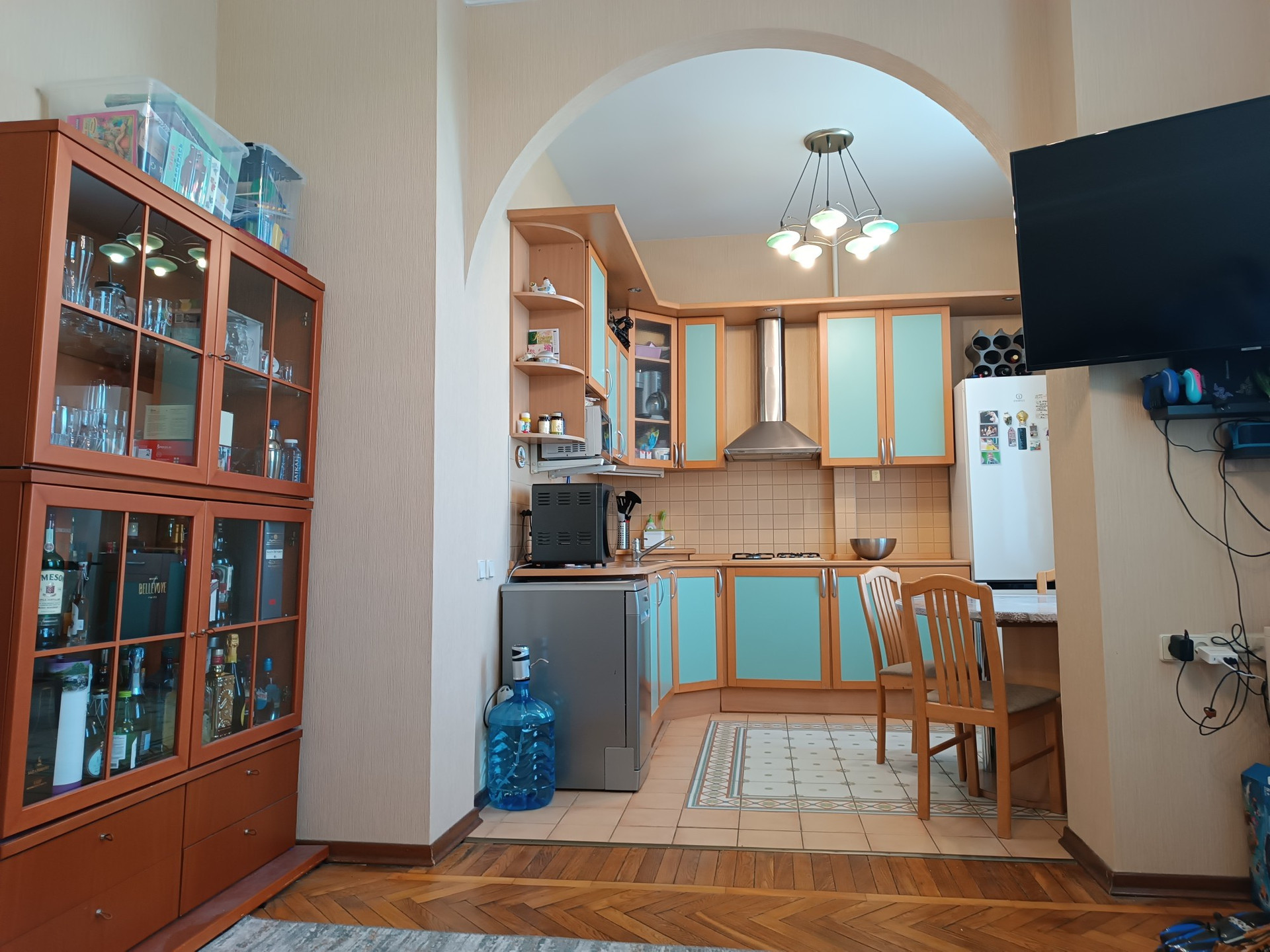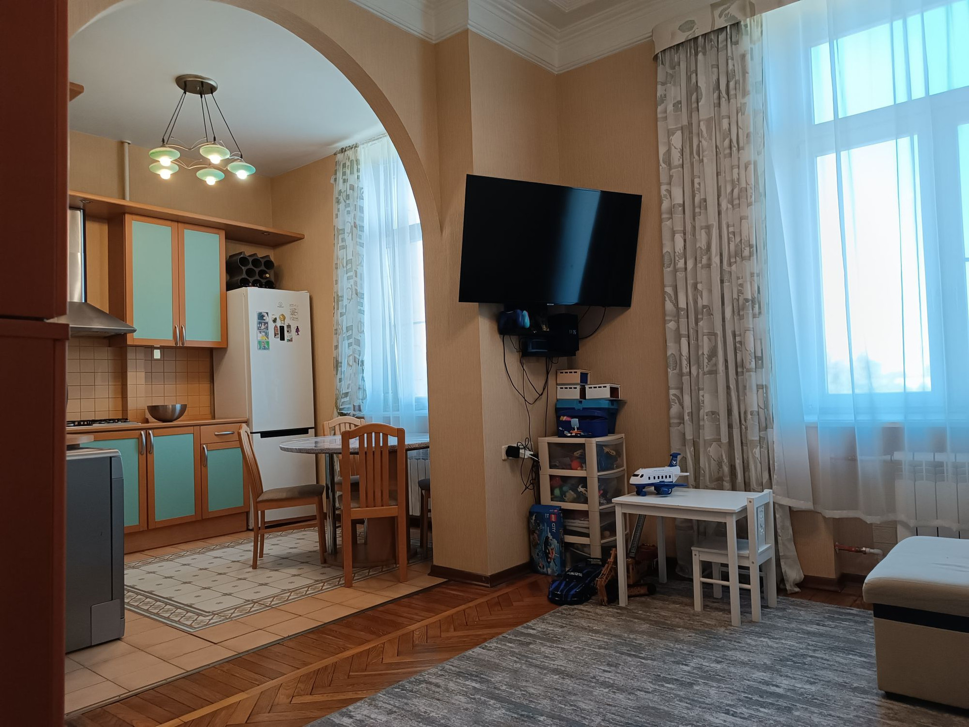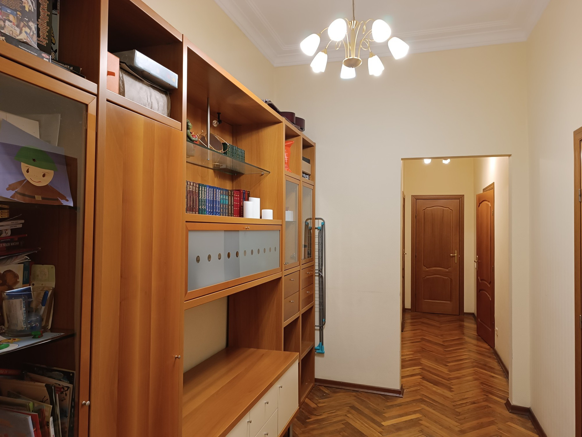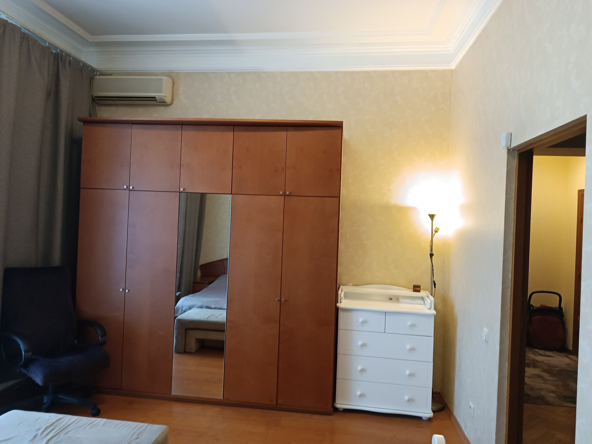 В квартире выполнен качественный ремонт 12 лет назад, полы дубовый паркет, потолки отштукатурены, плитка Villeroy&Boch в сан.узле и на полу кухни, встроенный кухонный гарнитур, комнаты полностью укомплектованы мебелью, в каждом помещении есть кондиционер, качественные стеклопакеты. в коридоре есть две большие кладовки с антресолями .
