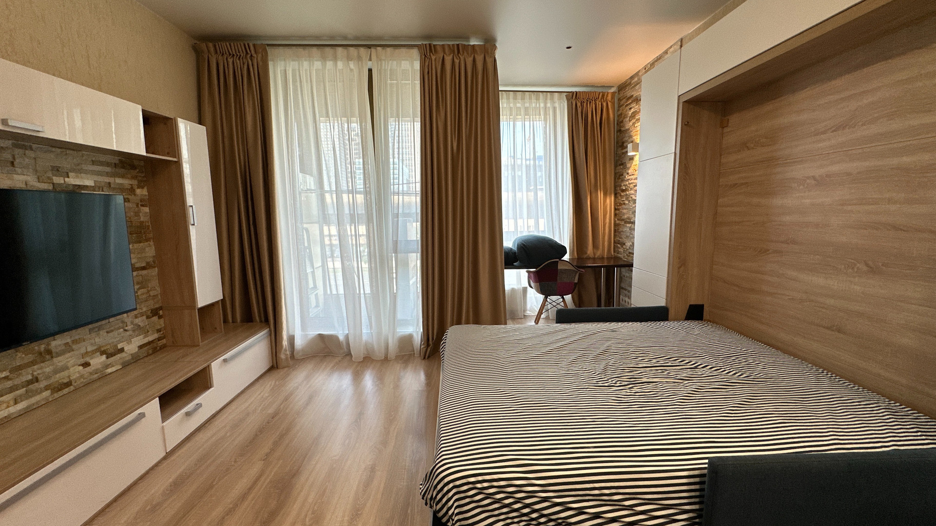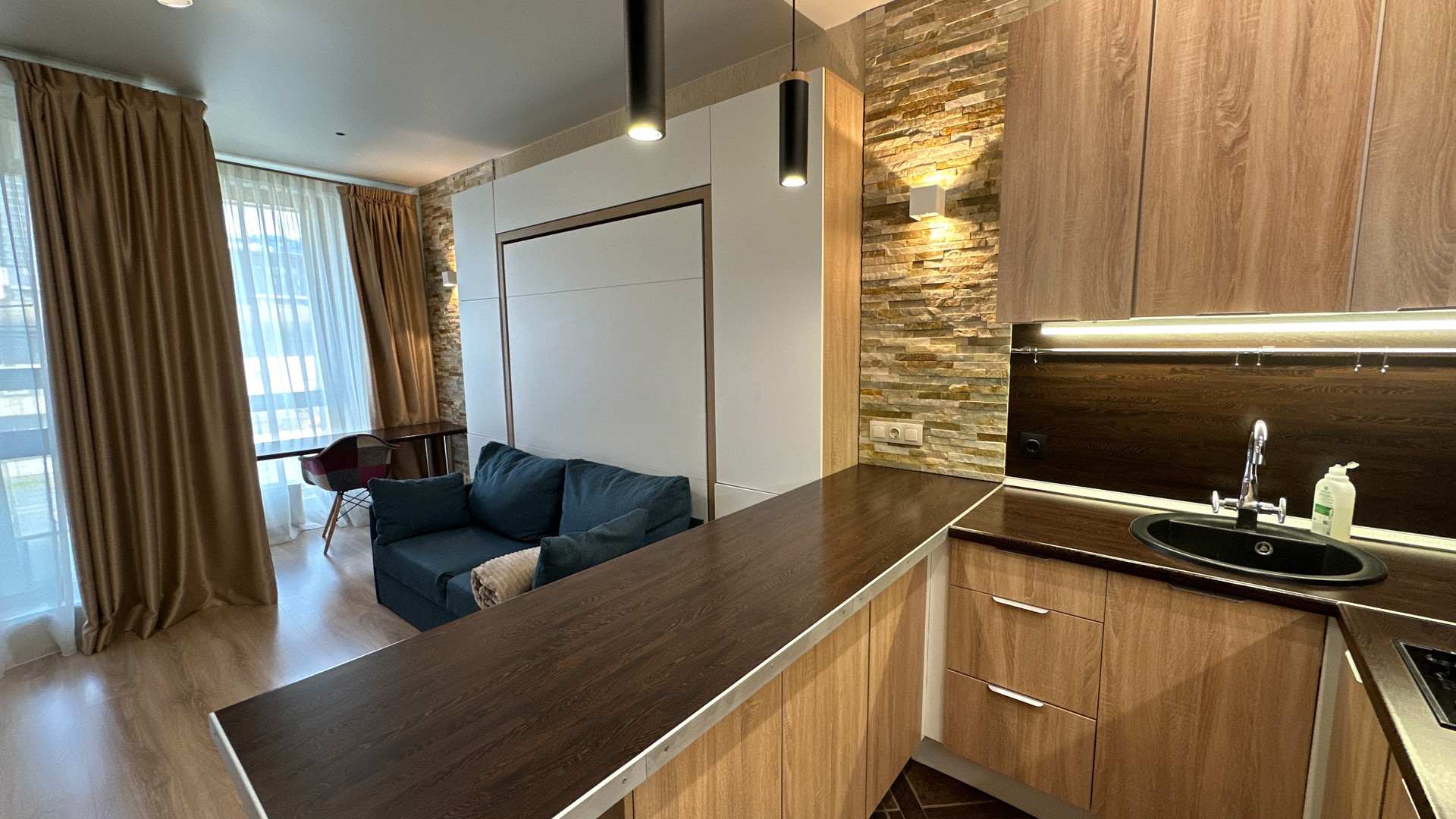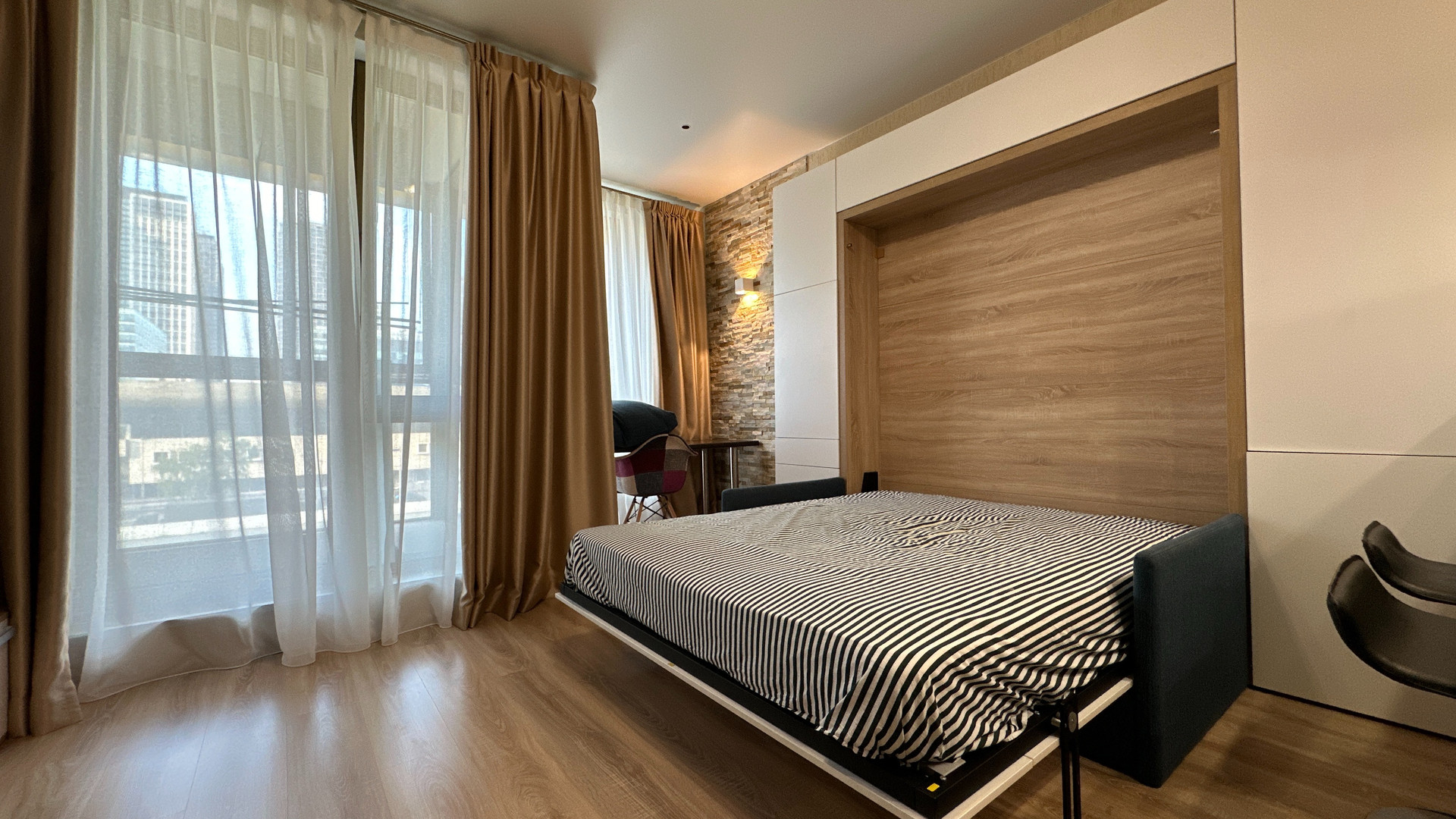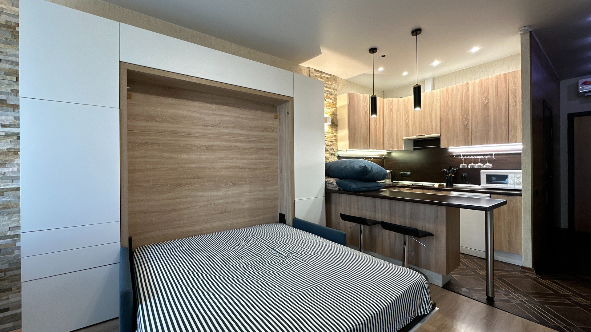 - Изюминка данного объекта это эргономичность. Апартамент оснащен специальной мебелью. Кровать удобно и легко может скрываться в стену и превращаться в диван, а также наоборот раскладываться без передвижения мебели и лишних усилий.