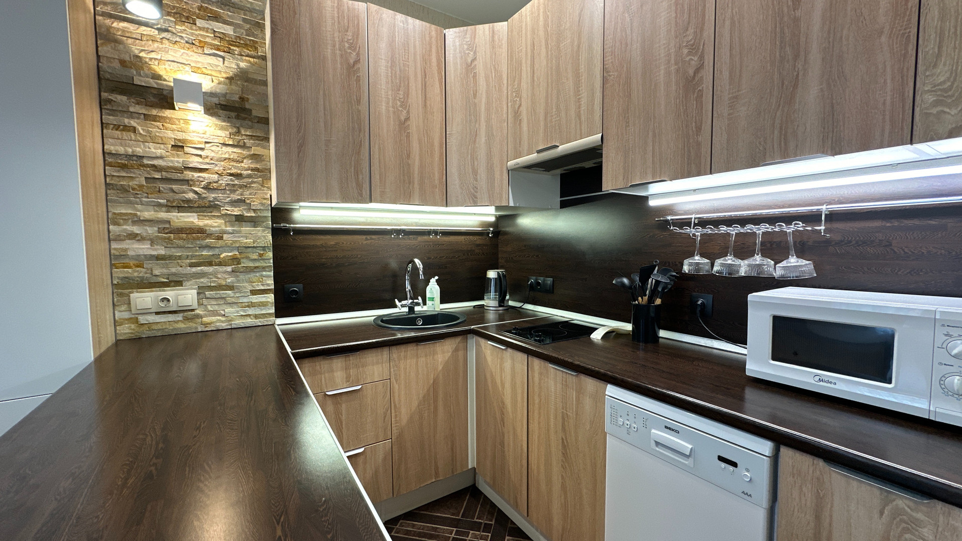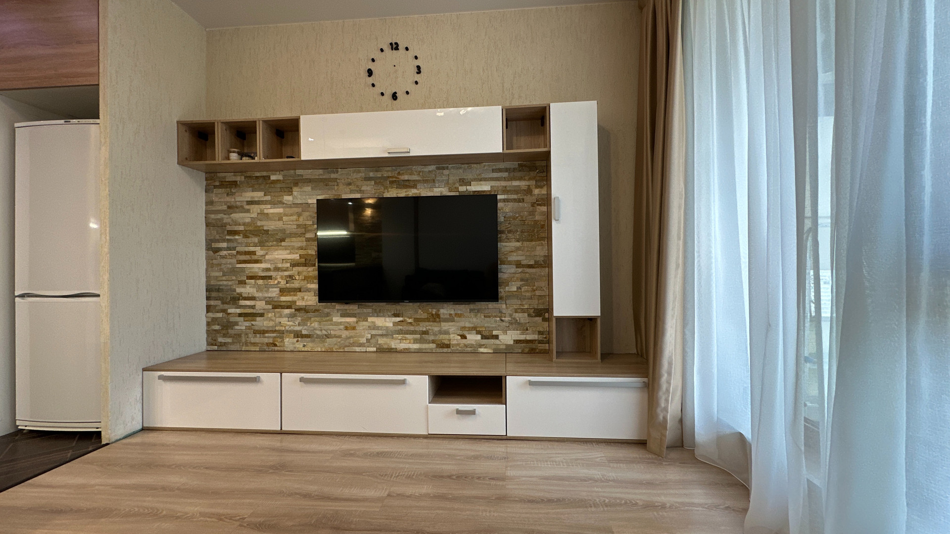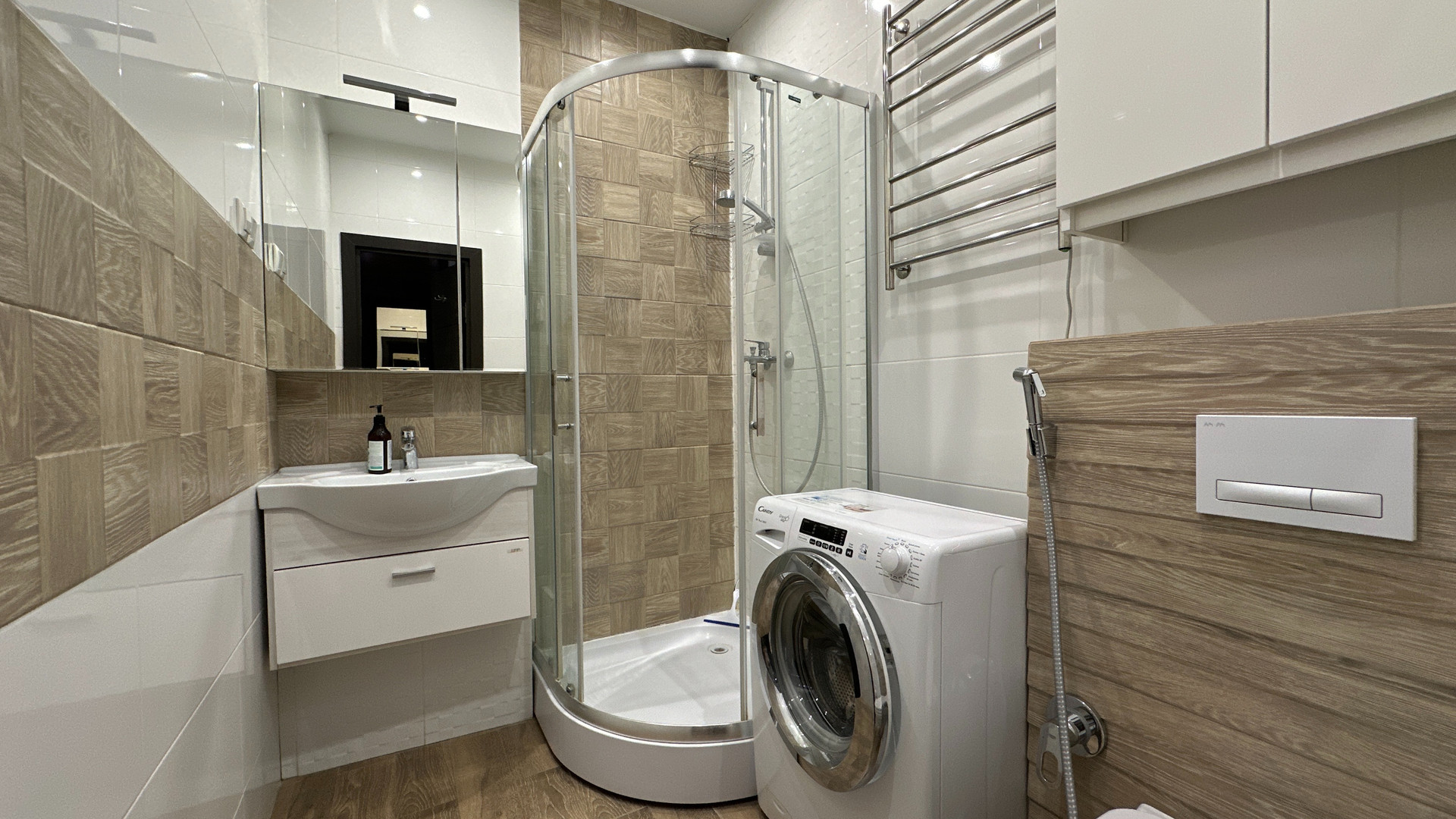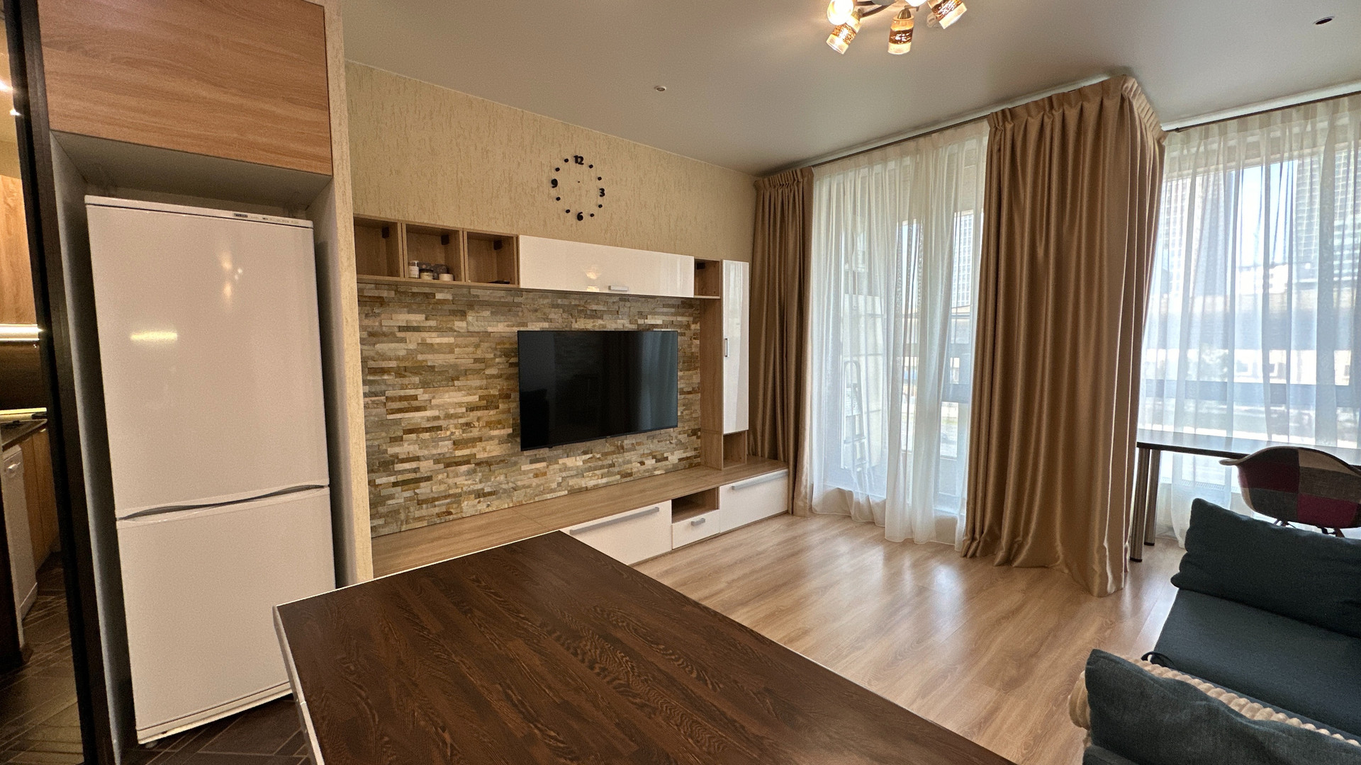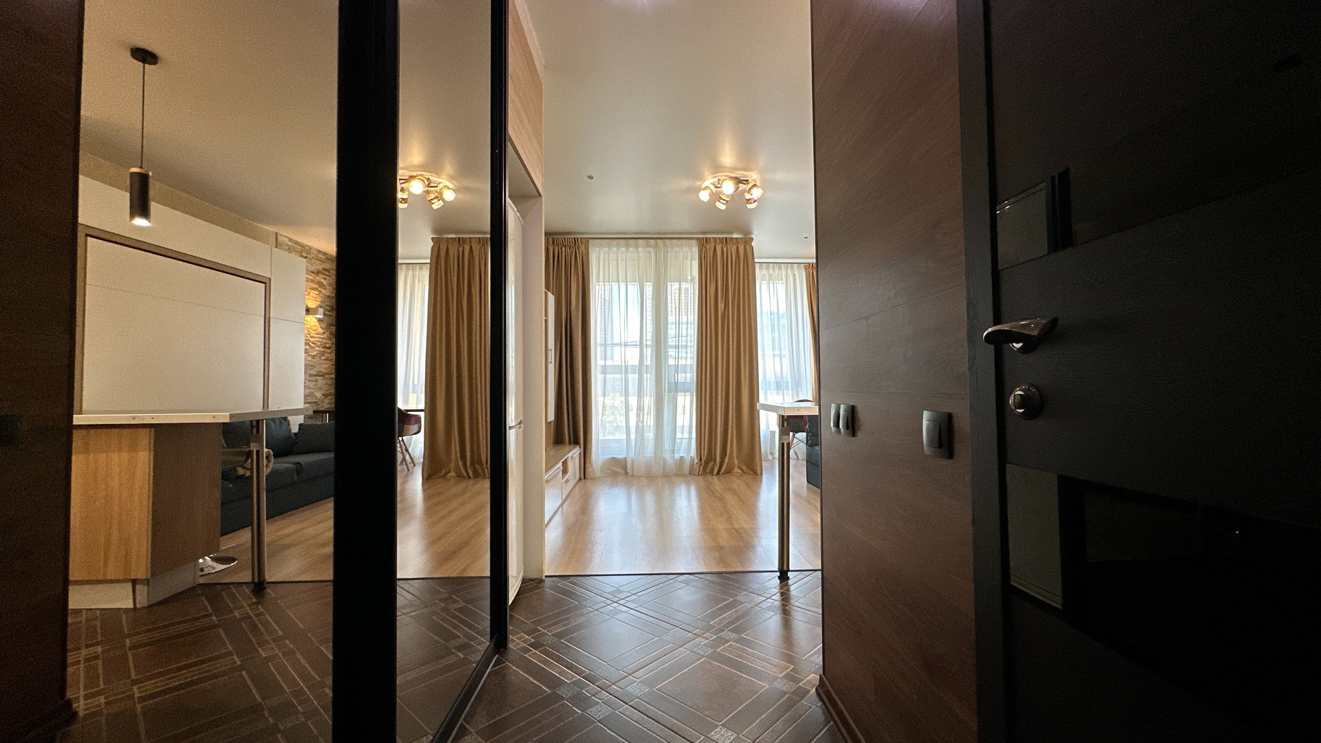 - Изюминка данного объекта это эргономичность. Апартамент оснащен специальной мебелью. Кровать удобно и легко может скрываться в стену и превращаться в диван, а также наоборот раскладываться без передвижения мебели и лишних усилий.