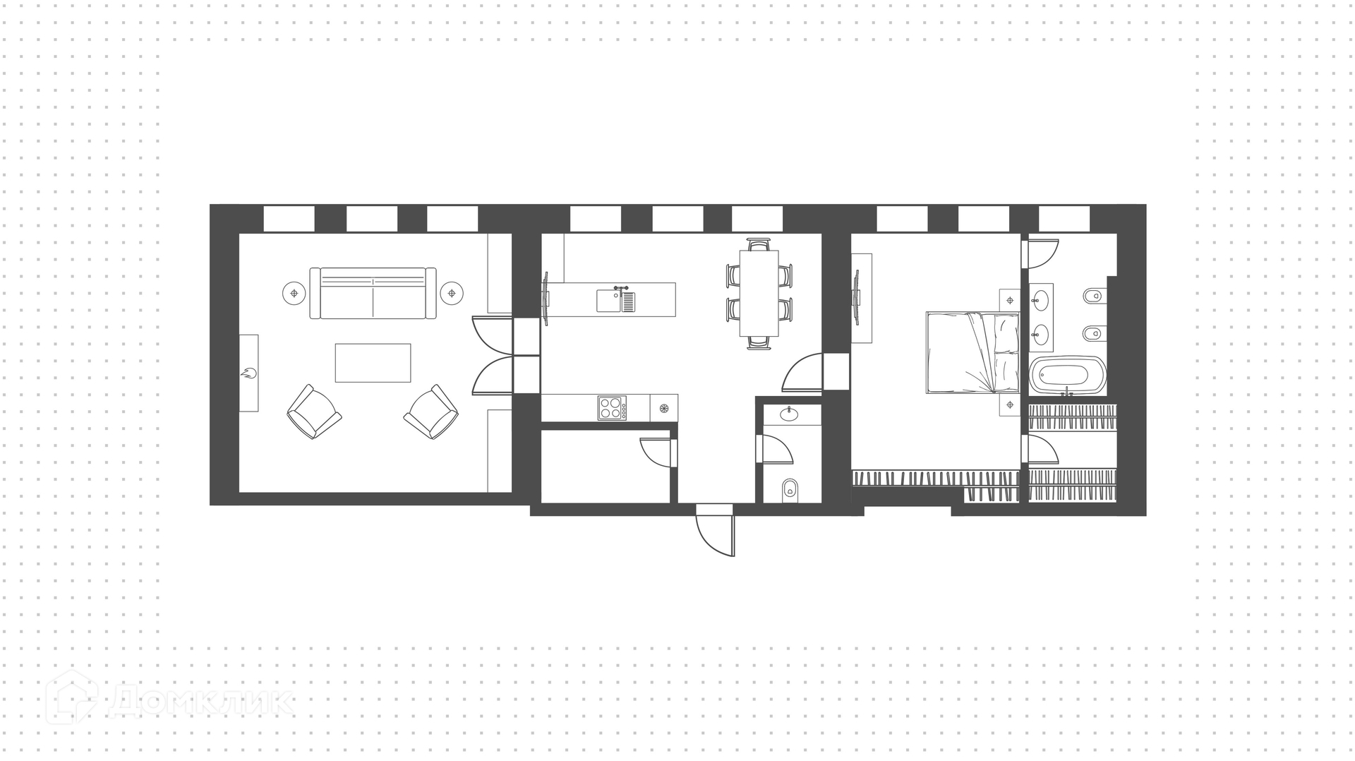Планировка: гостиная, кухня-столовая, спальня с  ванной комнатой и гардеробной, гостевой санузел.
