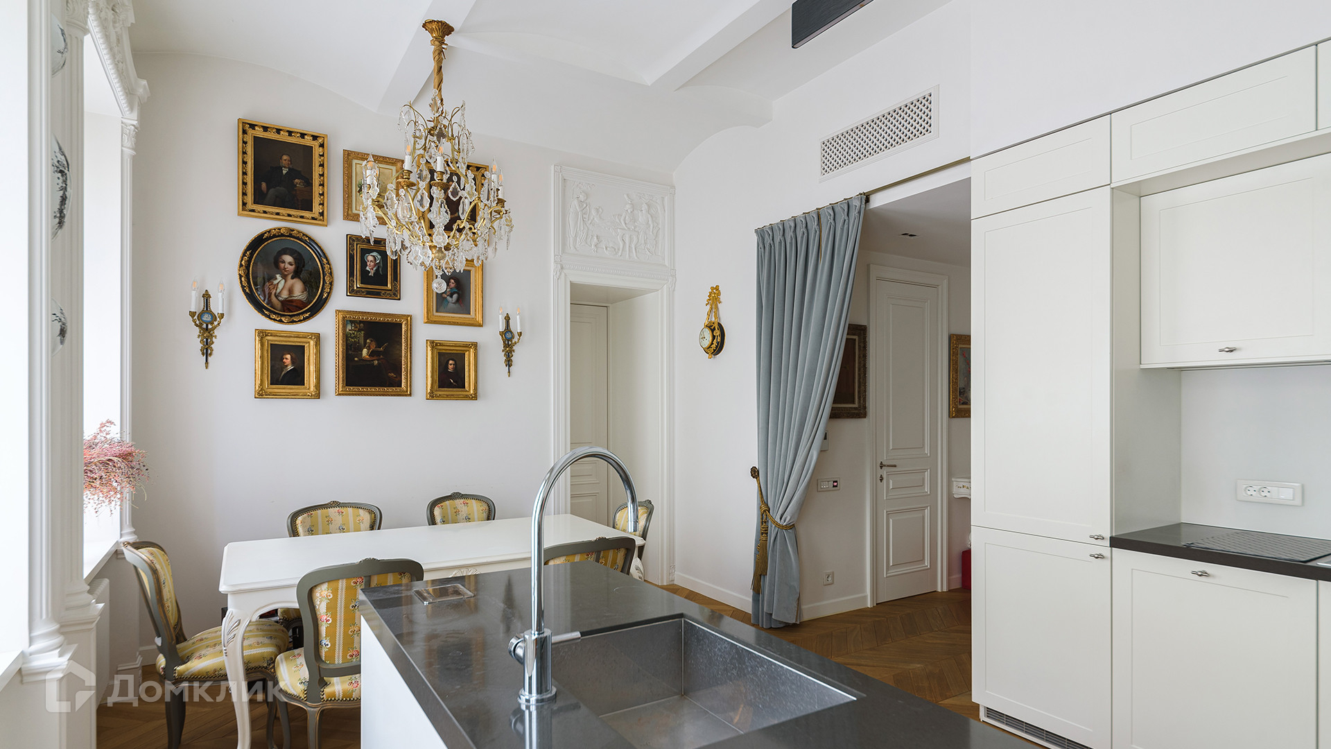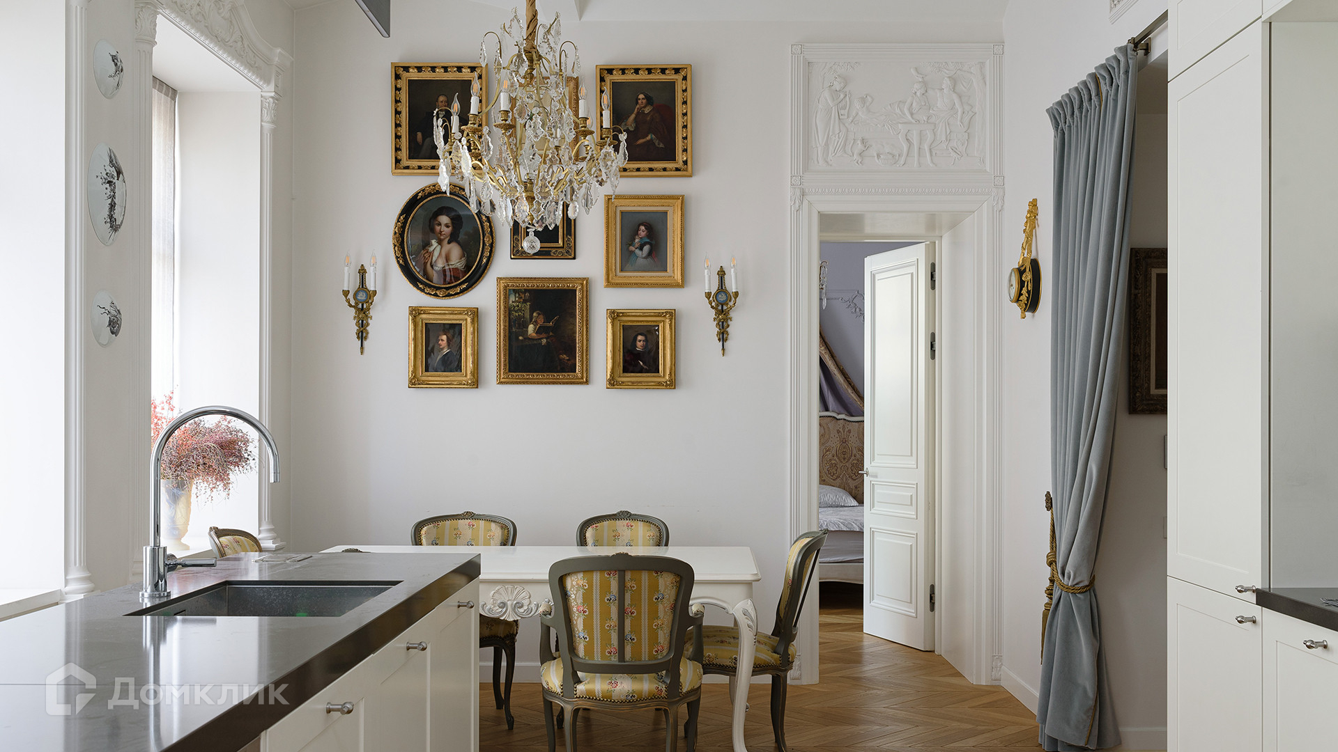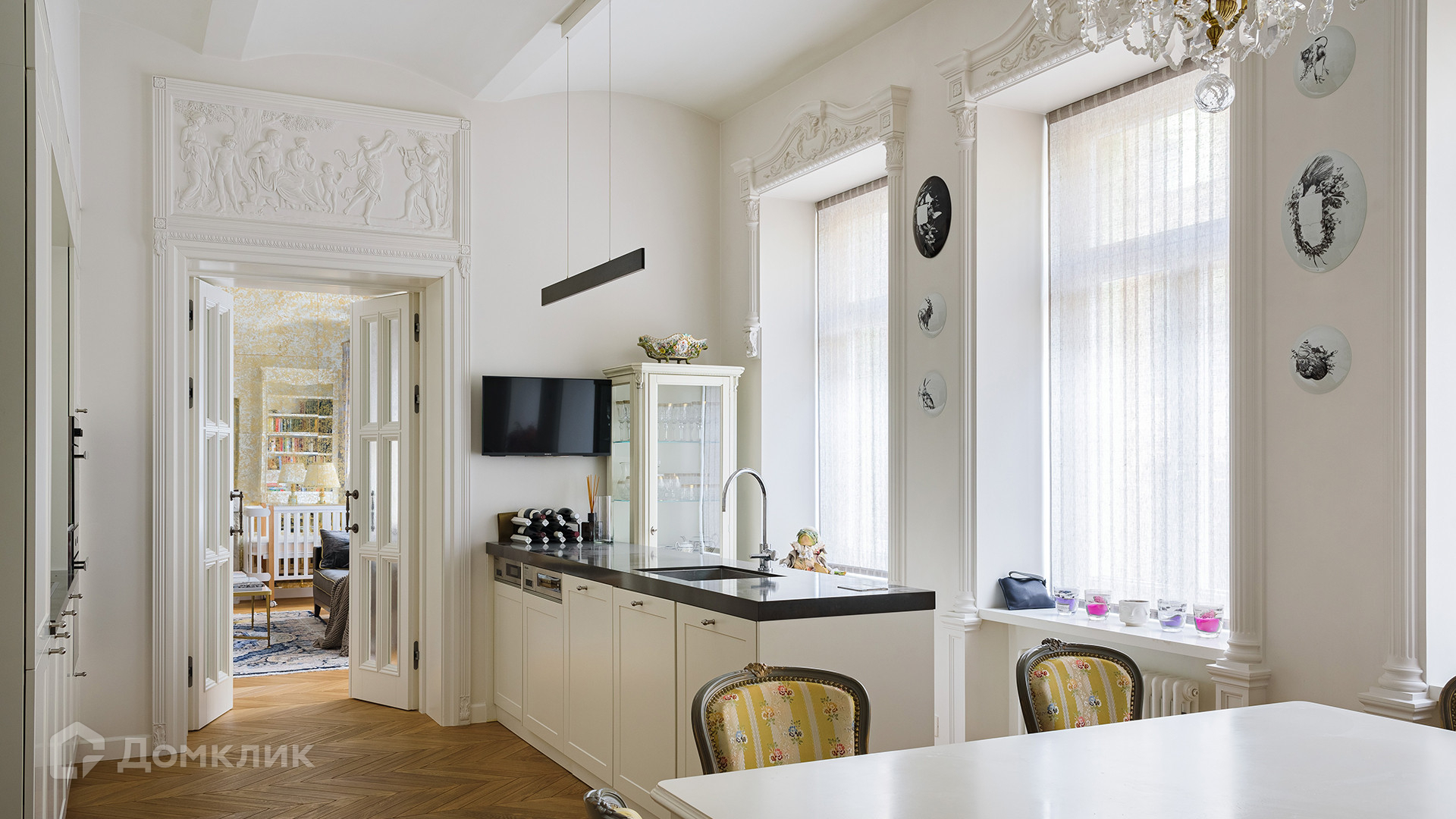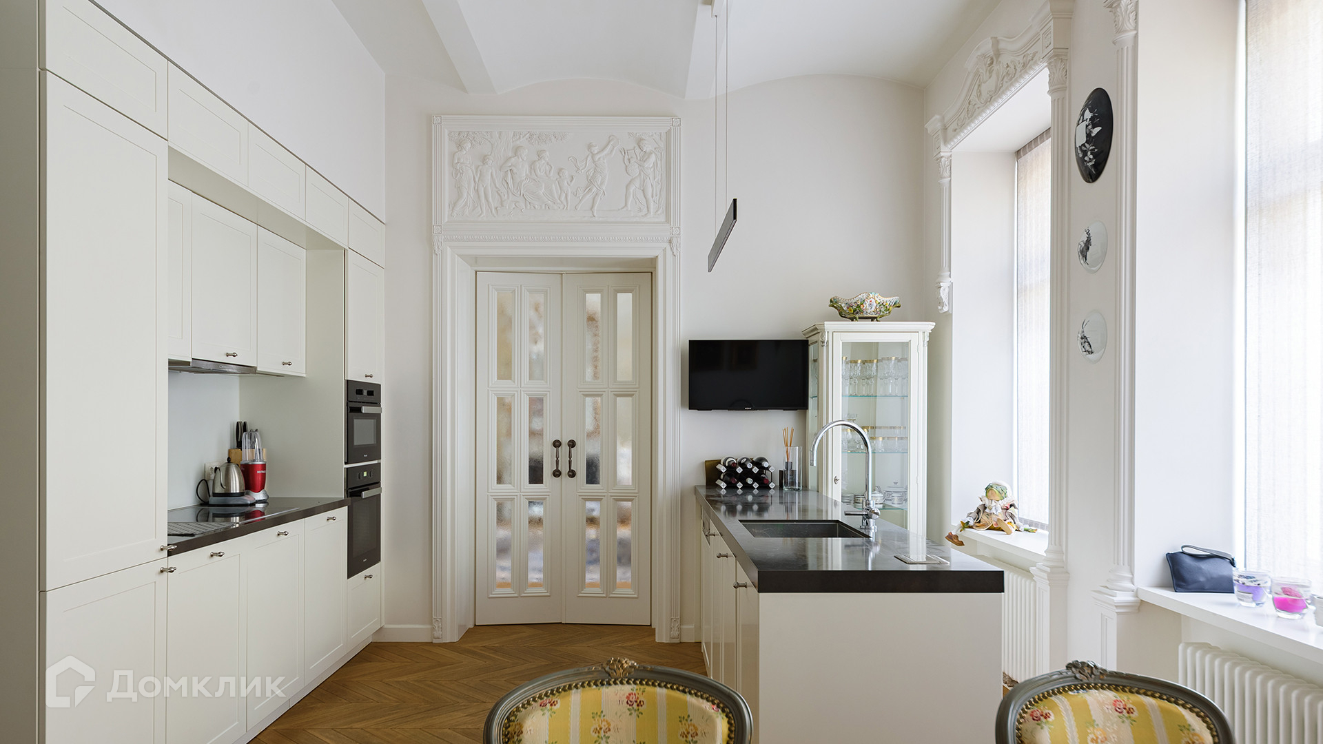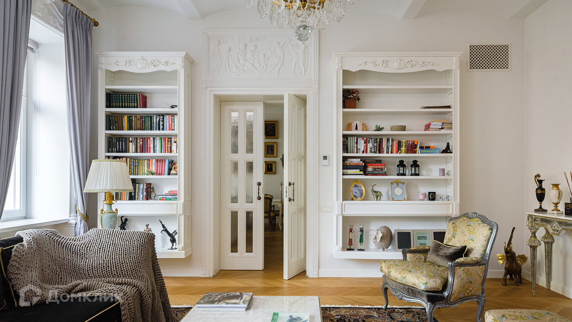 Светлый интерьер украшен лепниной и предметами искусства и антиквариата, на полу уложен паркет из натурального дерева.