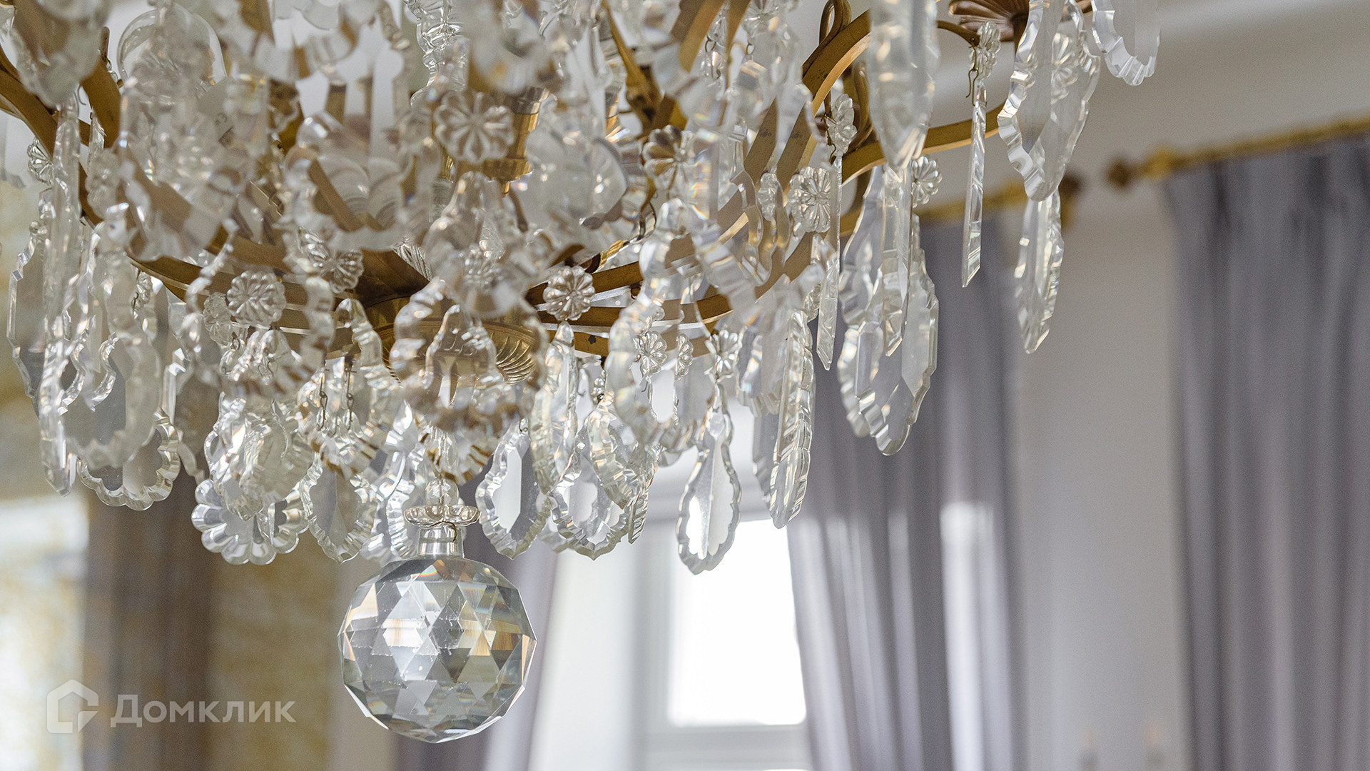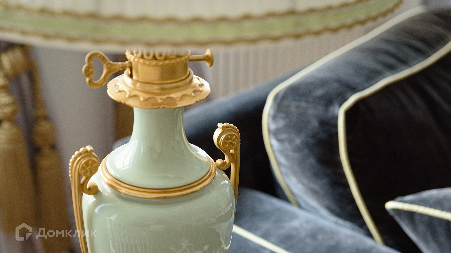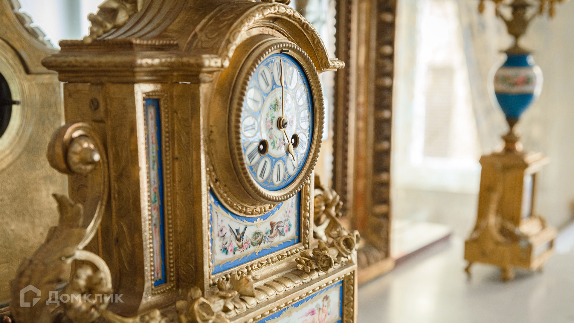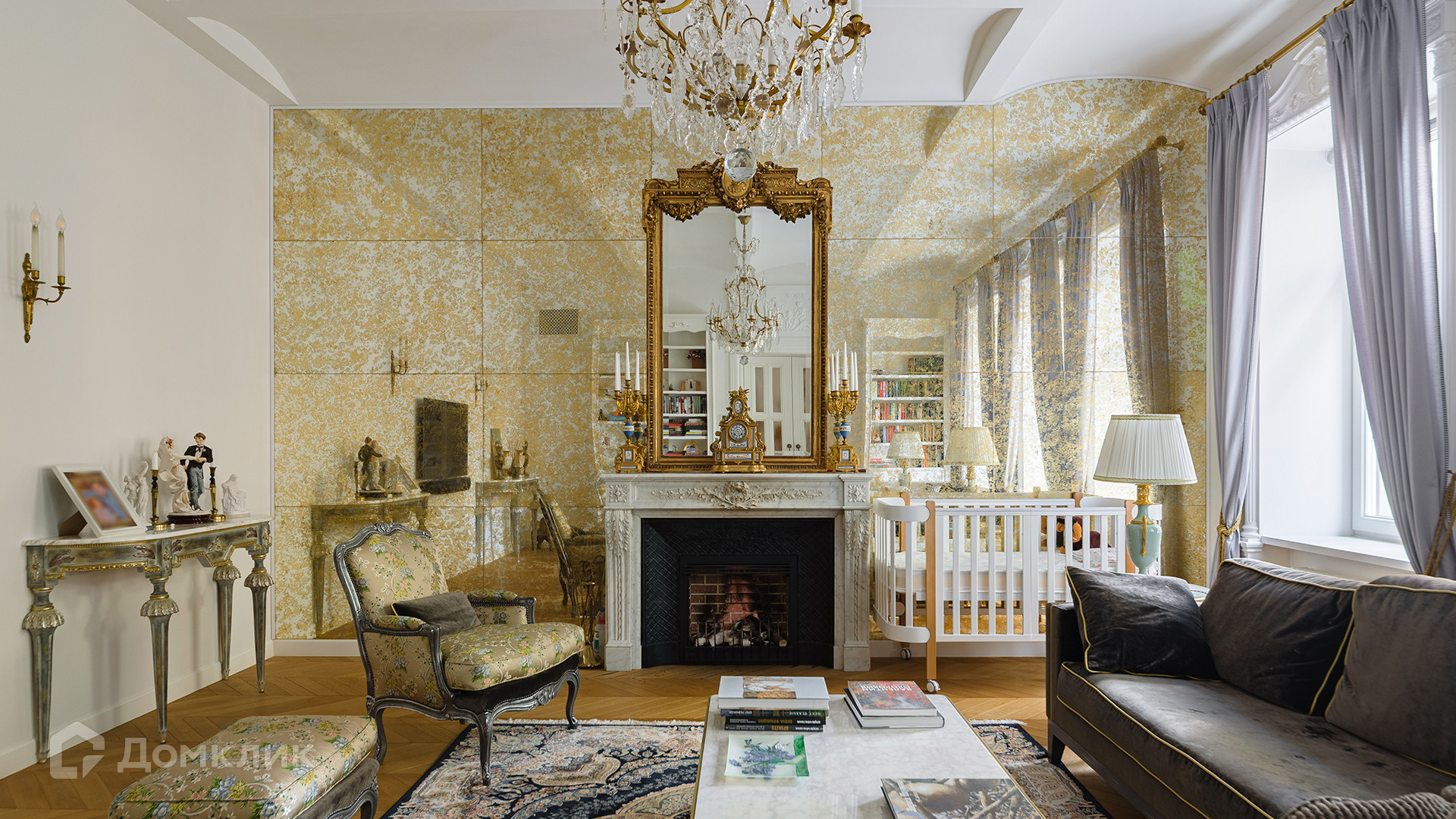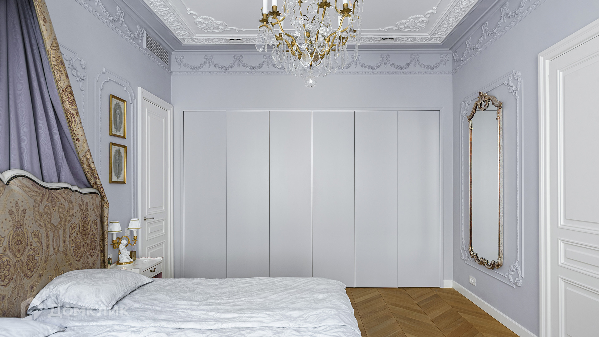 Светлый интерьер украшен лепниной и предметами искусства и антиквариата, на полу уложен паркет из натурального дерева.