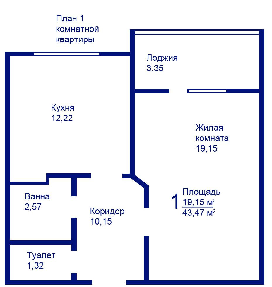 Общая площадь 43.7 м2