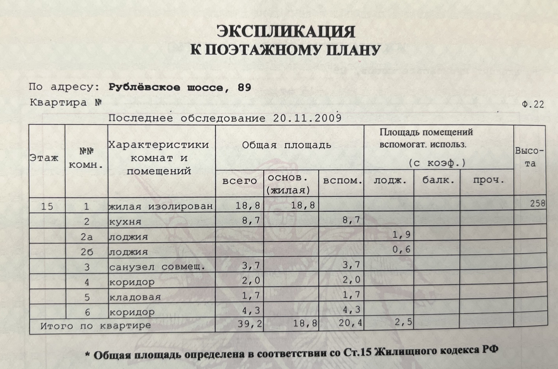 Общая площадь квартиры – 39,2 кв.м.: кухня – 8,7 кв.м.; жилая комната – 18,8 кв.м, утепленный лоджия – 2,5 кв.м.; Этаж – 15/22. Дом монолитный, 2009 г. постройки, типовая серия С - 222. В квартире выполнен качественный ремонт. Какие либо перепланировки – ОТСУТСТВУЮТ.