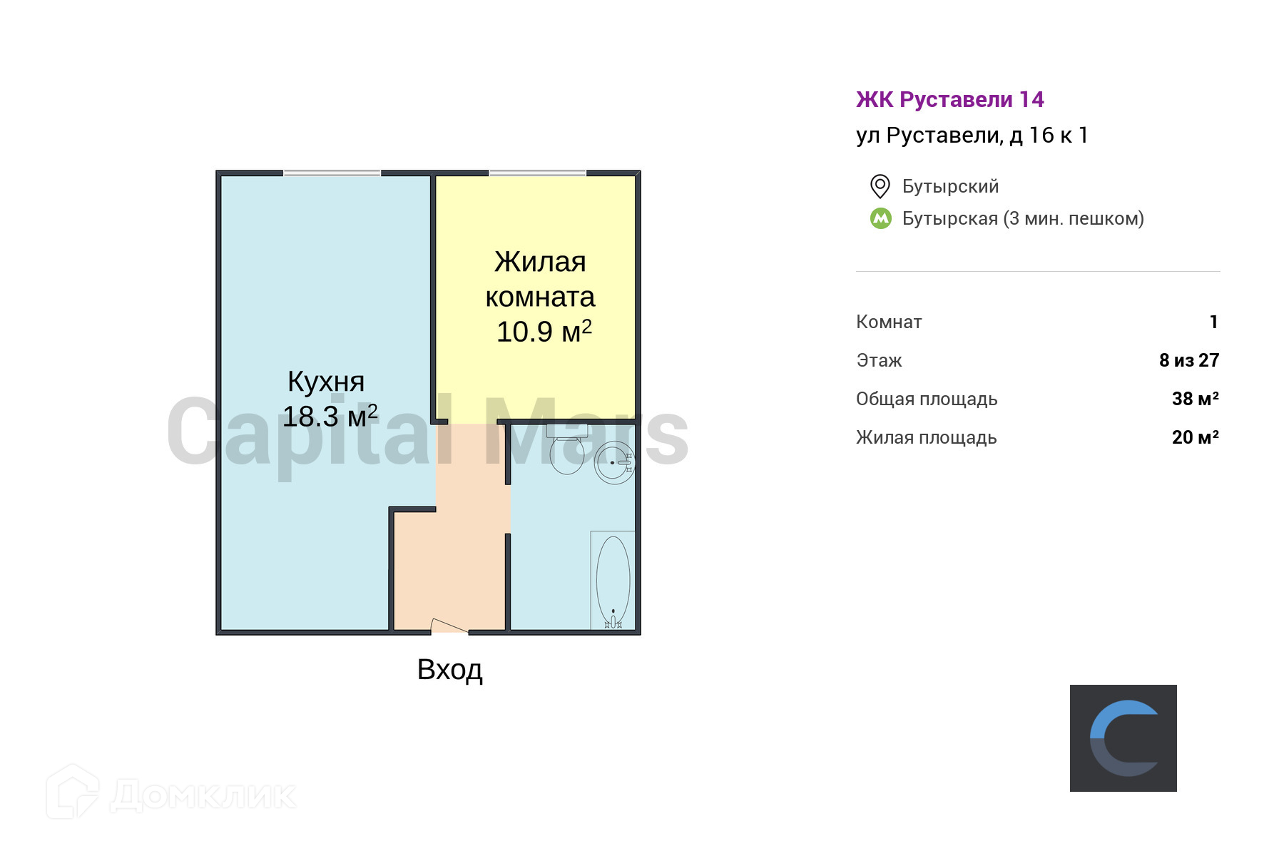 1-комнатная квартира, 38 м2, этаж 8 / 27, на продажу в Москве, улица Руставели, 16к1