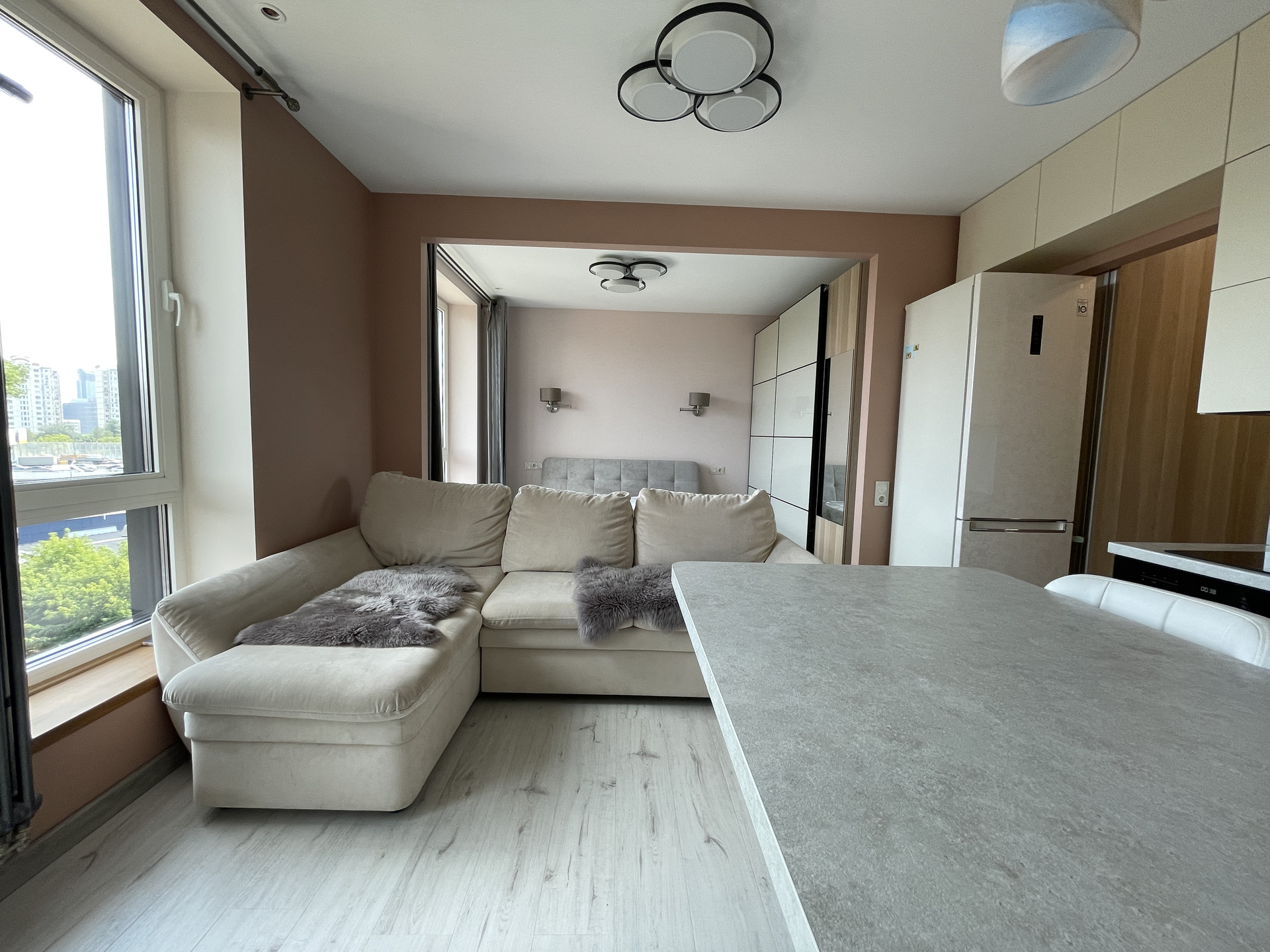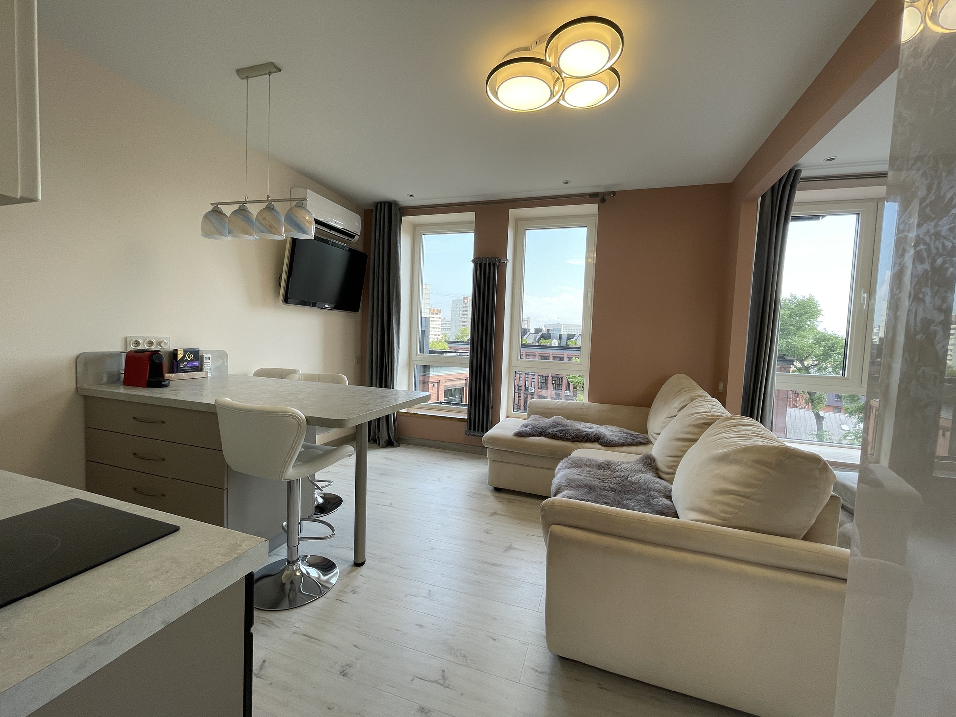 Ремонт выполнен из дорогостоящих материалов: встроенная мебель и двери по индивидуальному проекту, функциональная мебель, обеспечивающая комфорт при круглогодичном проживании. Квартира очень светлая благодаря французким окнам с глубокими подоконниками из натурального дуба. Окна выходят на арт квартал "Loft", что создает особую, теплую атмосферу. Зона спальни отделена от гостиной аркой, в которую в проекте вставала легкая раздвижная система или как альтернатива - тяжелые шторы. В спальне и прихожей установлены емкие и функциональные раздвижные шкафы, способные обеспечить хранение всего необходимого для постоянного проживания семьи.
