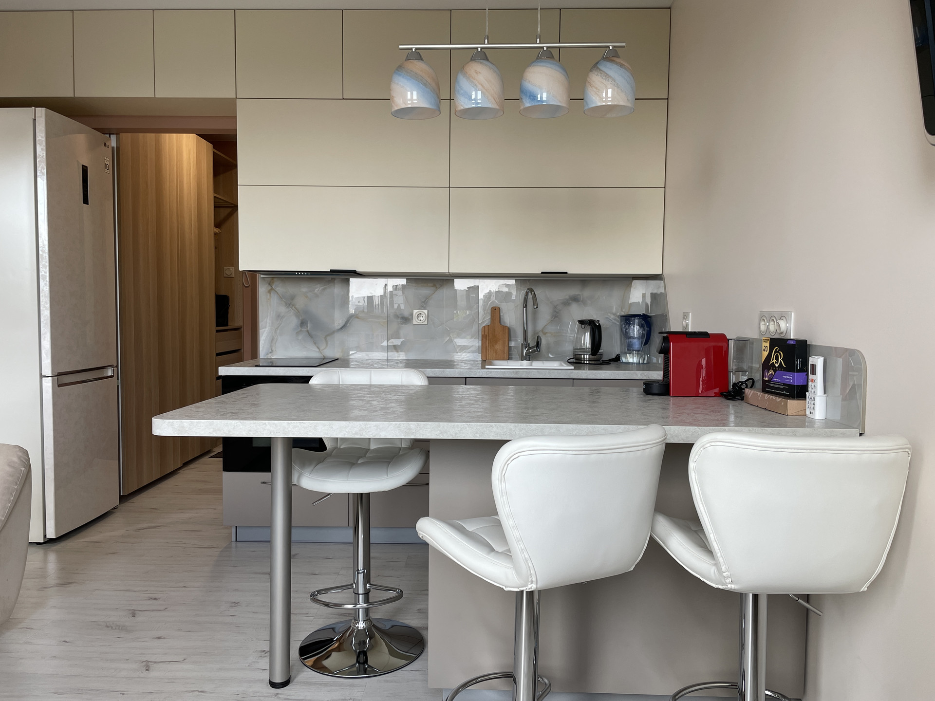 Зона кухни так же глубоко продумана и функциональна, барный стол удобно использовать и как рабочий стол и как место для посиделок с друзьями.