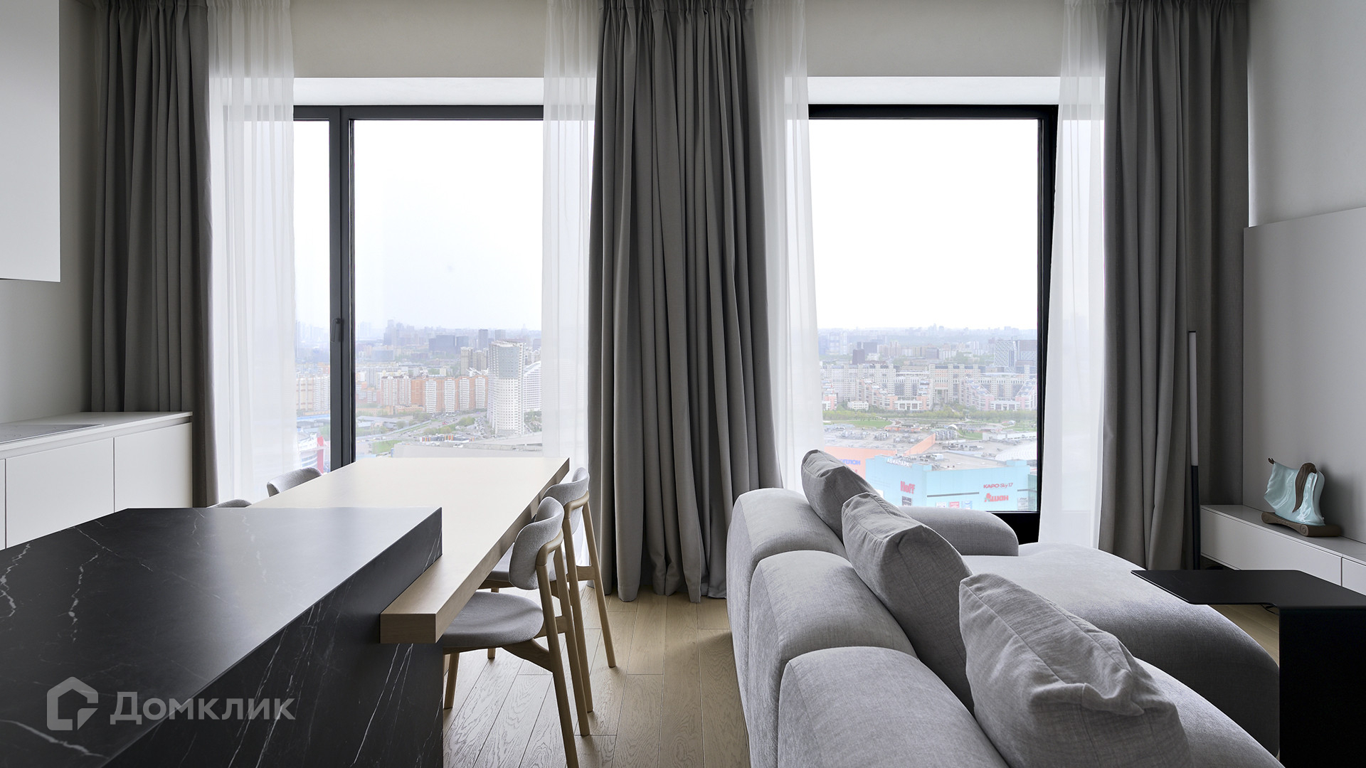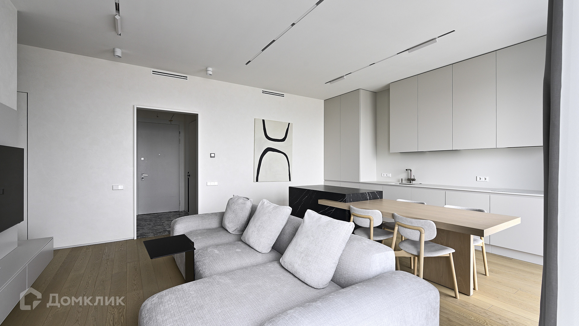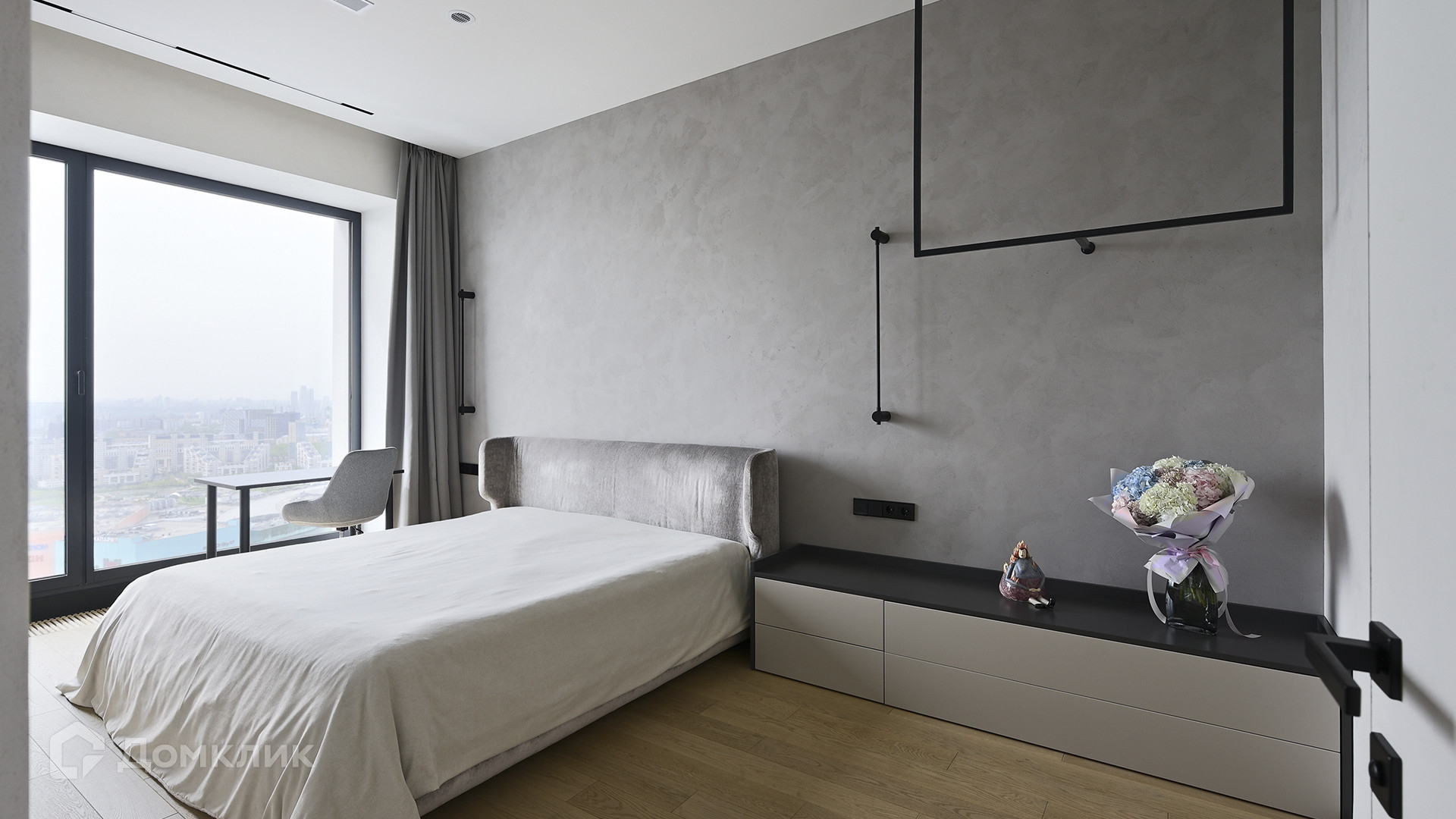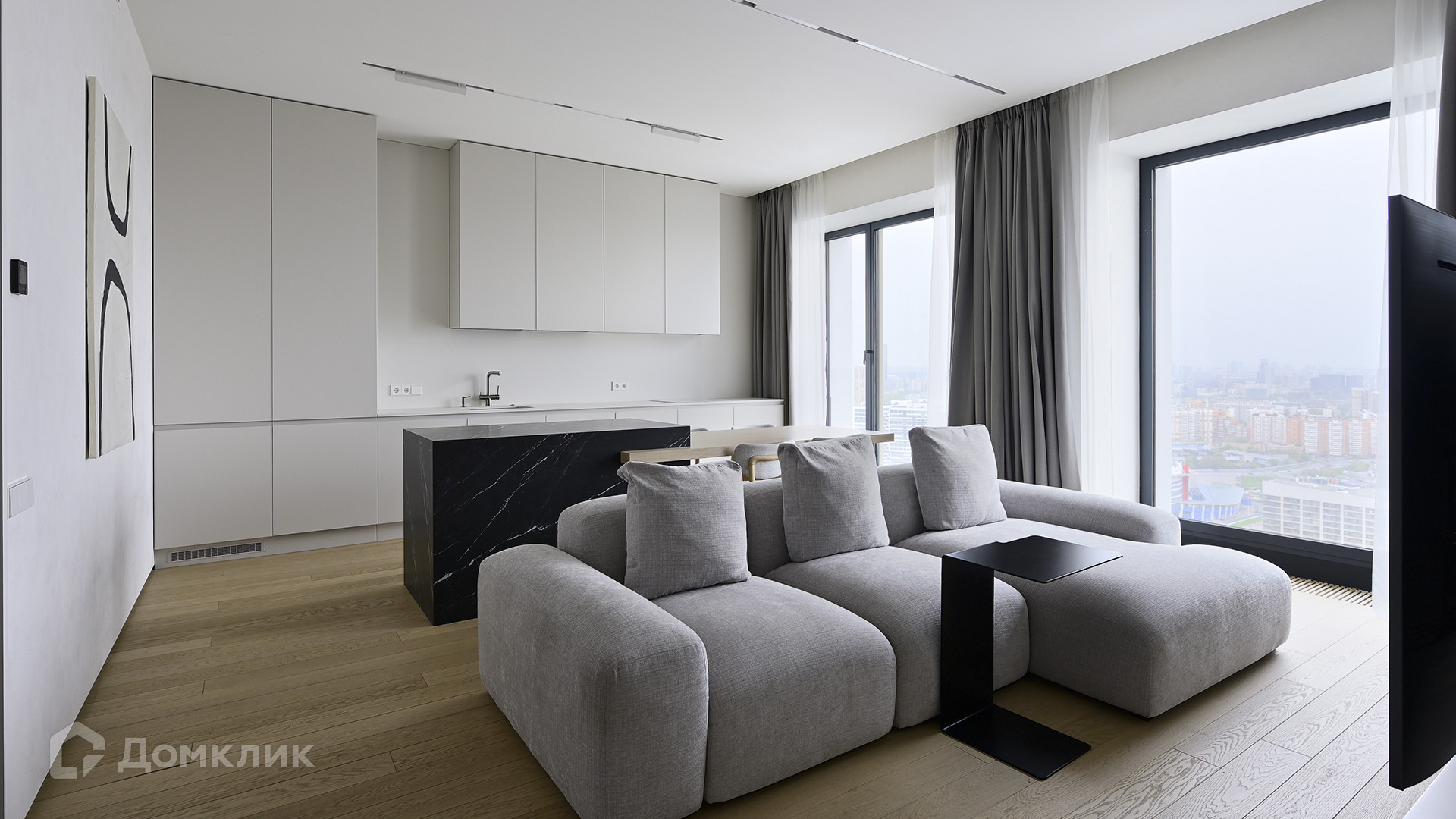 Планировка: кухня-гостиная, мастер-спальня с собственной гардеробной и душевой комнатой, вторая спальня, ванная комната, гардеробная с зоной постирочной, прихожая. Благодаря панорамному остеклению пространство наполнено естественным светом, открываются виды на Ходынский бульвар и на деловой центр «Москва-Сити».