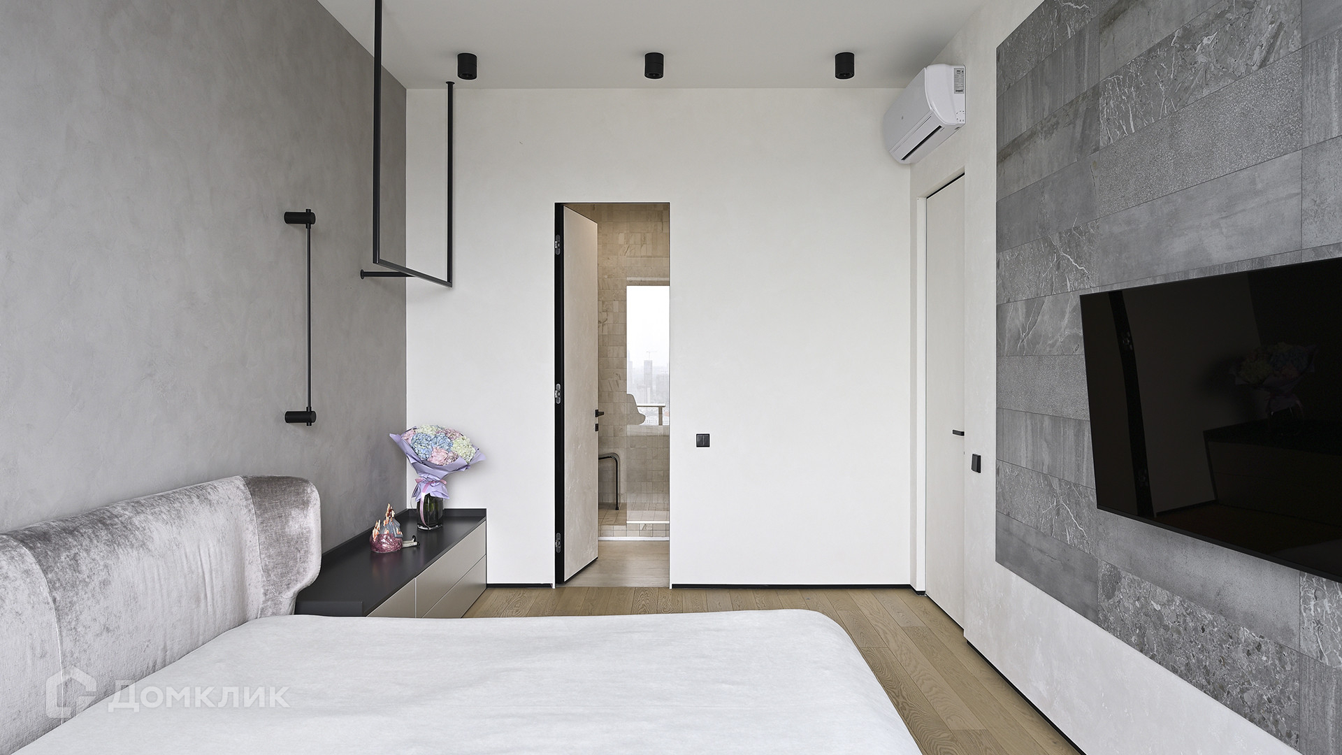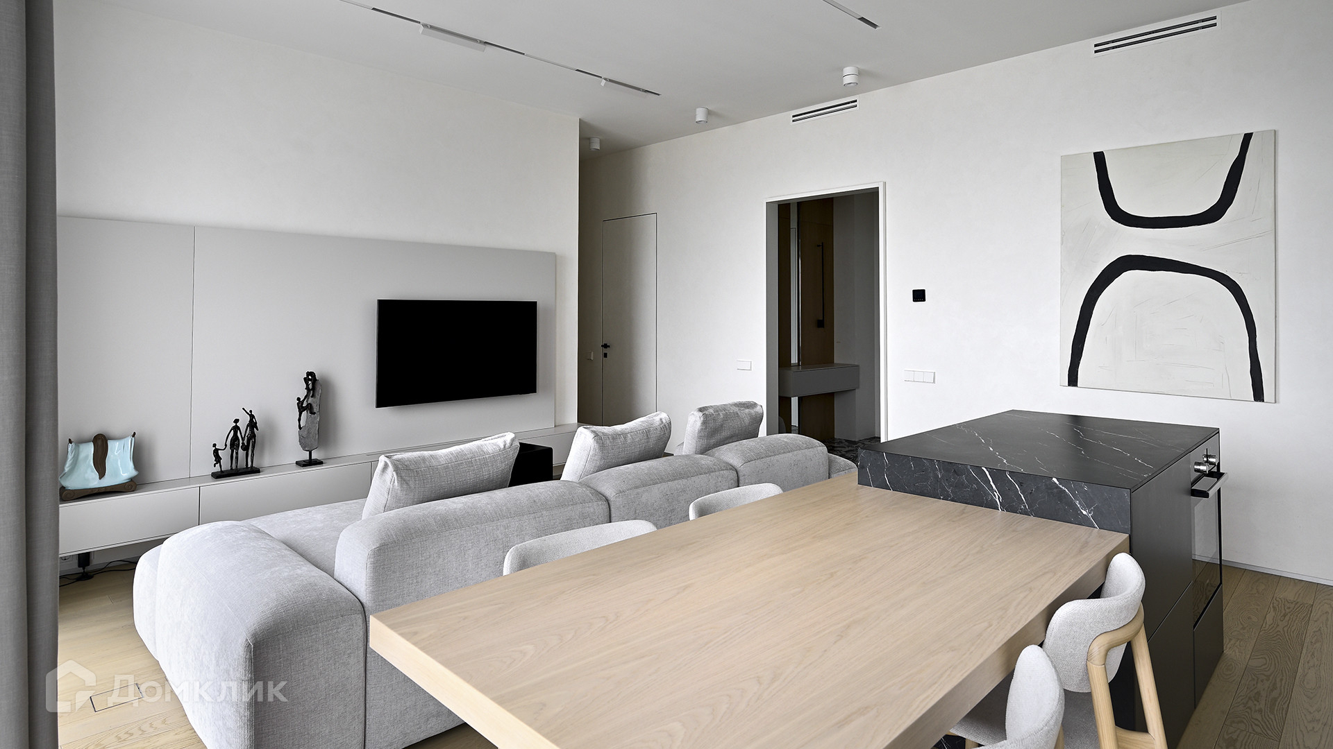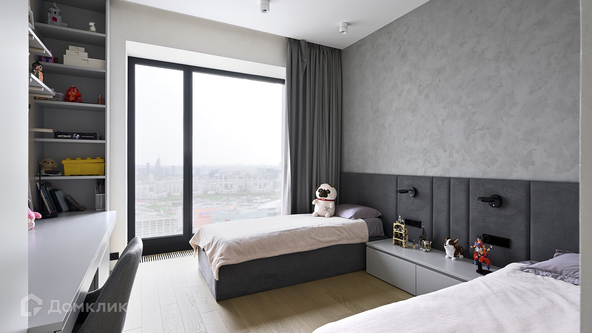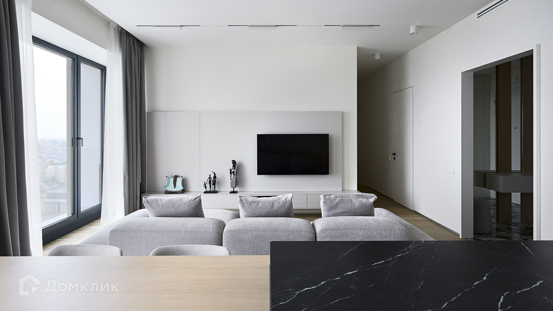 Планировка: кухня-гостиная, мастер-спальня с собственной гардеробной и душевой комнатой, вторая спальня, ванная комната, гардеробная с зоной постирочной, прихожая. Благодаря панорамному остеклению пространство наполнено естественным светом, открываются виды на Ходынский бульвар и на деловой центр «Москва-Сити».