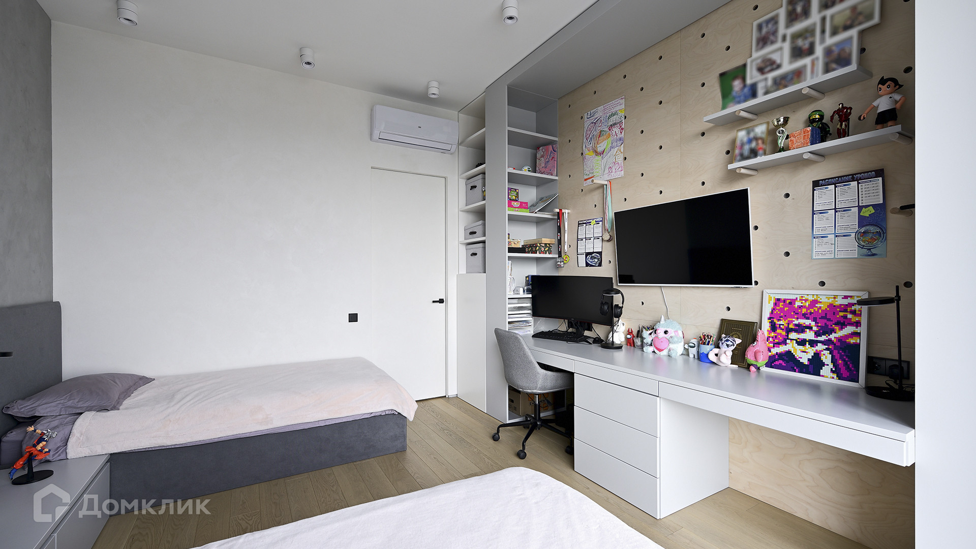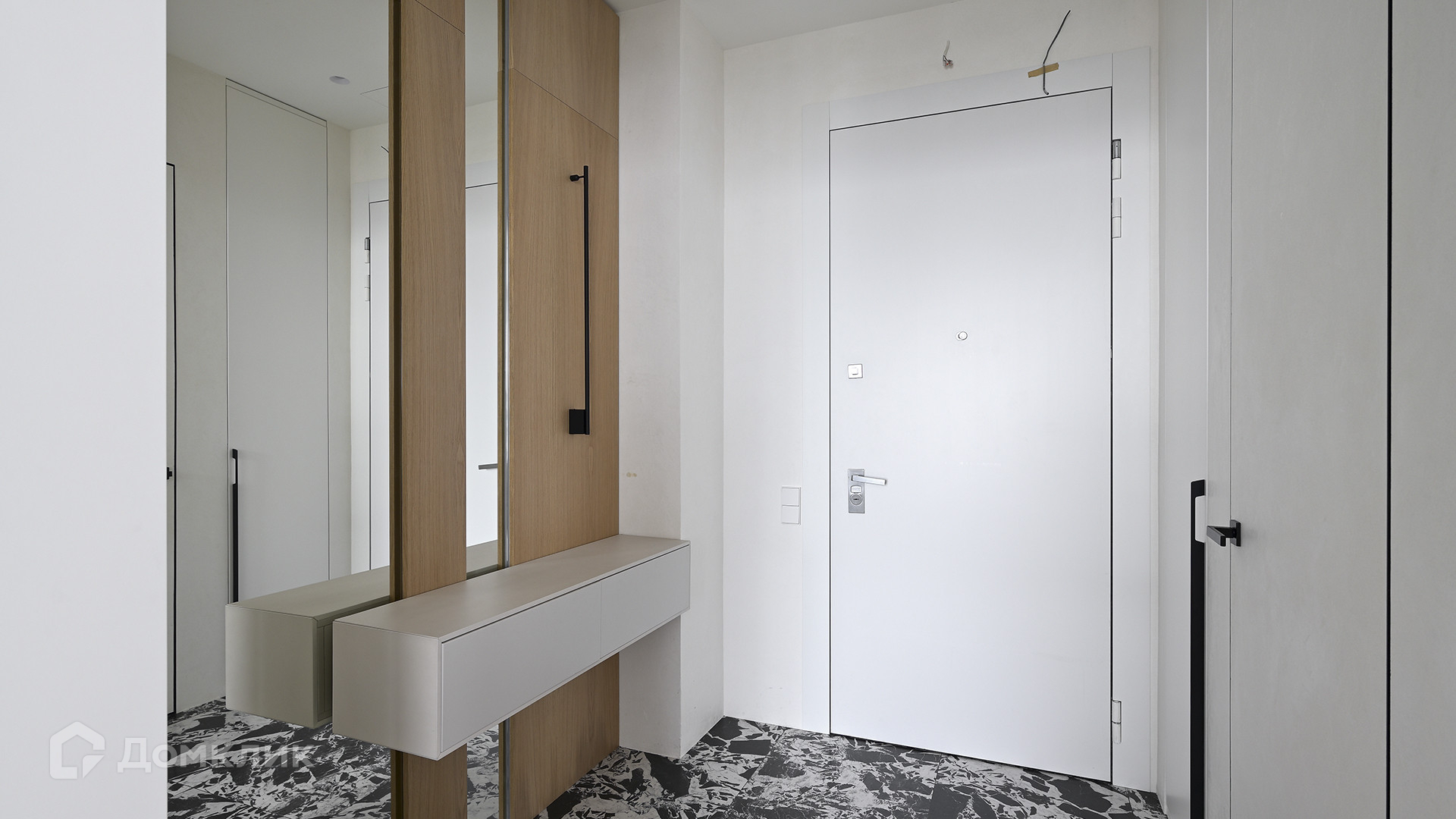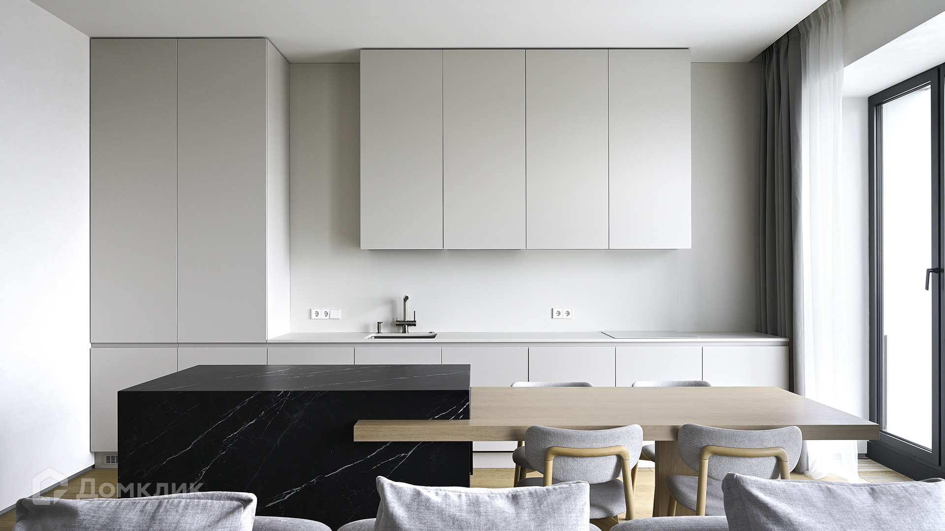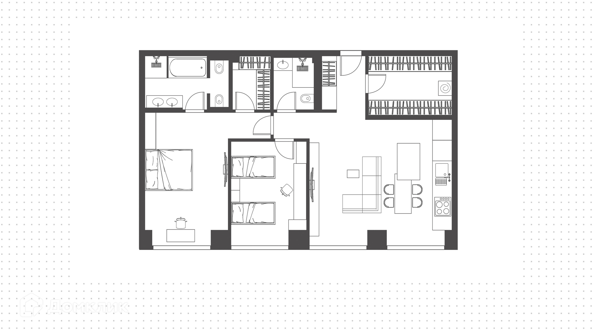 Планировка: кухня-гостиная, мастер-спальня с собственной гардеробной и душевой комнатой, вторая спальня, ванная комната, гардеробная с зоной постирочной, прихожая. Благодаря панорамному остеклению пространство наполнено естественным светом, открываются виды на Ходынский бульвар и на деловой центр «Москва-Сити».