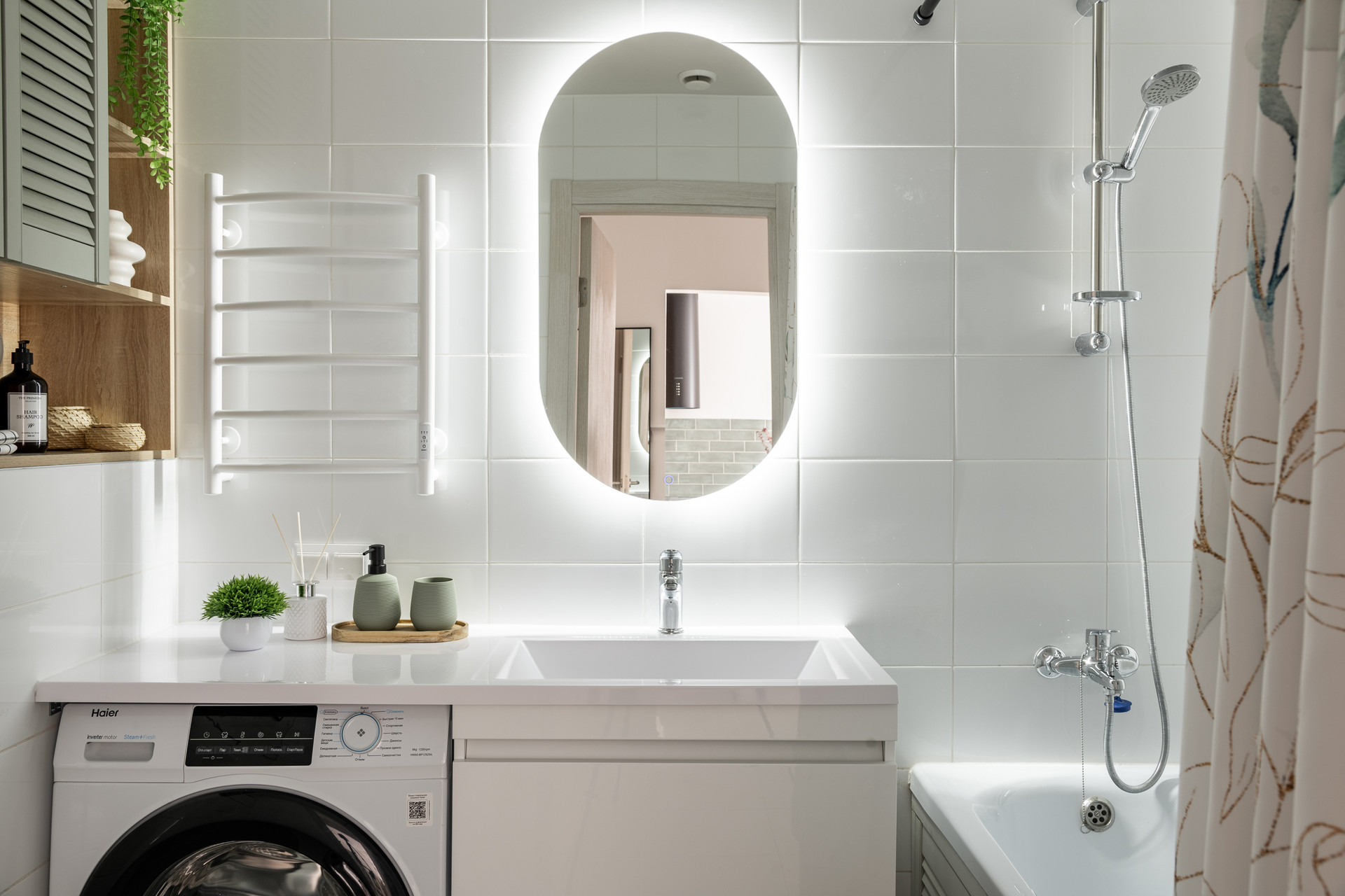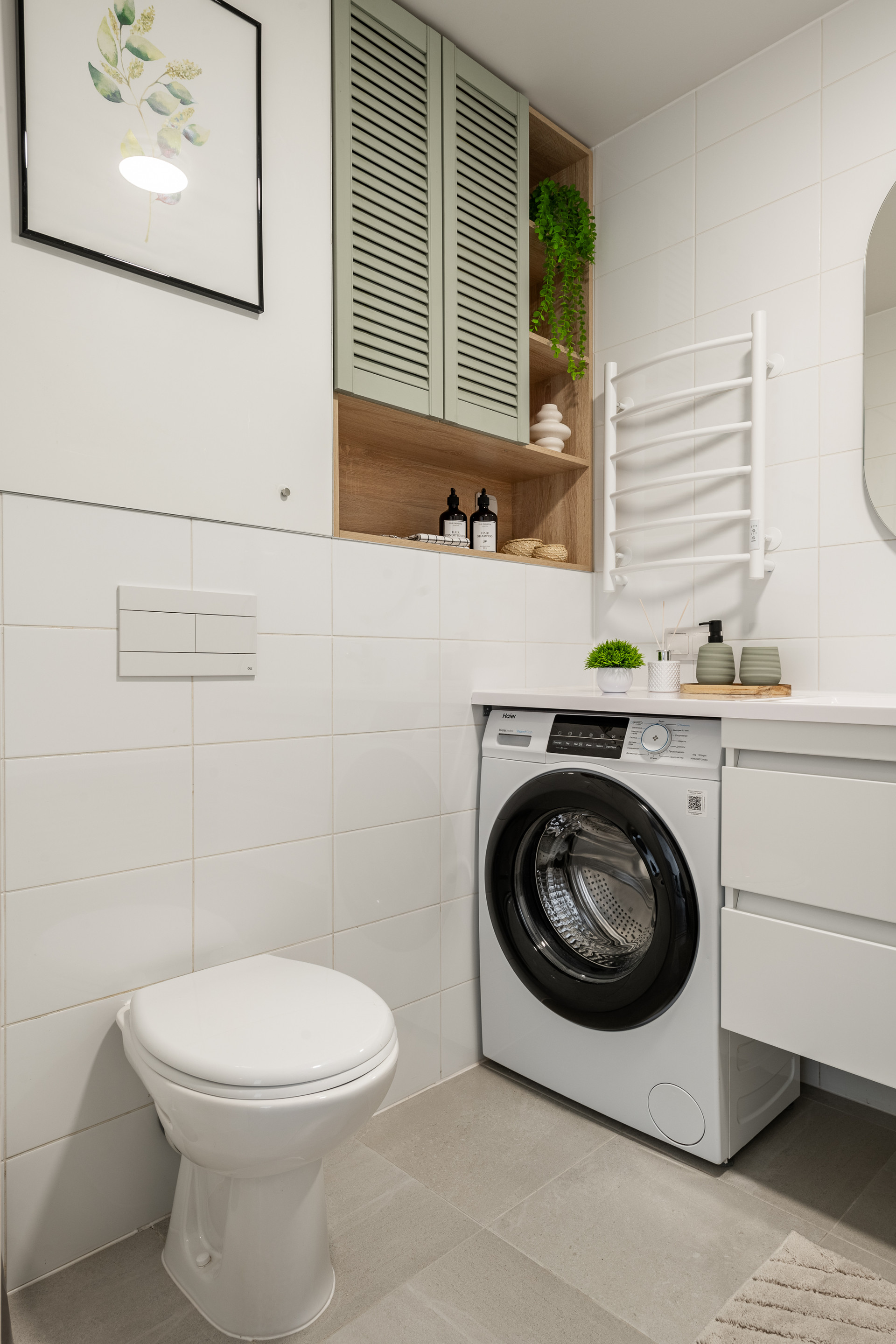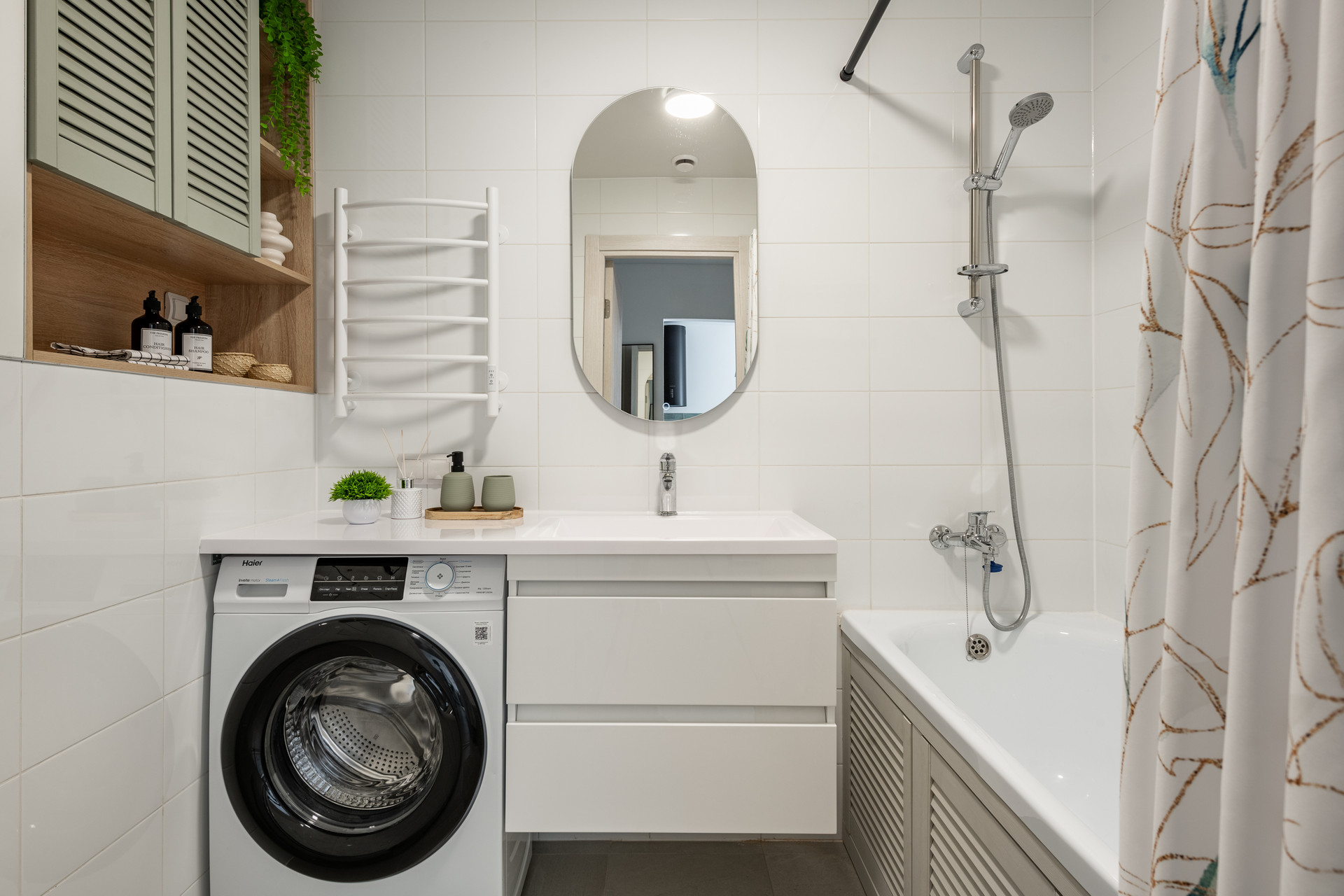 Квартира готова к проживанию без дополнительных вложений. Полностью меблирована и укомплектована современной премиальной техникой Haier, включая посудомоечную машину.