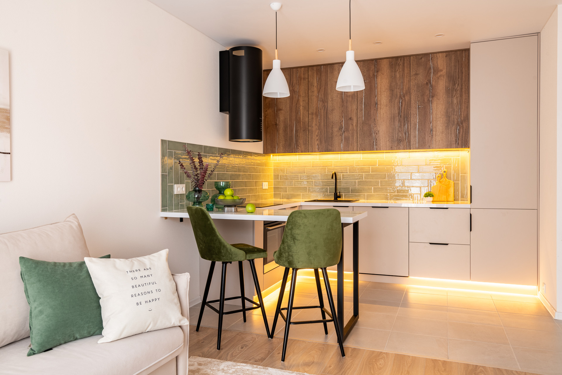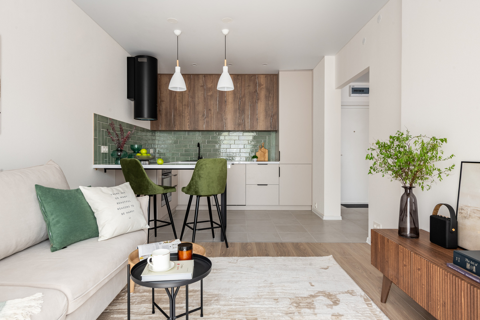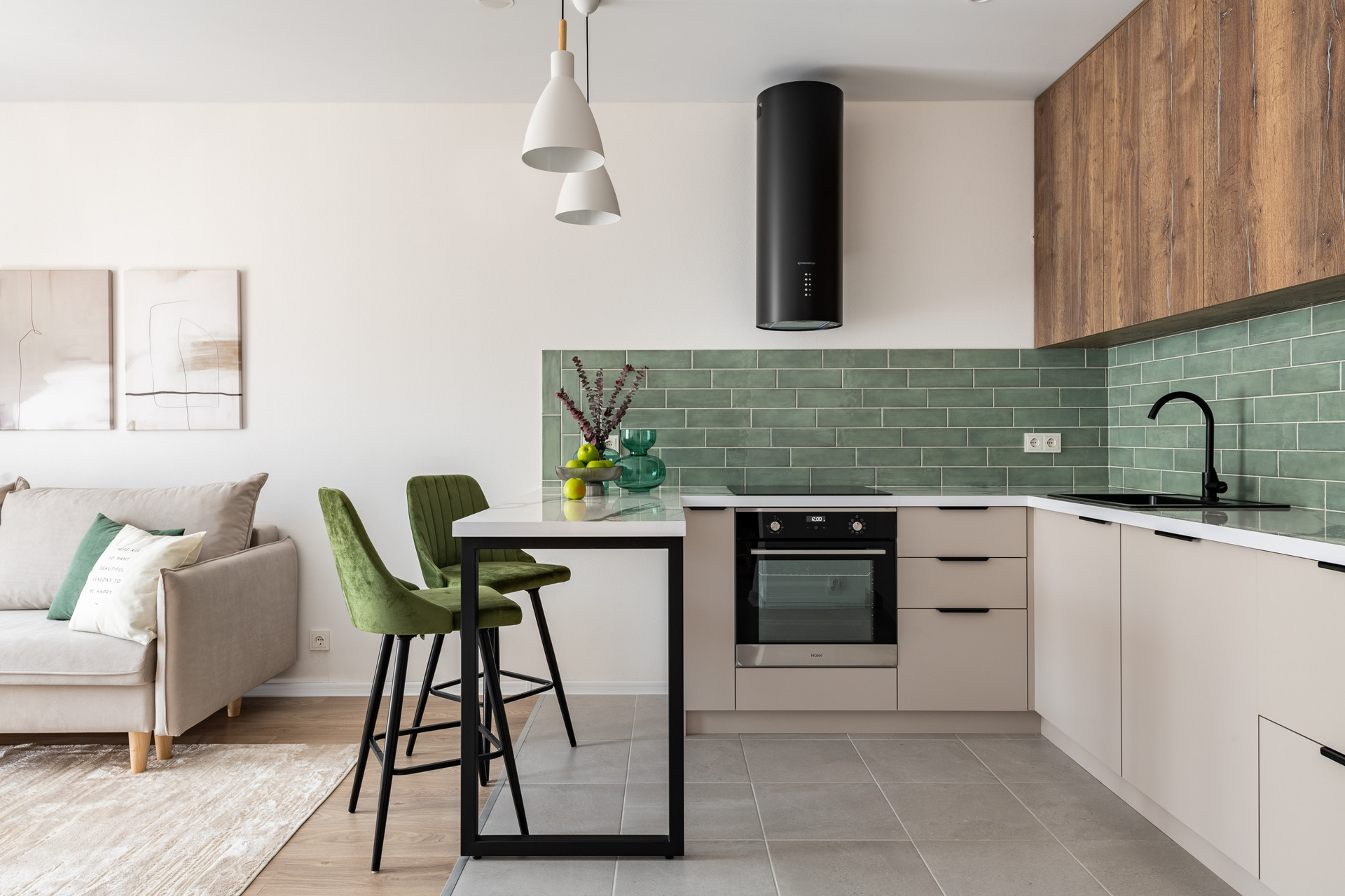 Квартира готова к проживанию без дополнительных вложений. Полностью меблирована и укомплектована современной премиальной техникой Haier, включая посудомоечную машину.