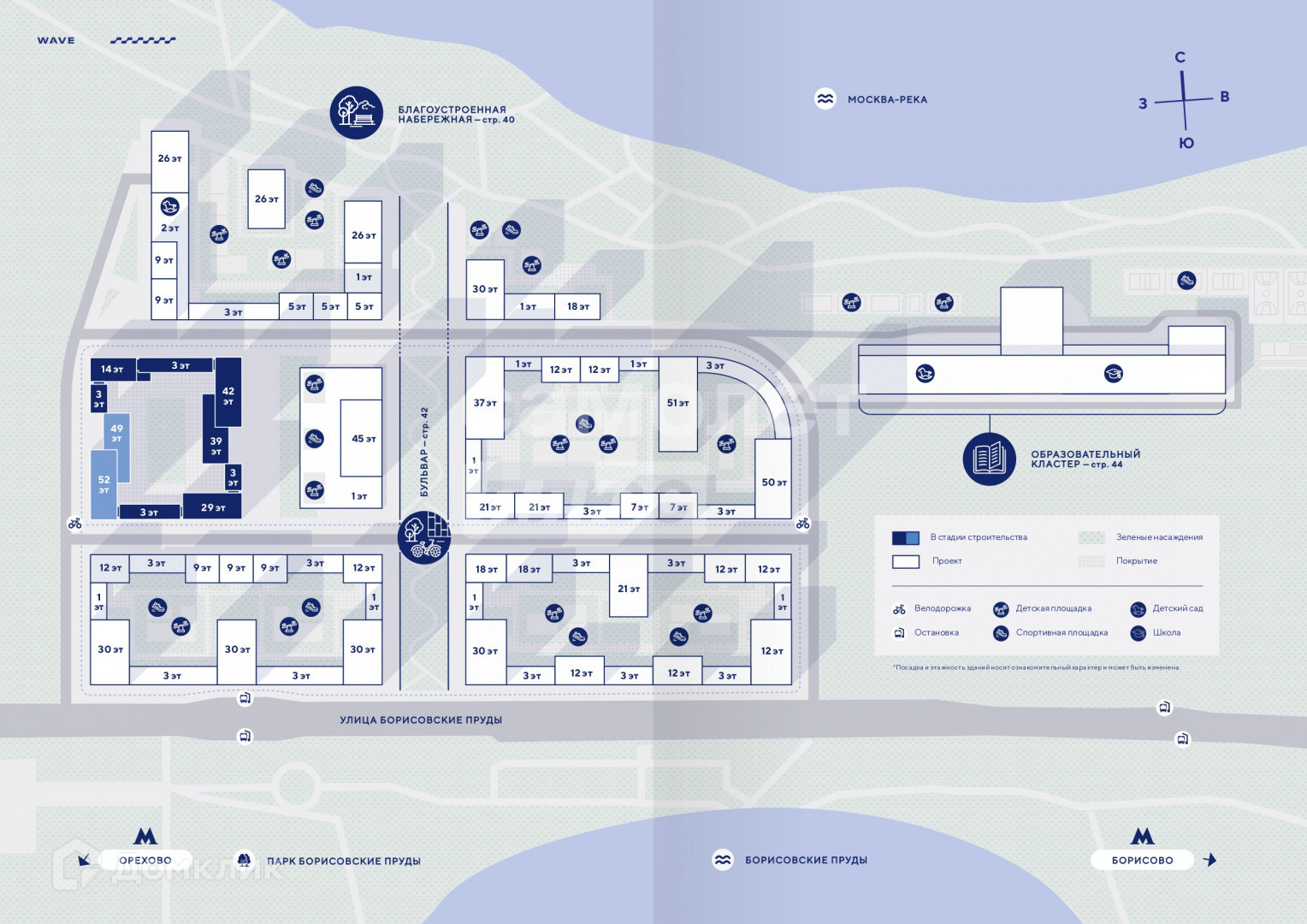 В первой очереди планируется строительство четырех домов бизнес-класса от 14 до 52 этажей. Ключевым преимуществом WAVE является благоустроенная набережная со смотровой площадкой и причалом «Волна». В центре квартала появится зеленый бульвар с детскими и спортивными площадками. Также в WAVE запроектированы детский сад на 250 мест и школа на 925 мест.