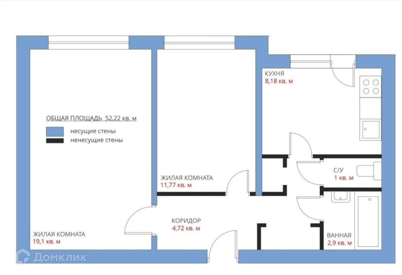 Общая площадь 52,2 кв.м.