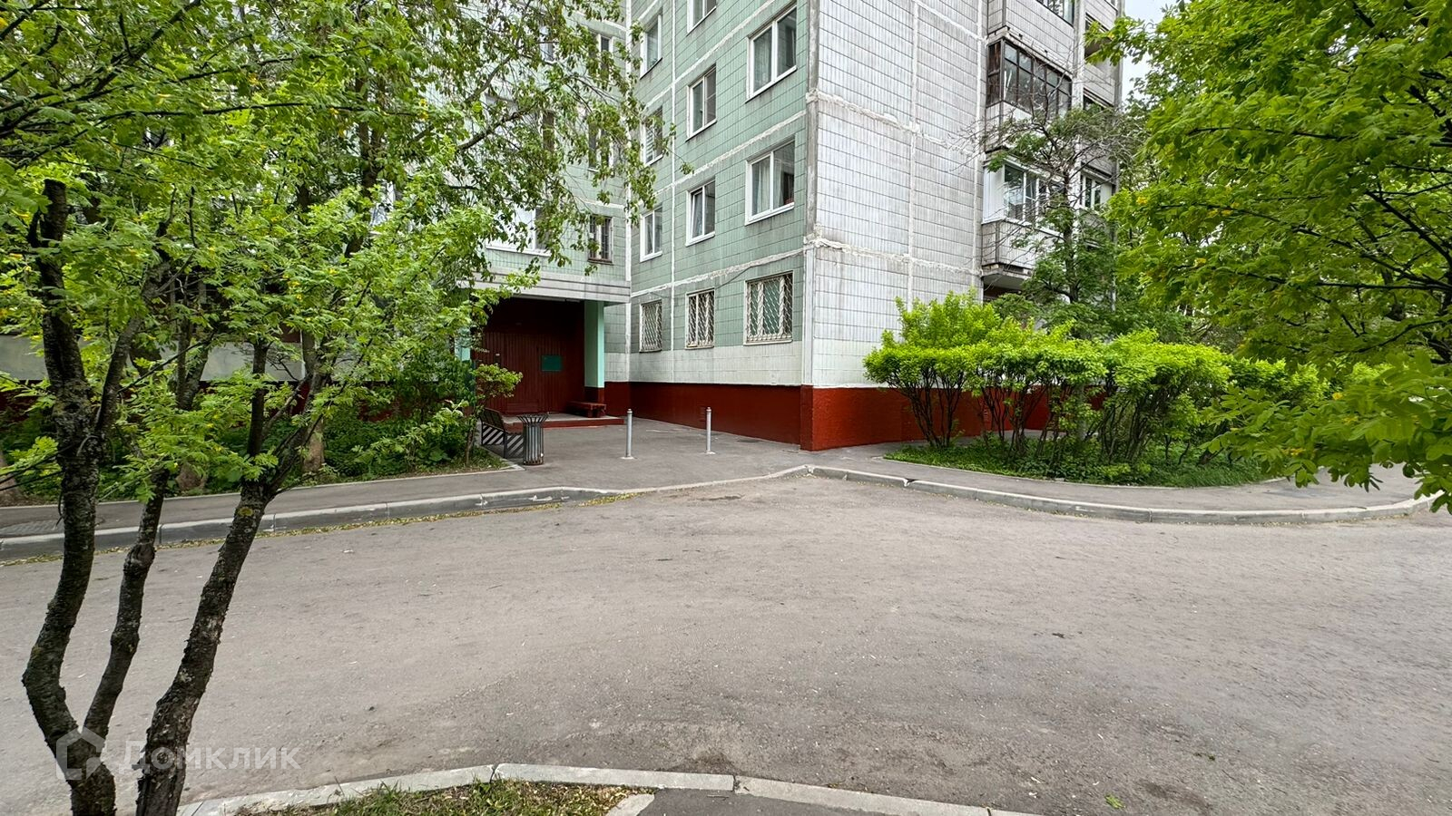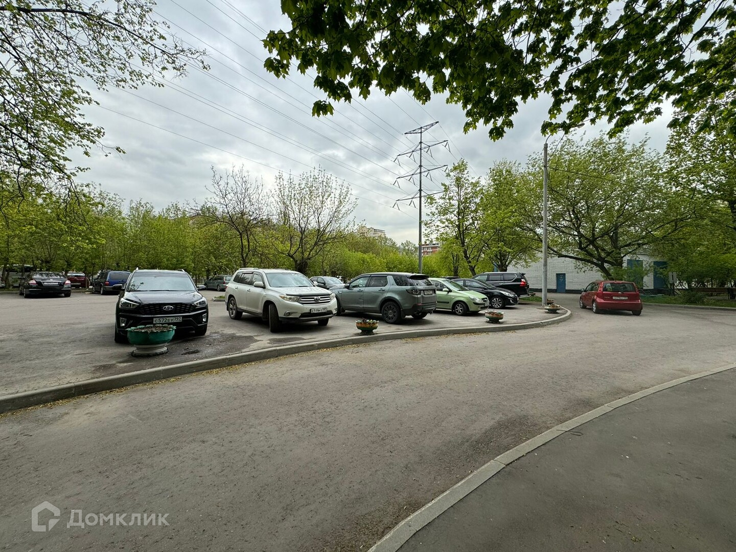 Большая парковка перед домом с массой свободных мест, шлагбаум на въезд.