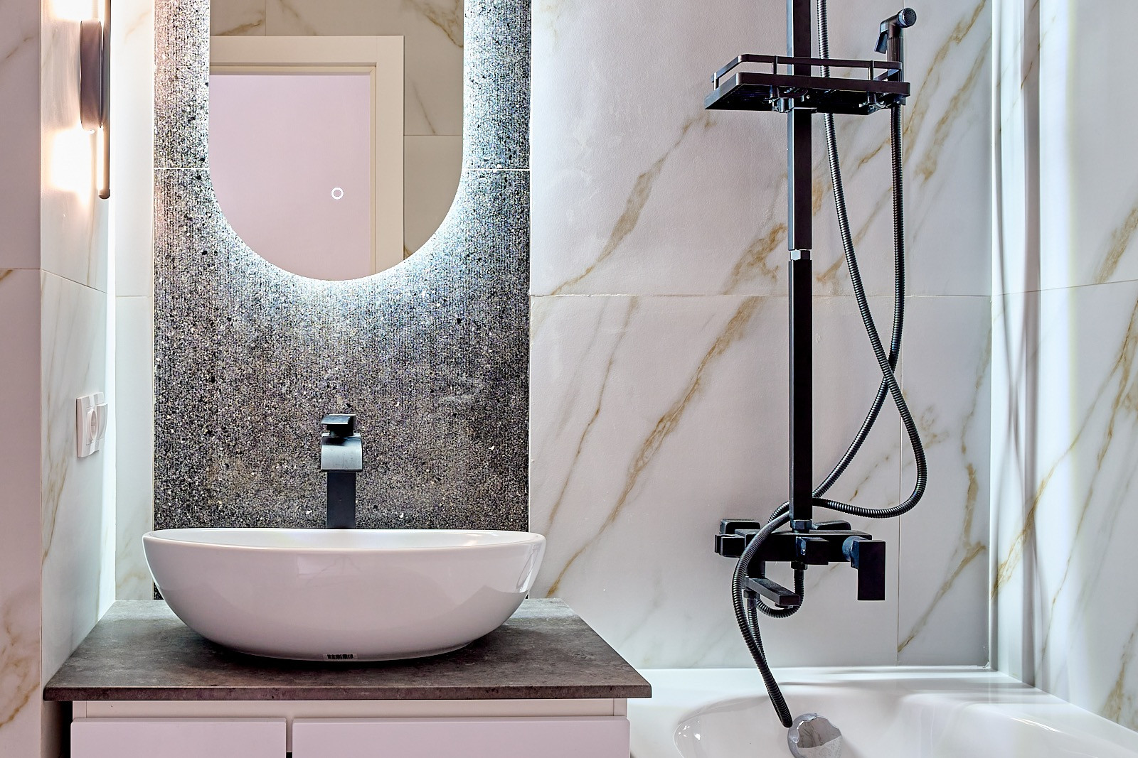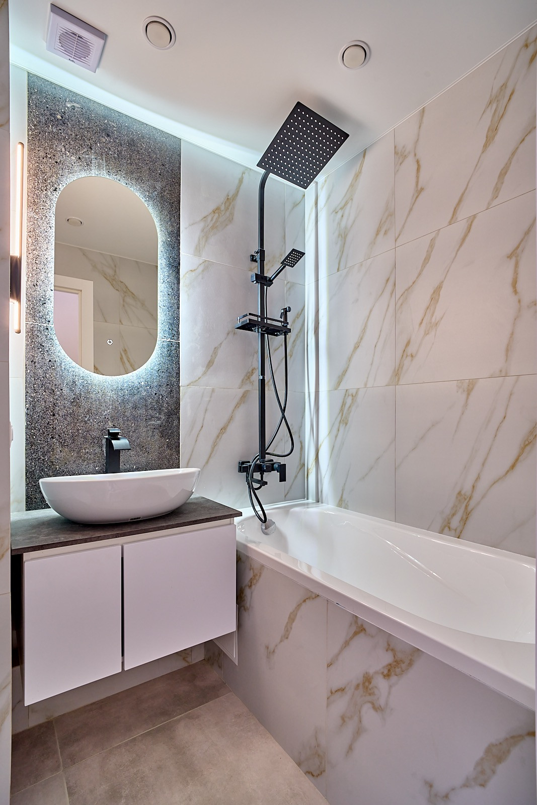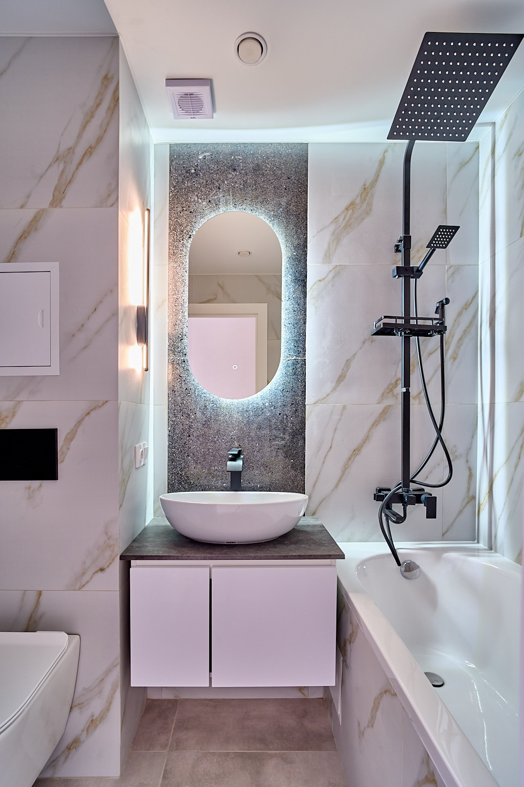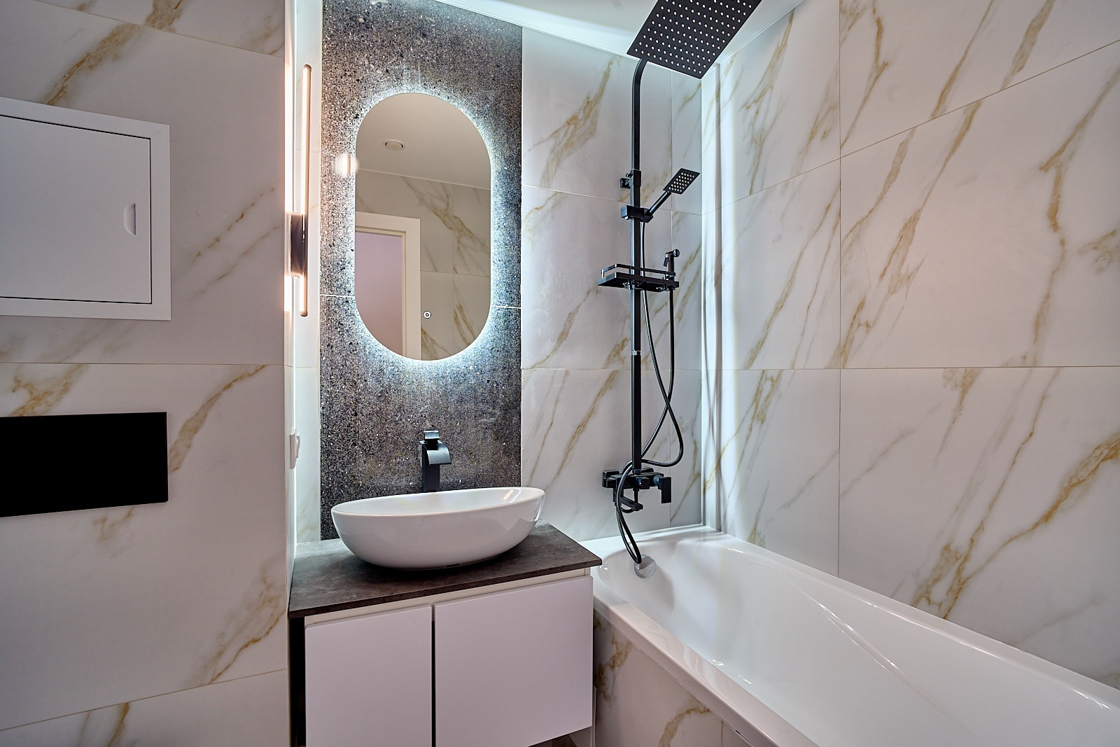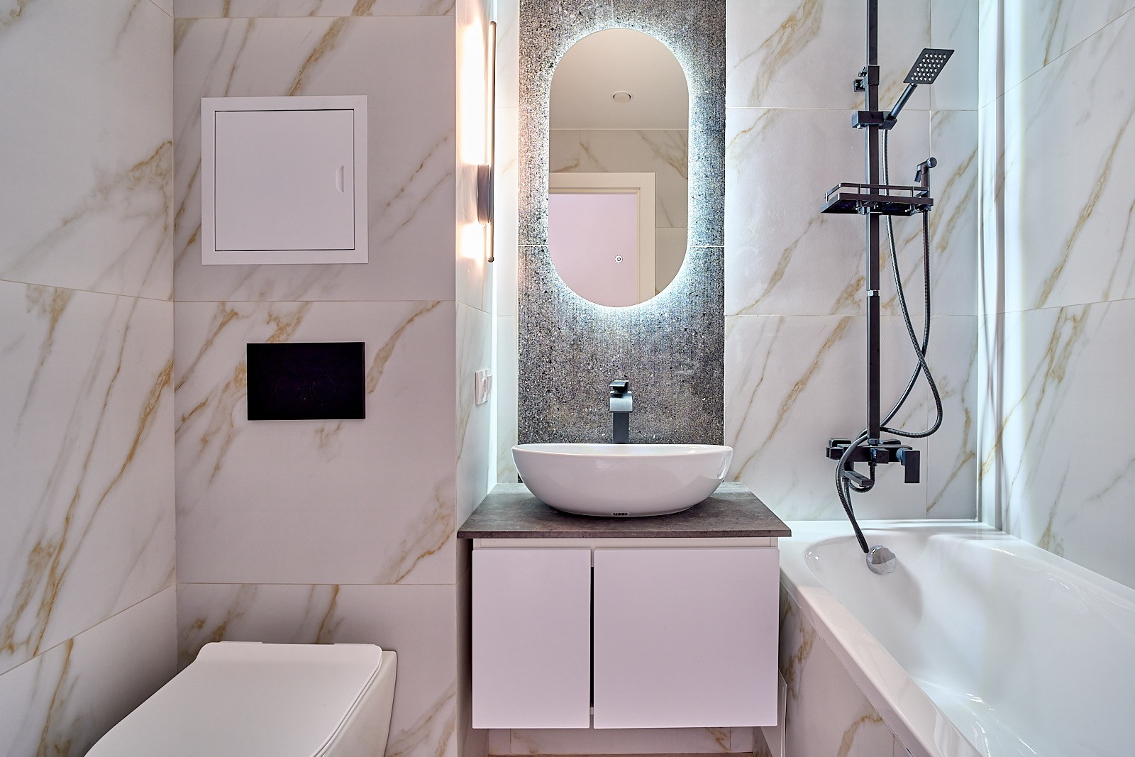 В ванной комнате полноценная ванна, инсталляция.
