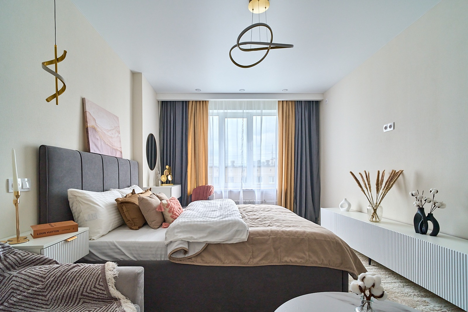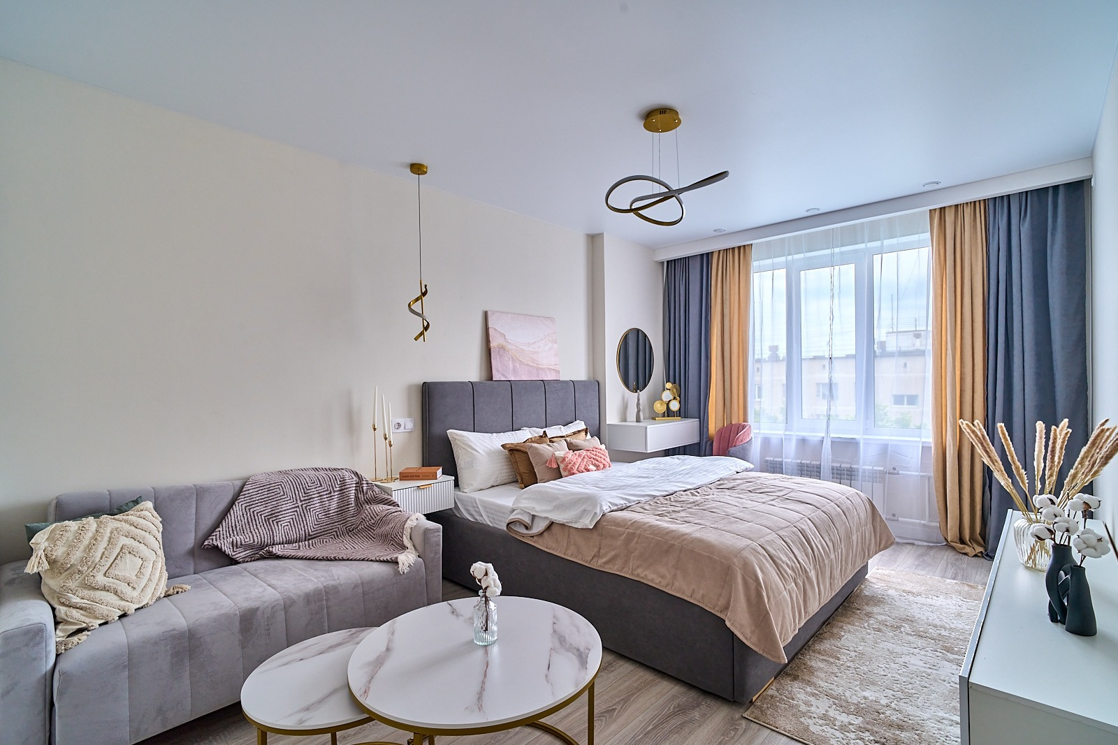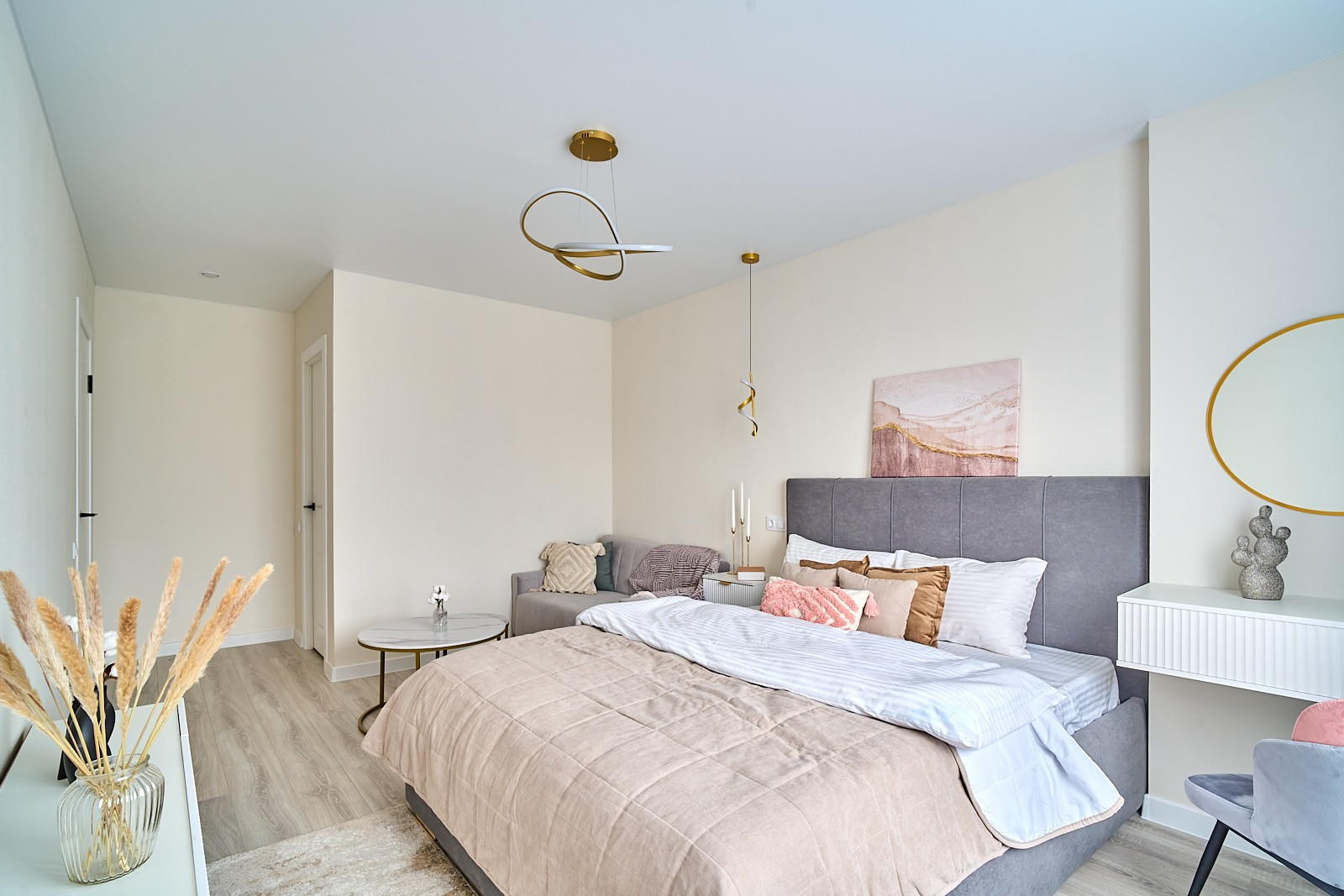 В квартире все новое. в комнате двуспальная кровать, диван с раскладывающимся механизмом, гардеробная комната с системой хранения.