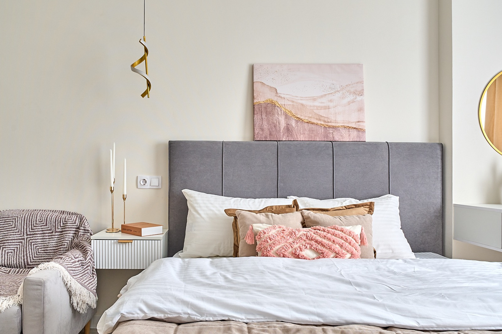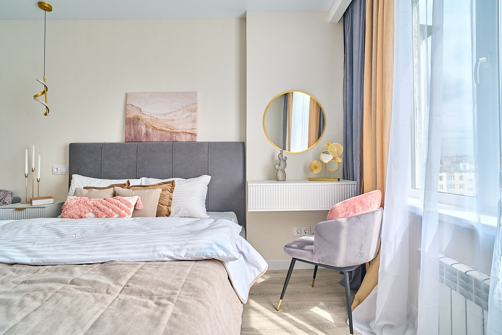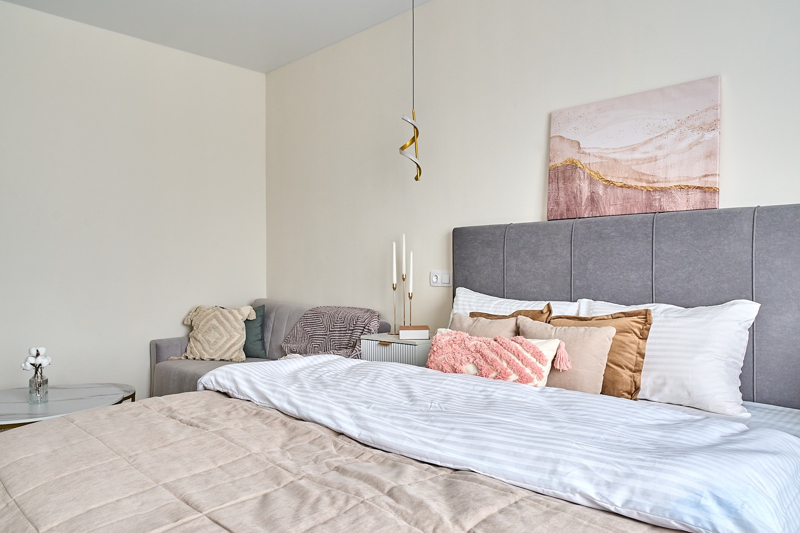В квартире все новое. в комнате двуспальная кровать, диван с раскладывающимся механизмом, гардеробная комната с системой хранения.