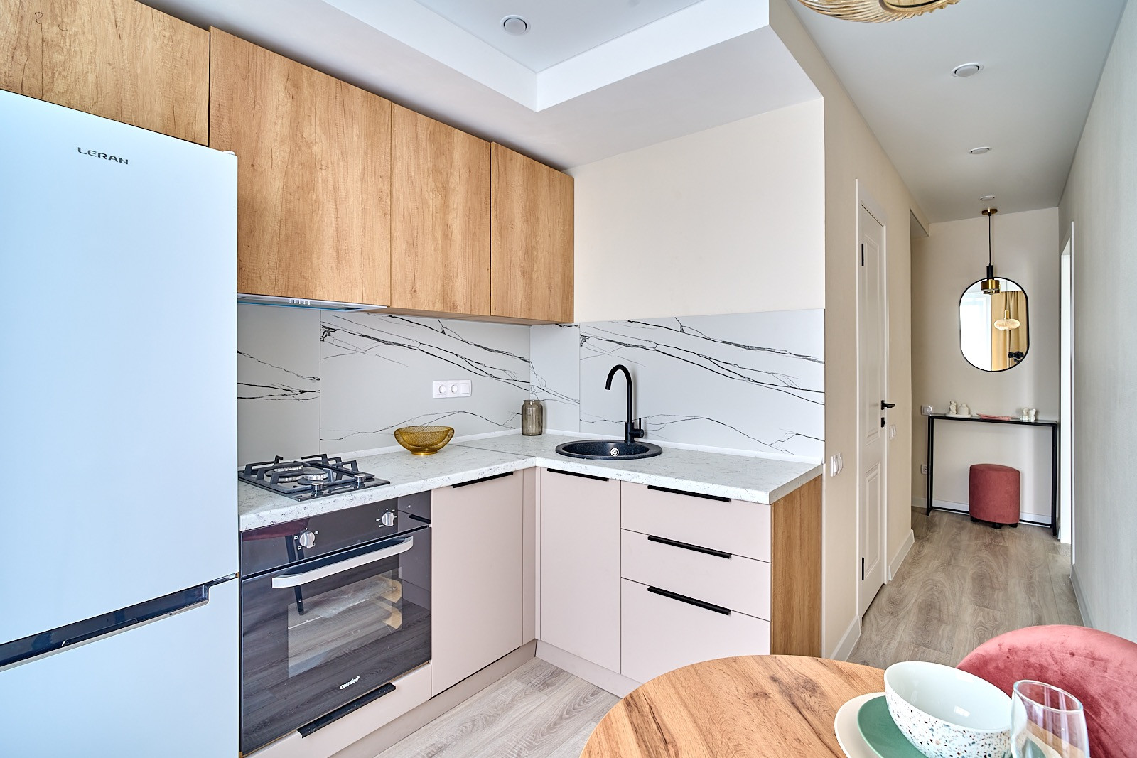 На кухне установлен новый кухонный гарнитур, посудомоечная машина, варочная газовая поверхность, холодильник, духовой шкаф.