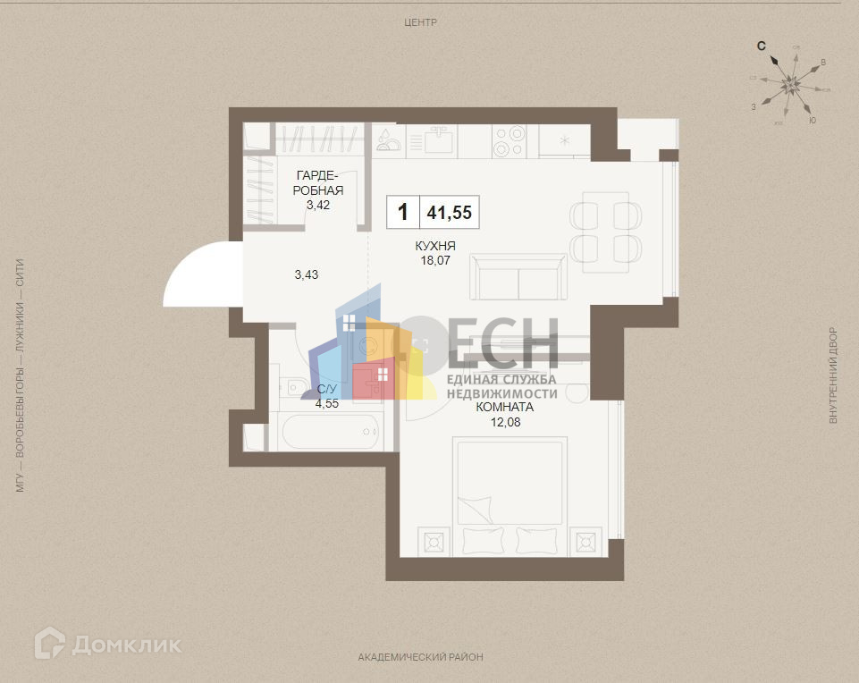 1-комнатная квартира, 41.62 м2, этаж 24 / 75, на продажу в Москве, 5-й Донской проезд, 21к14