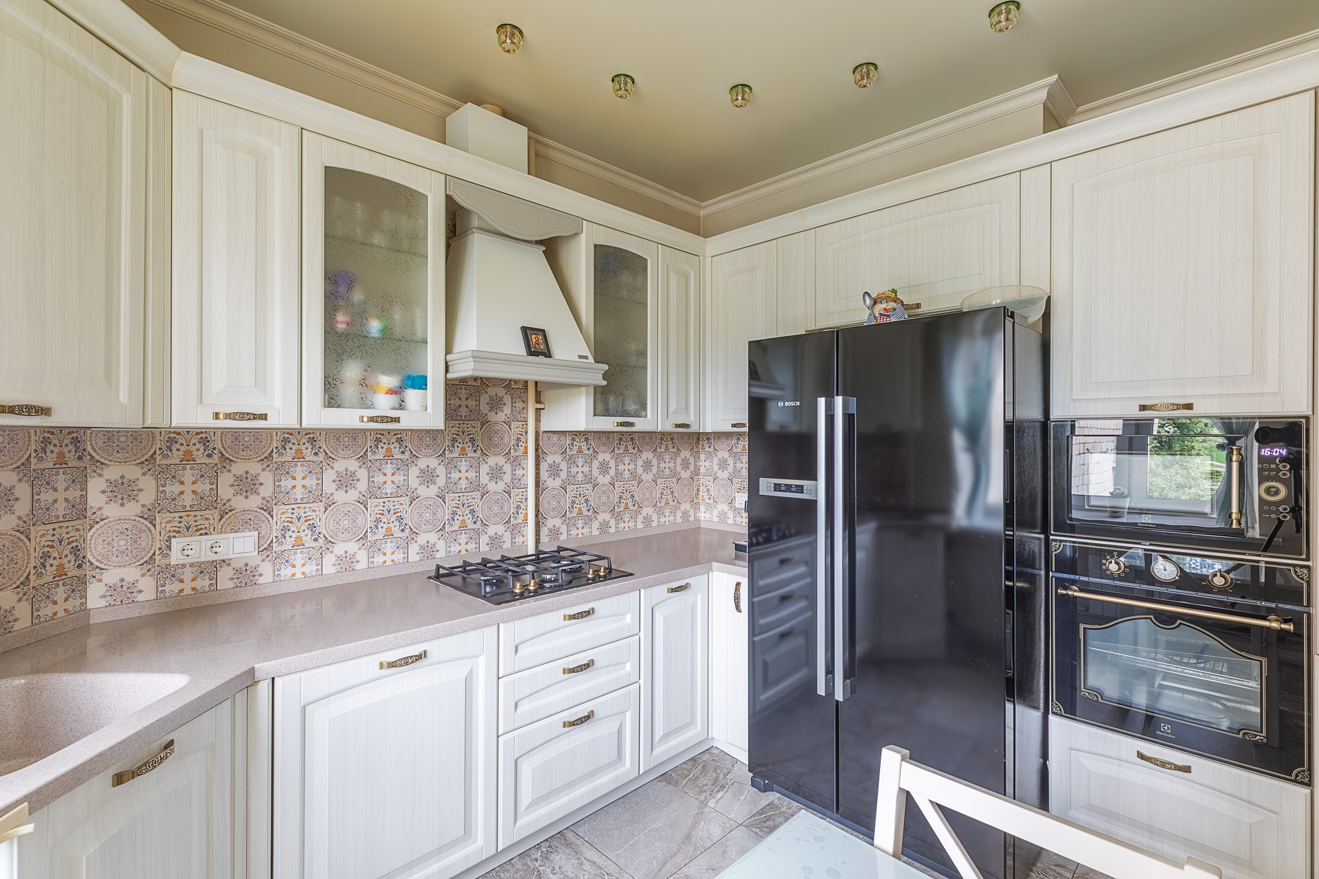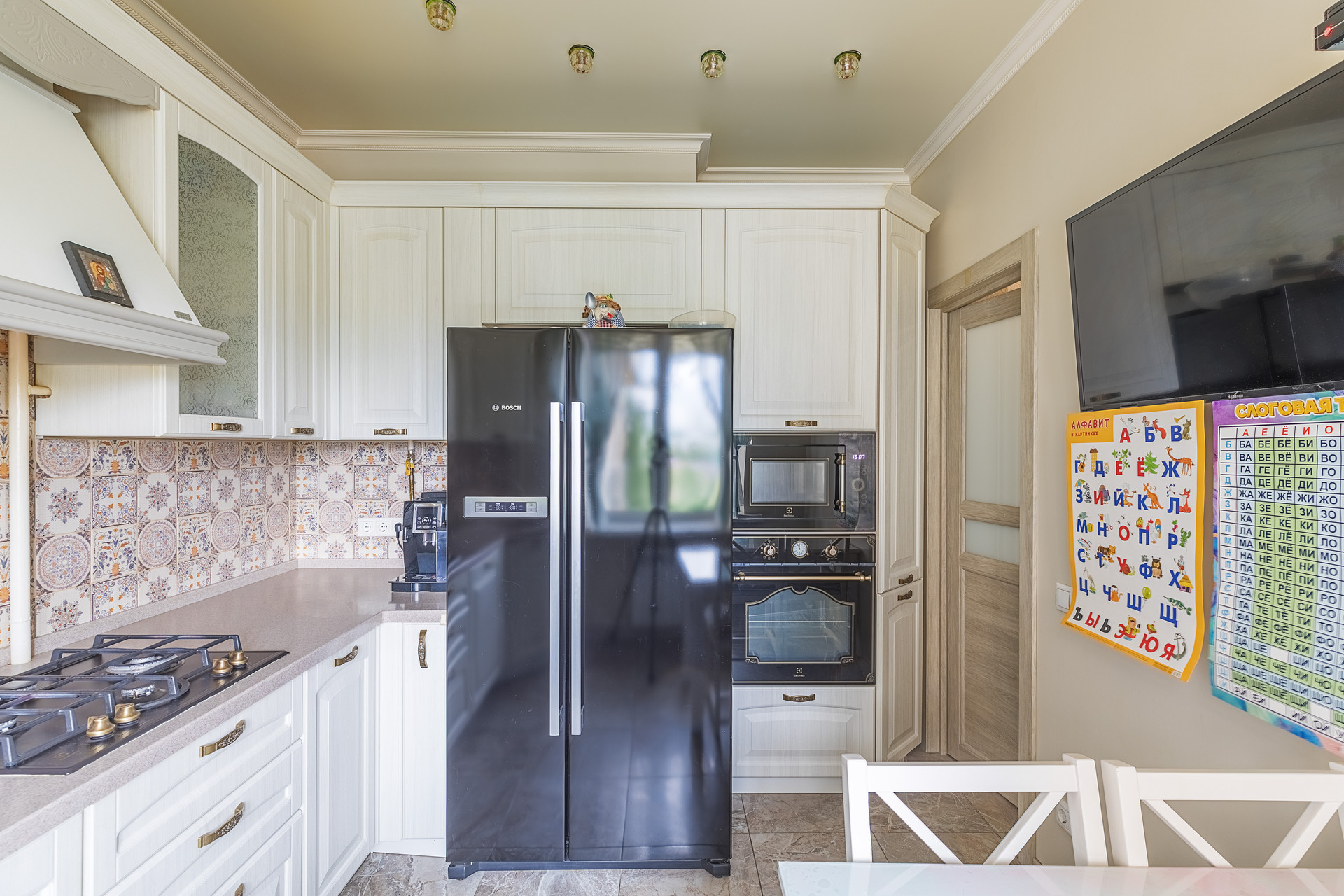 Кухня 9 кв.м., где учтен каждый миллиметр: от двухстворчатого холодильника фирмы BOSCH до встроенной полноразмерной посудомоечной машины ELECTROLUX. Кухня выполнена из массива дуба с доводчиками Blum, столешница индивидуальной формы из натурального камня.