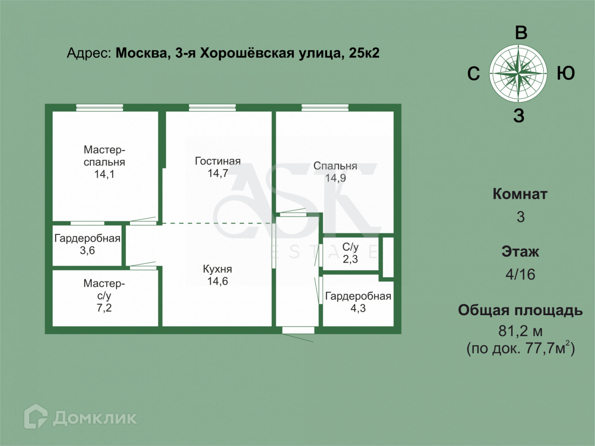 2-комнатная квартира, 77.7 м2, этаж 4 / 15, на продажу в Москве, 3-я Хорошёвская улица, 25к2