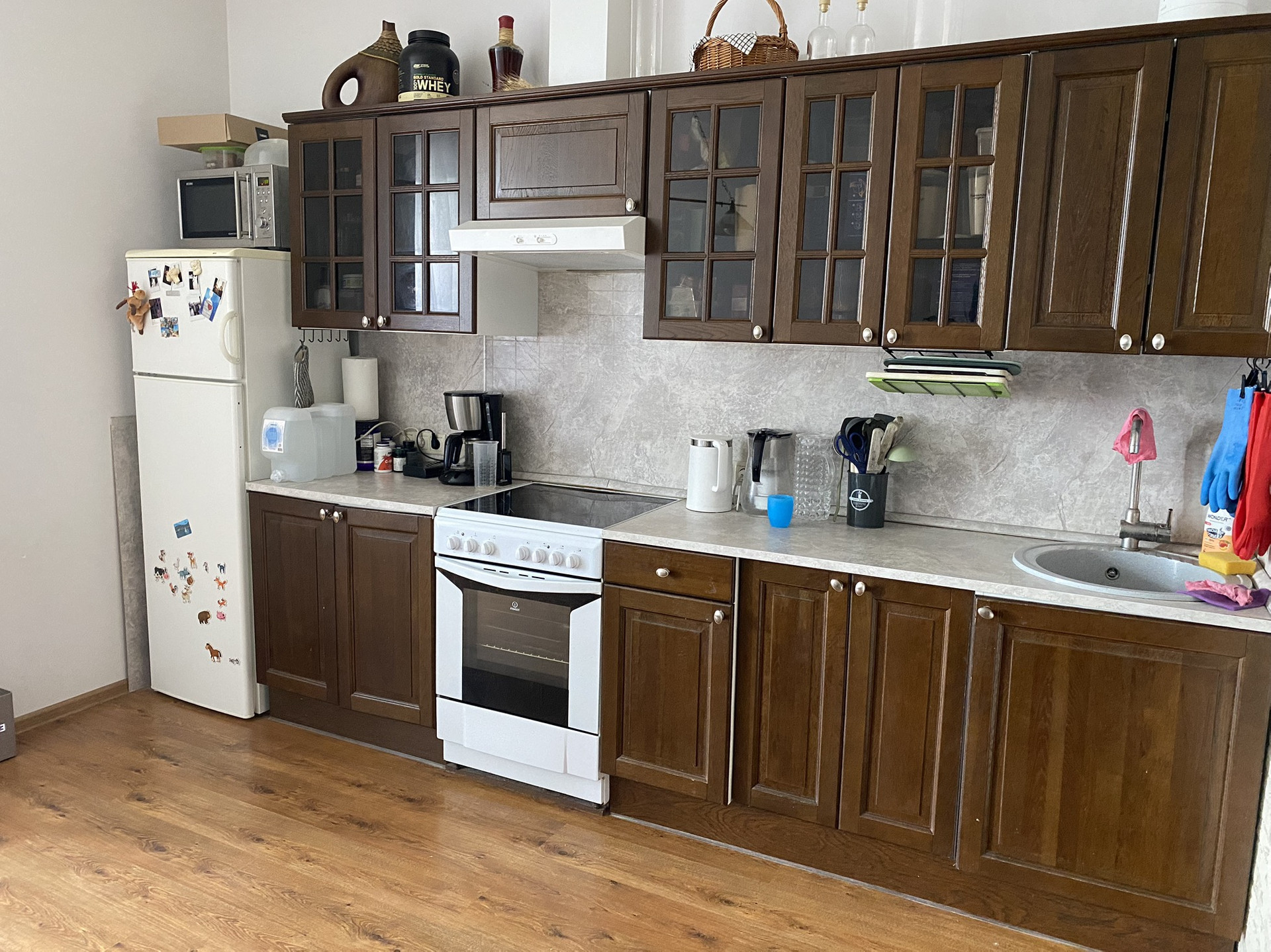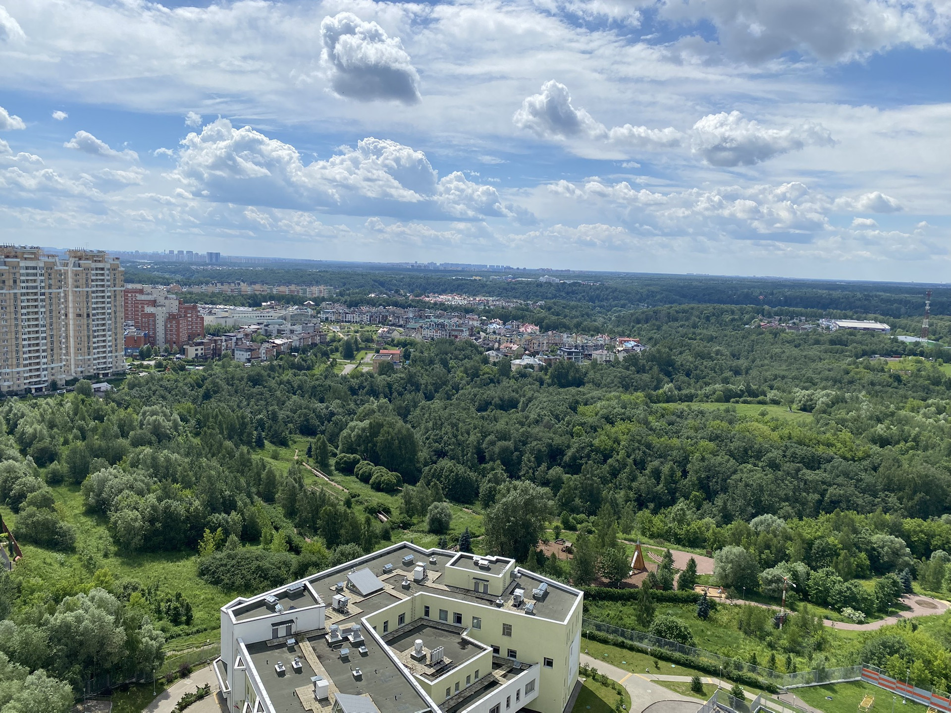 В шаговой доступности Мега, Ашан, Стокман. В доме на первом этаже много разных магазинов, мед центров, химчистка , спорт студии.