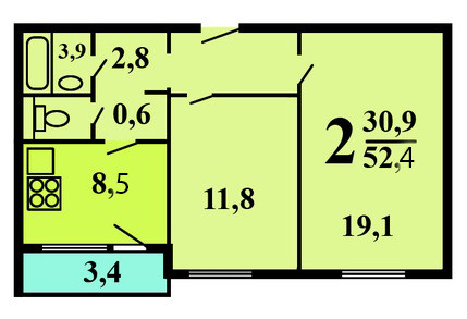 Общая площадь 52.4 м2