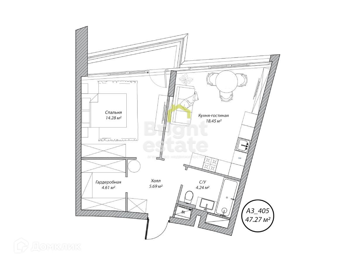 Планировка: прихожая, гардеробная, кухня-гостиная, спальня и с/у.