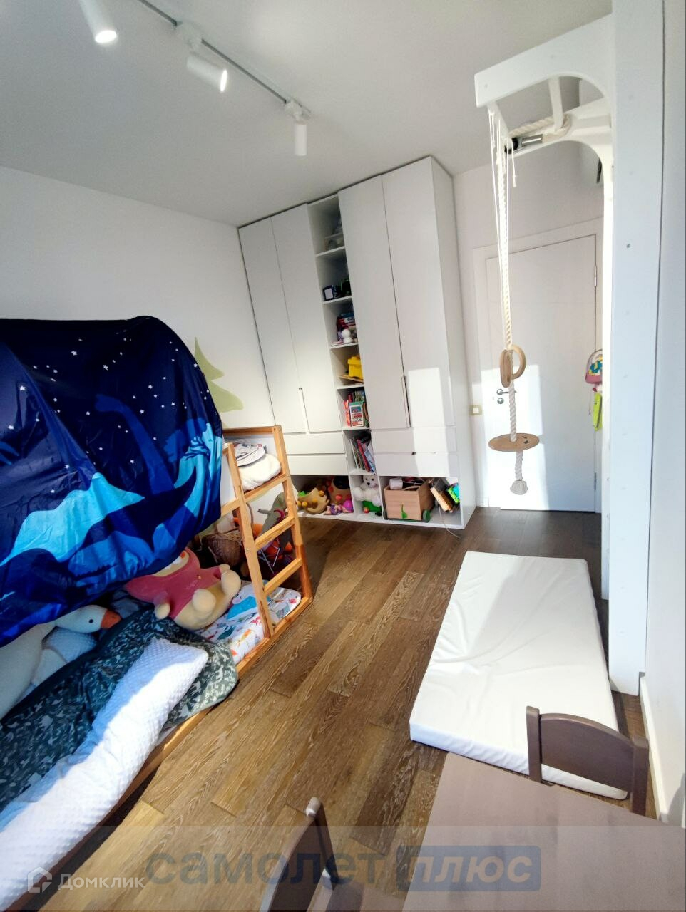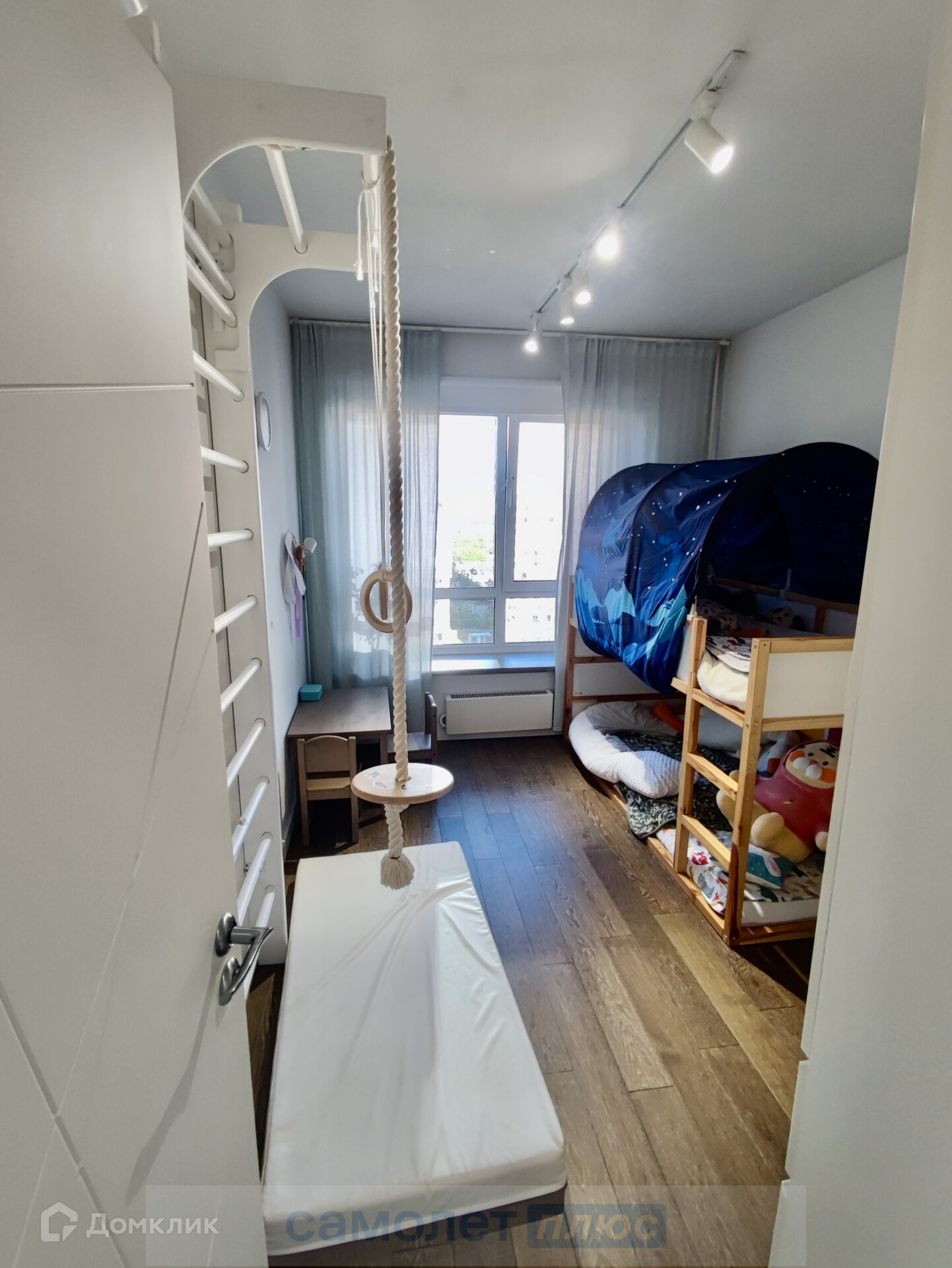 В детской (11м2) установлена кровать 2-х ярусная, шведская стенка, шкаф и рабочая зона.
