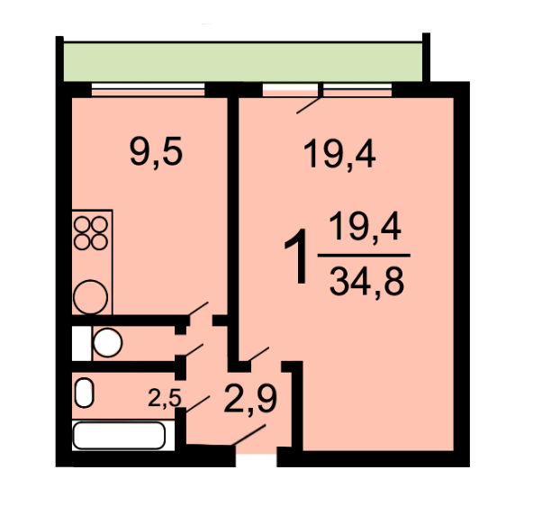 Общая площадь 34.9 м2